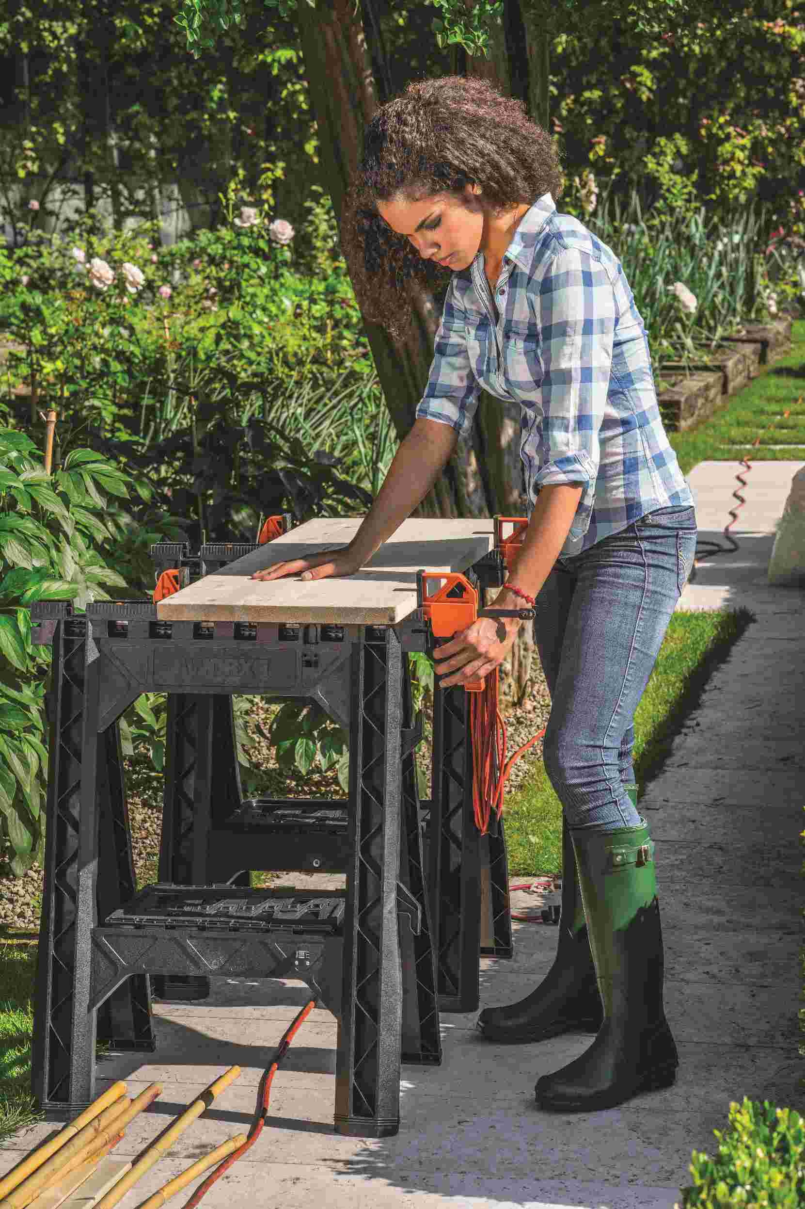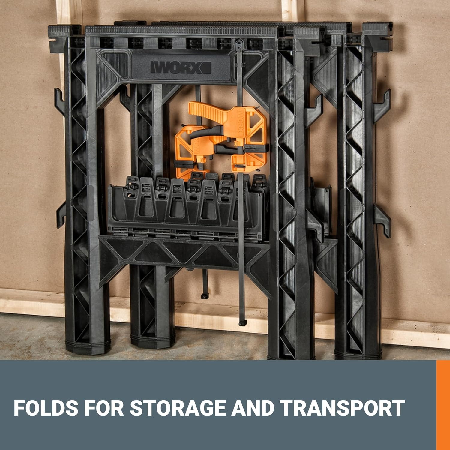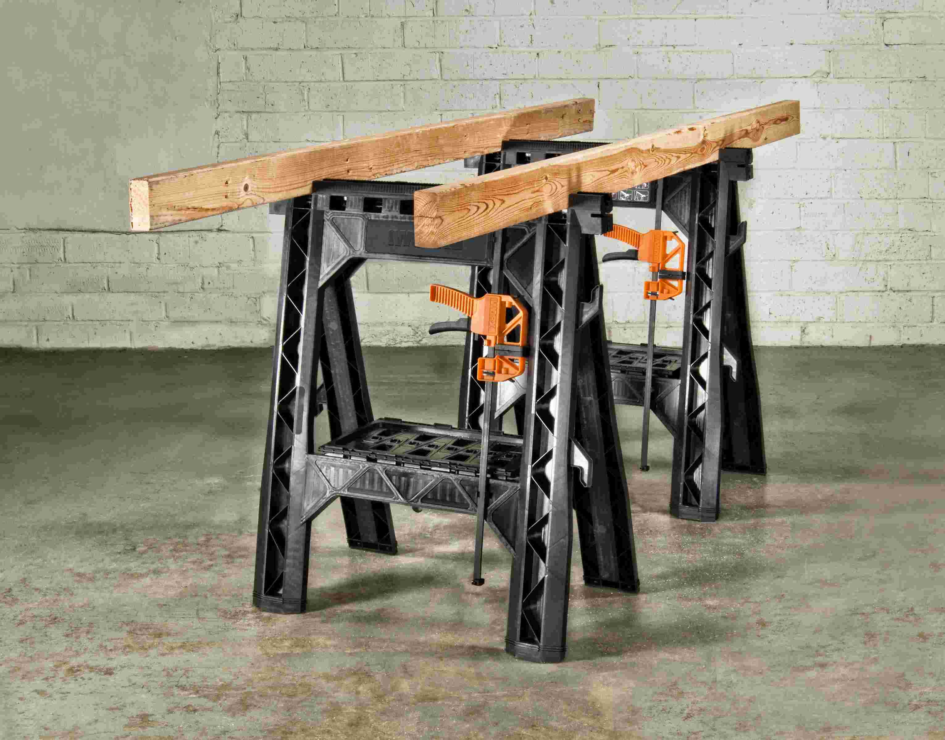 [CUSTOM MADE CLAMPS] These two sawhorses come with integrated bar clamps to fasten big or small projects securely in both vertical and horizontal positions [LIGHTWEIGHT & EASY TO MOVE] At only 4 lbs. each, you can toss them into the back of a vehicle or store them in the corner in-between projects [SUPPORTS 1000 LBS] And the clamps provide up to 300 lbs. of pressure. Hold heavy projects securely in place for as long as you need [STORAGE SHELF] On the bottom of these sawhorses we’ve made a place to hold a power strip or supplies. Give your workspace an extra shelf or more storage [DO IT YOURSELF. DO IT BETTER. DO IT WITH WORX.] WORX tools are engineered with cutting-edge technology, and above modern efficiency standards, so you can build a cost-effective tool collection that’s been designed to last [AFFORDABLE] The clamps act like a second pair of very strong hands, so you can work on large projects all by yourself [USEFUL CLAMPS] The bar clamps detach, so if you have a project on another workspace, you can take that 300 lbs. of pressure wherever it’s needed [ABS & STEEL] The sawhorses themselves are made from rugged, molded ABS, and the clamps are ABS and steel. That’s why they can support and squeeze so much