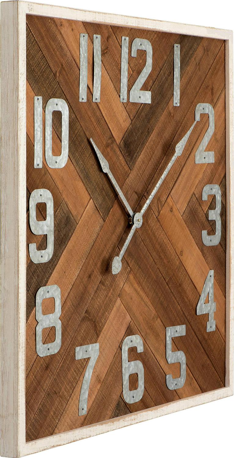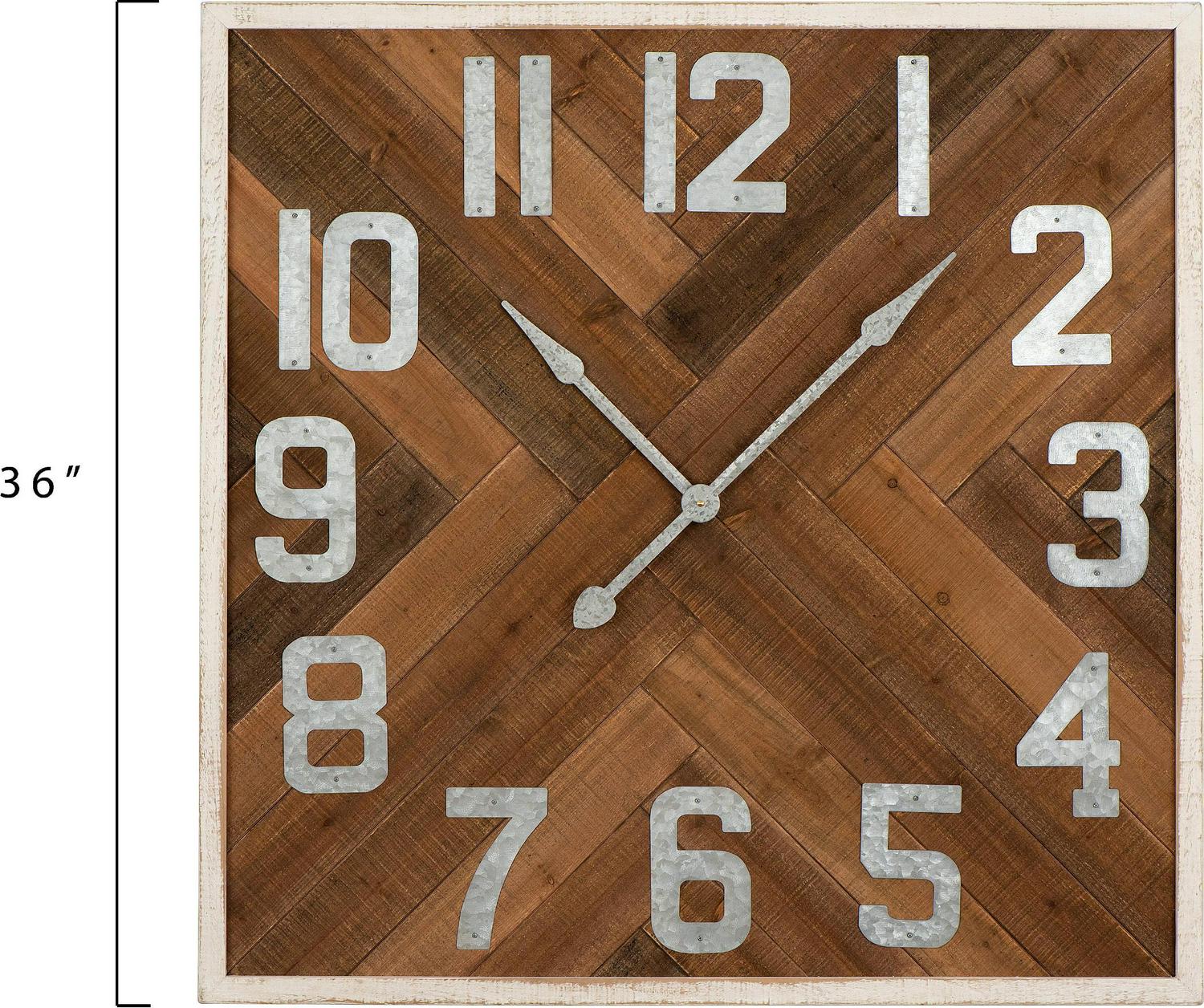 Featuring metal cut numbers over a gorgeous wood face, this Woven Paths Square Stained Wood Wall Clock shows creative individuality. Each number is cut to perfection and attached with matching metal screws. Adding even more character is a combination of light and dark wood pieces to create designs within the face of the clock. For the person who appreciates unique creations, this is a must for their home or office.