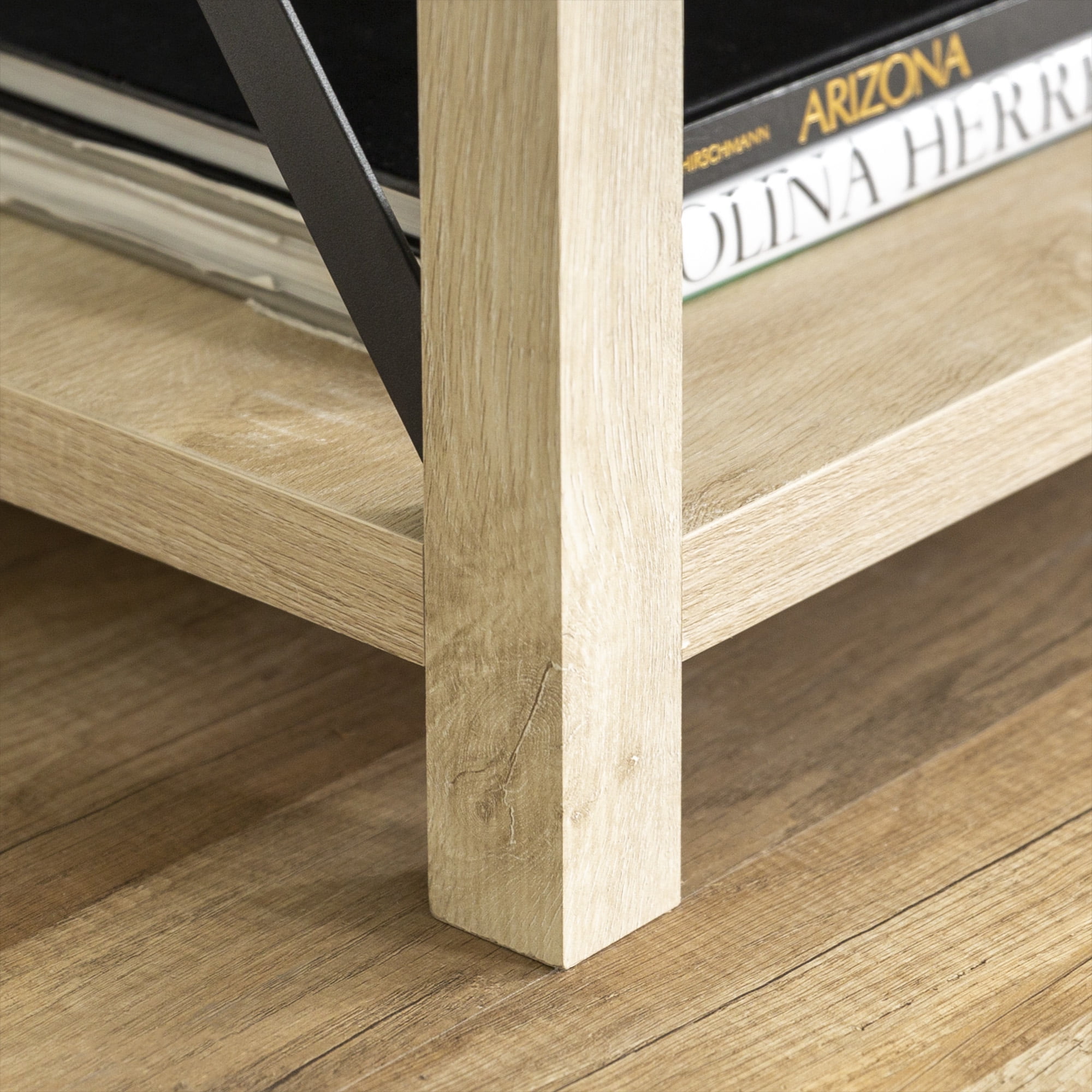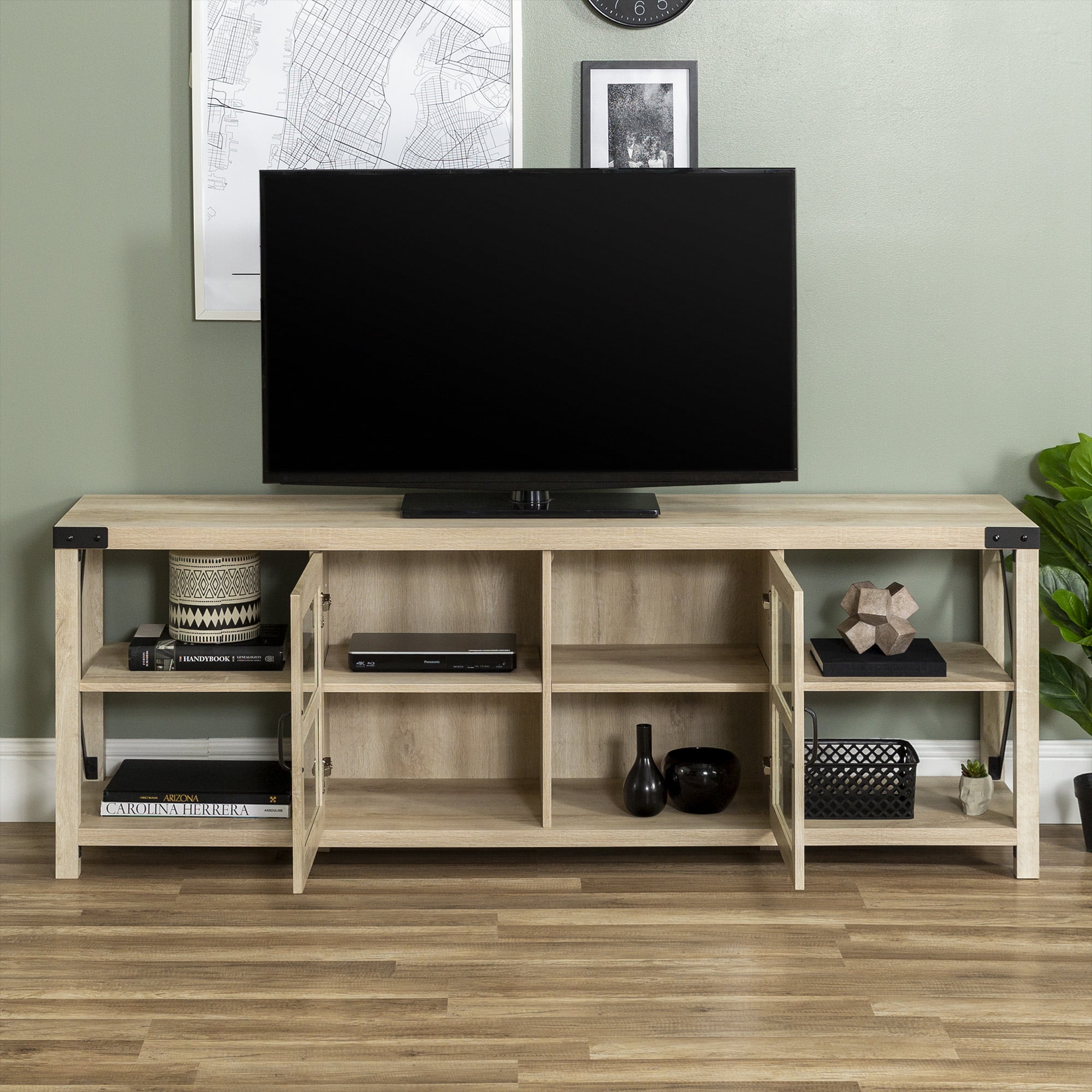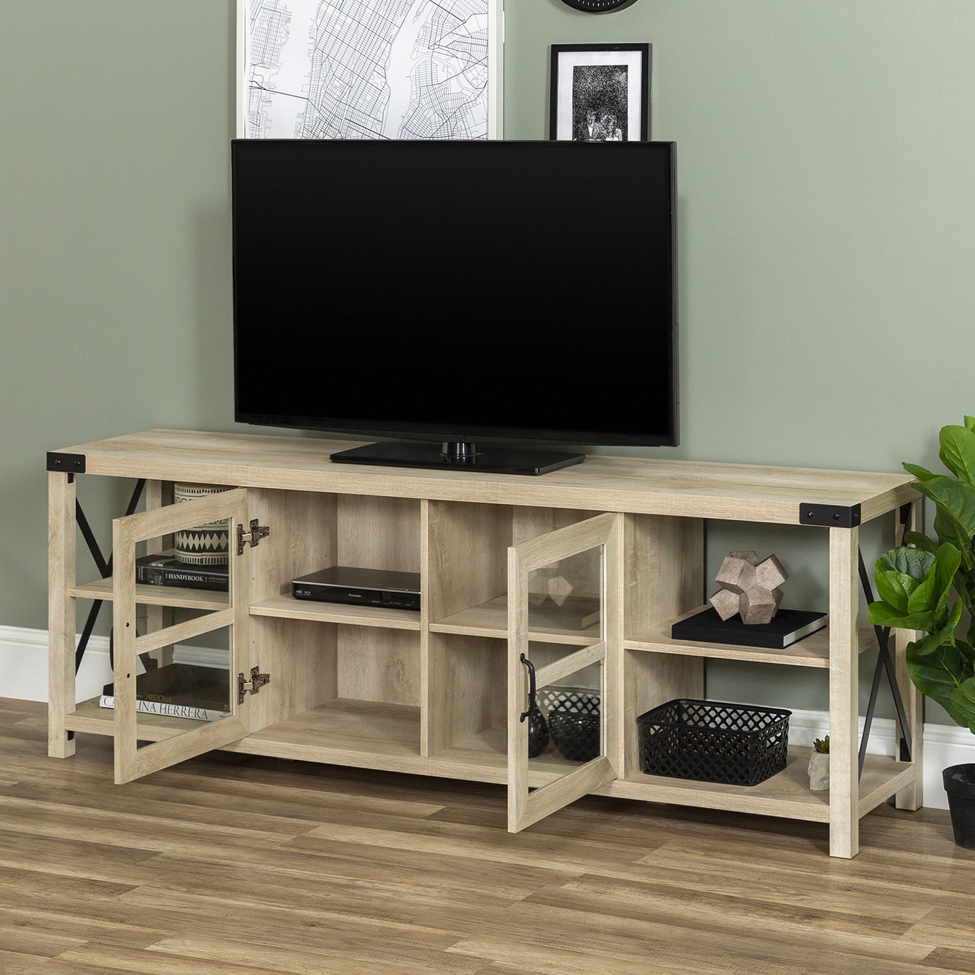 Woven Paths Farmhouse 2-Door Metal X TV Stand for TVs up to 80″, White Oak: Industrial-farmhouse-style TV stand with soft-close hinges Open and closed storage options 2 tempered glass doors Perfect for living rooms, bedrooms, offices, or media rooms Includes cord management options Dimensions: 25″H x 70″L x 16″W Supports up to 250 lbs Pair with other items from the Woven Paths collection