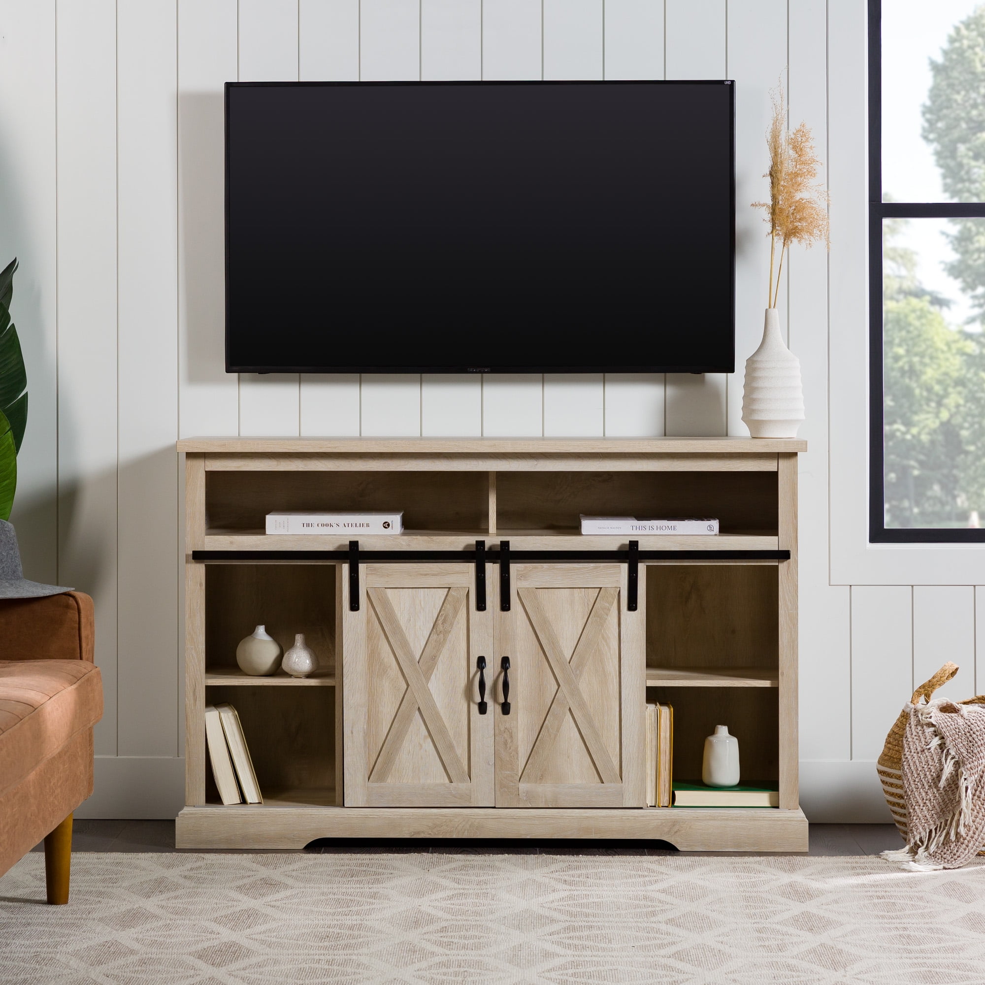Woven Paths Farmhouse Barn Door TV Stand for TVs up to 58″, White Oak: Featuring a modern and traditional farmhouse style Made of high-grade MDF, durable laminate, and painted metal Can accommodate up to a 58″ TV Functional sliding barn door fronts Cord management options Adjustable shelves Open and closed storage