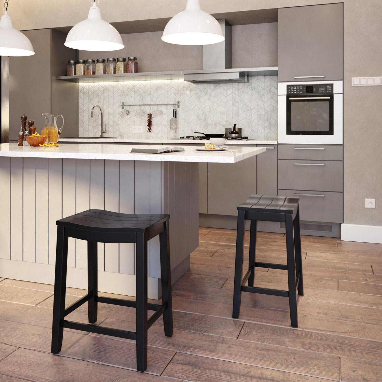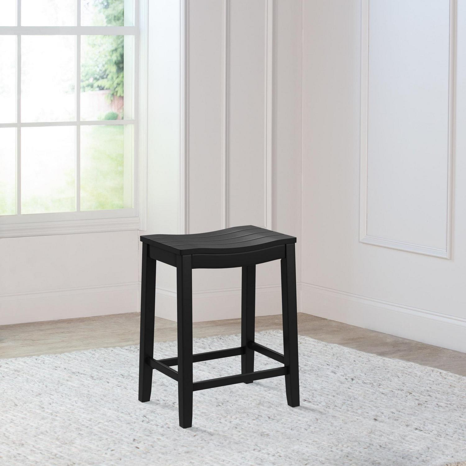 The Woven Paths Fiddler Backless Wood Counter Height Stool embodies coastal charm with a farmhouse flair. Our versatile backless counter height saddle stool has a wide wood shiplap saddle seat, perfectly curved for added comfort, and easily fits under kitchen islands or counter height spaces. The neutral black finish creates a stylish focal point for your dining space and is an easy addition to any decor. Durable wood flared legs add extra support and are complemented by perfectly a placed footrest adding an extra layer of comfort while eating, entertaining or working. Assembly is required. Add a farmhouse feel to any room with the Woven Paths Fiddler Backless Wood Counter Height Stool.