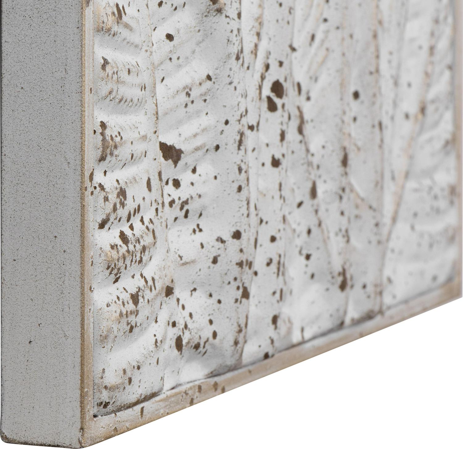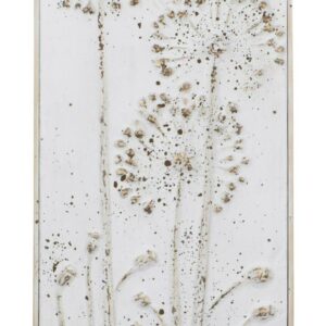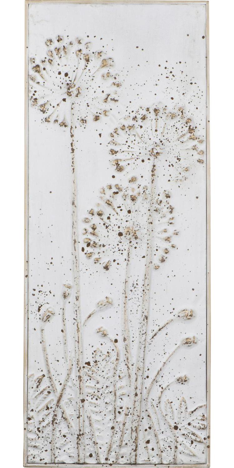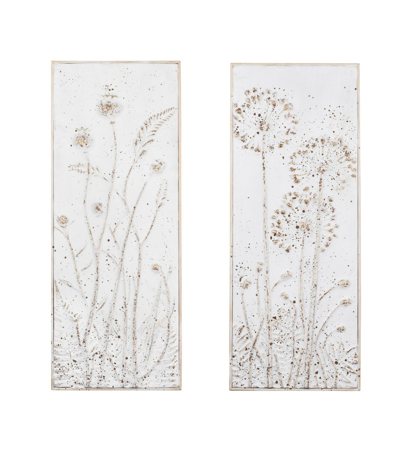 Flowers rise from the surface of the metal 3R Studios Metal Wall Decor with Flowers – Set of 2, making an elegant statement. The two relief sculptures bear a heavily distressed white finish for an aged appearance and are rigged with keyhole hardware for hanging purposes.