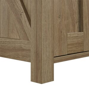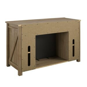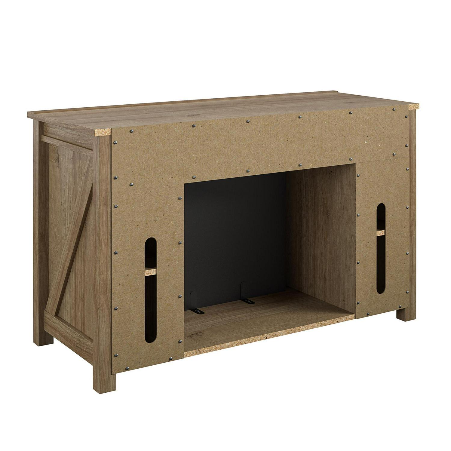 – Bring the outdoors in with the rustic look of the Scandi Farmhouse Electric Fireplace TV console finished in a textured light brown woodgrain with a weathered look