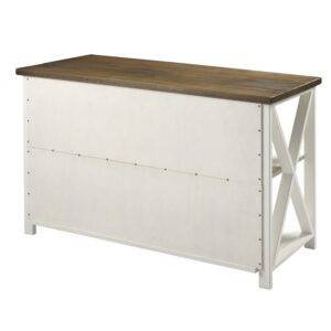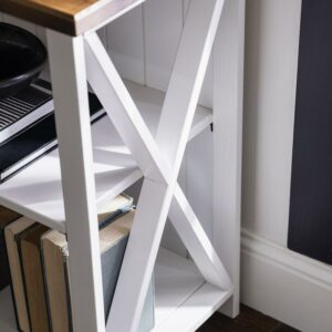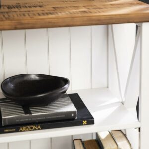 Your new perfect spot for books and bouquets is this charming farmhouse storage console. A grooved, beadboard backer and X sides cater to your cozy country aesthetic. Its inviting design fits right in as a bookcase in the home office or a sofa table in the living room. One fixed, open shelf inside the console steadily supports trinkets, holiday decor, or office supplies. The solid wood build is responsibly harvested from renewable forests, so you can decorate in good conscience.