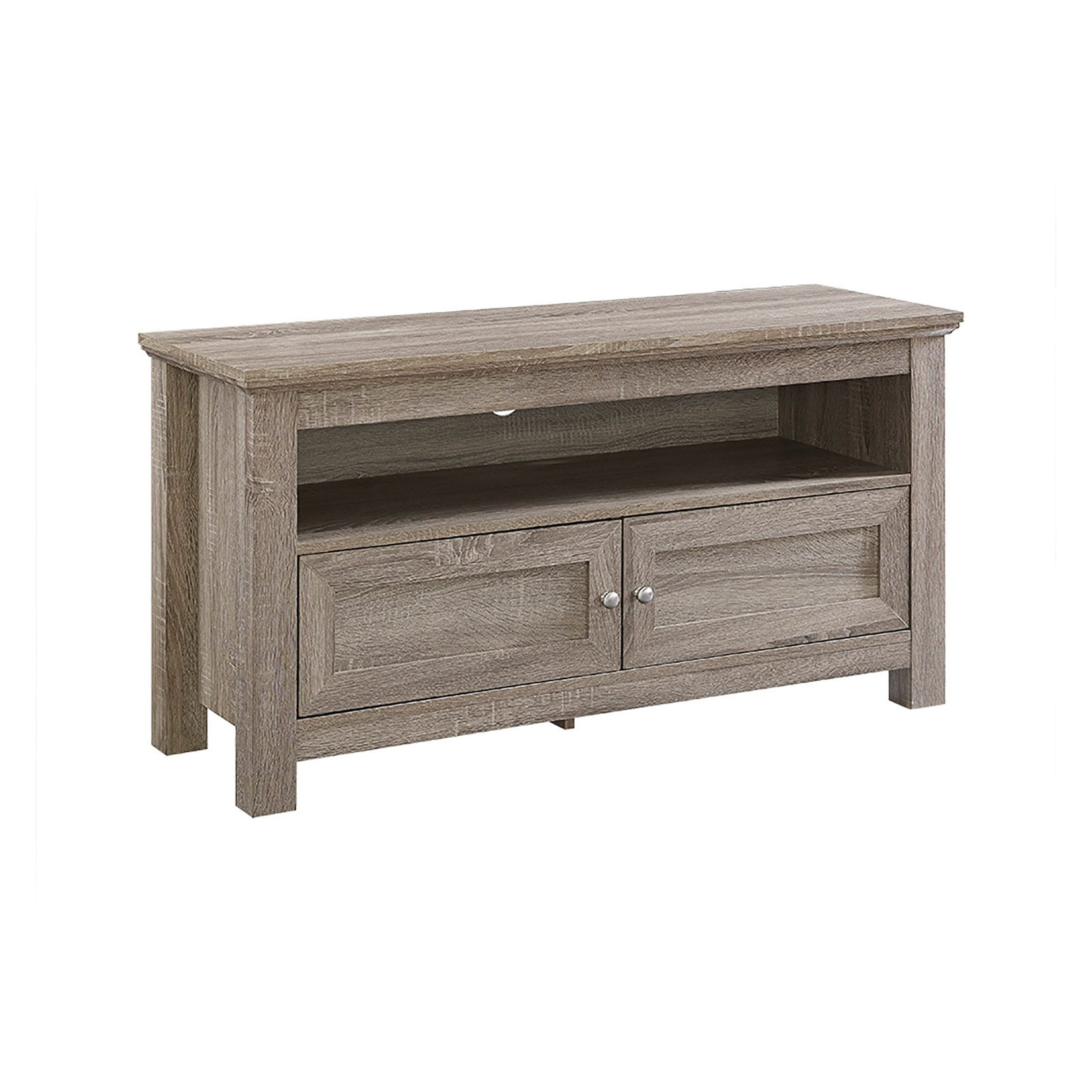 Woven Paths Transitional TV Stand for TVs up to 48″, Driftwood: Transitional design style to complement your current home decor Solid and sturdy construction can support up to 250 pounds Accommodates TVs up to 48″ With an open shelf and double door storage Perfect for your living room, bedroom, or home office for added storage space