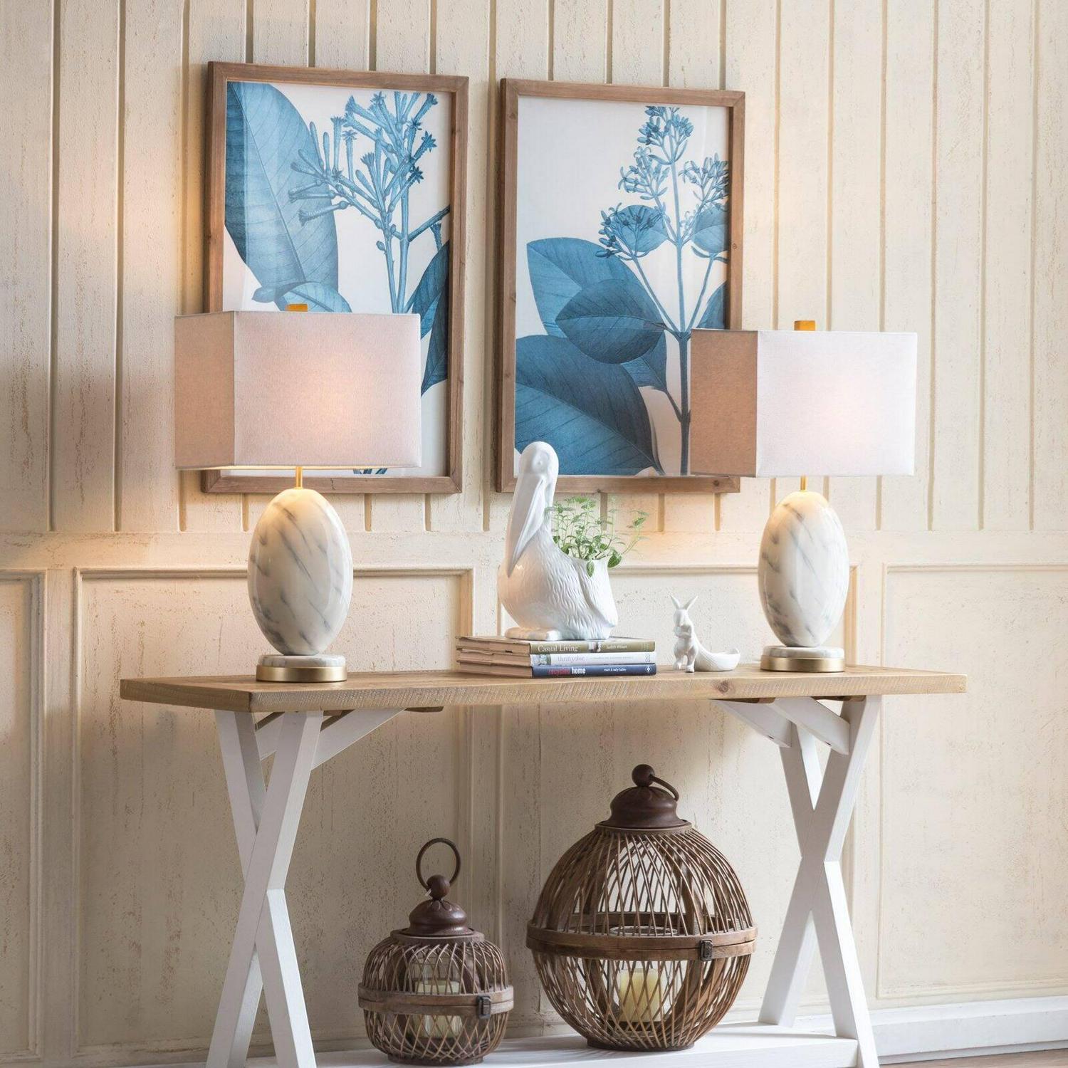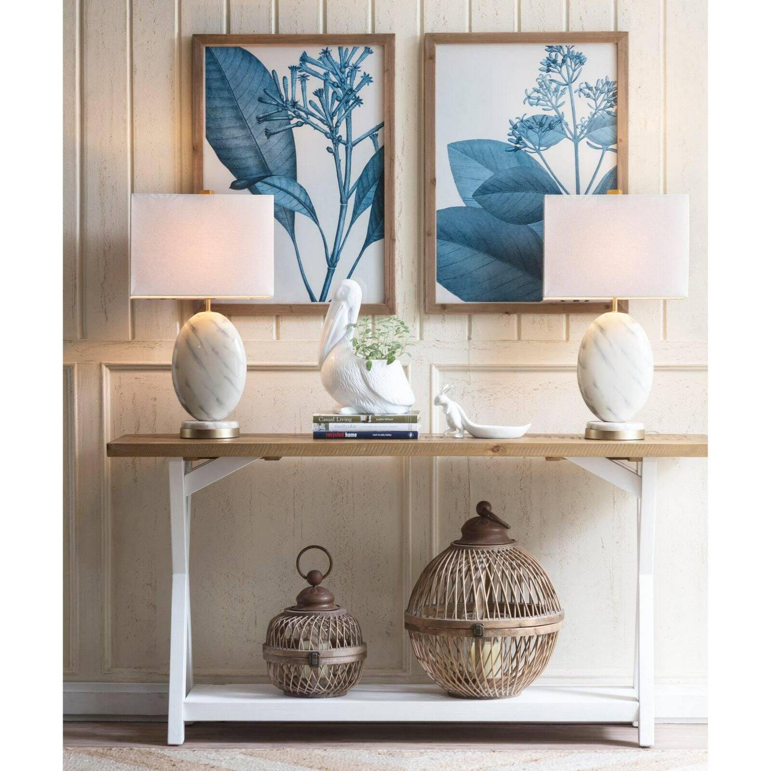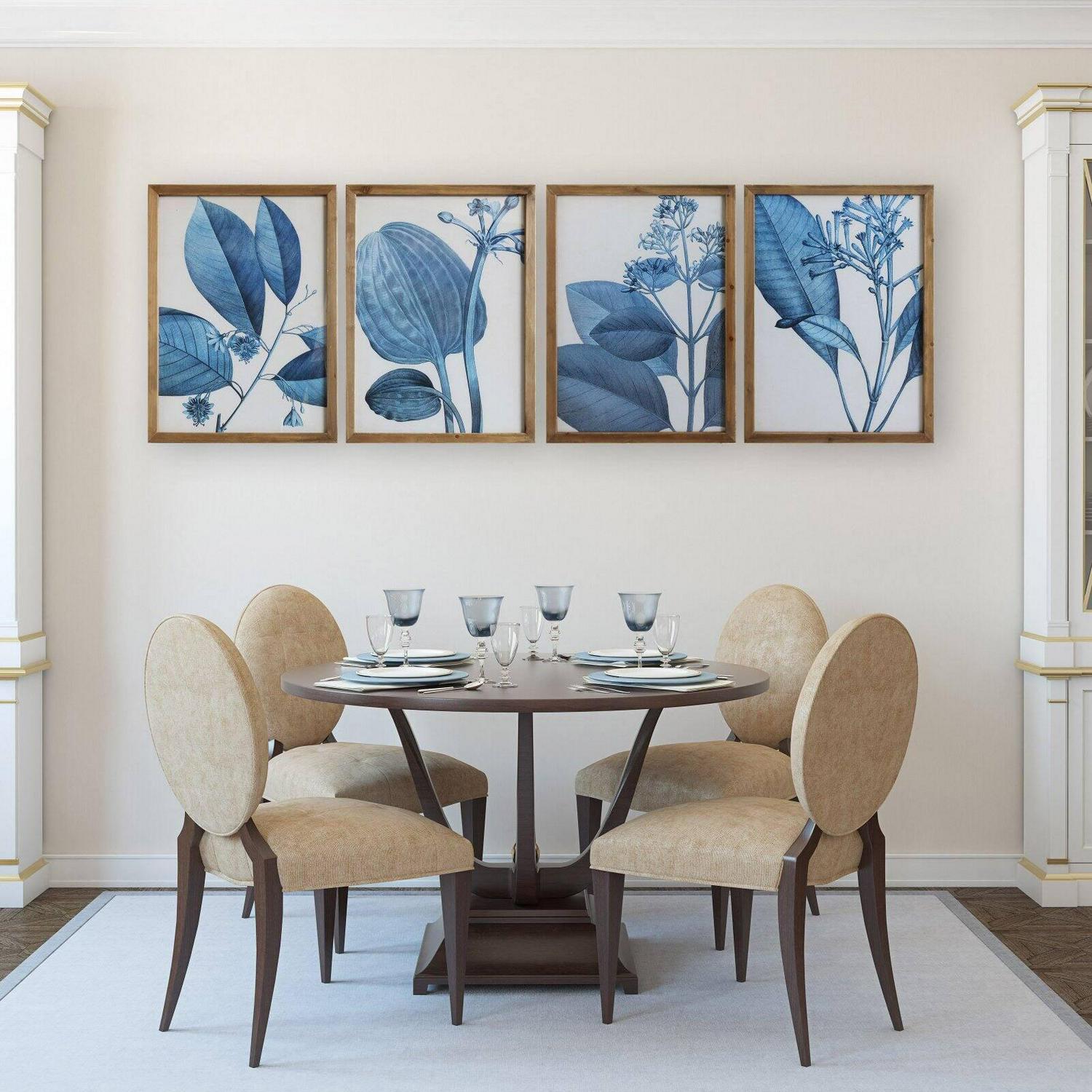 This set of wall decor each feature a different blue botanical image. They are each in a wood frame. Hang them together in a grouping or in different locations around your room to help tie the space together.