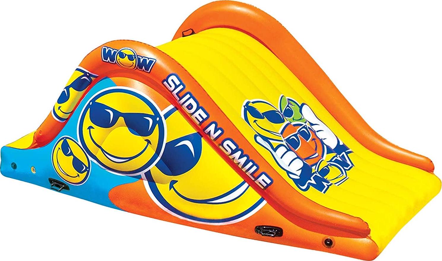 – Giant Pool Slide: WOW Sports’ Giant Smiley Floating Water Slide is a 2 lane water slide with HI-VIS graphics. It s a giant pool slide that can make a great dock as well..Assembly Required: NO