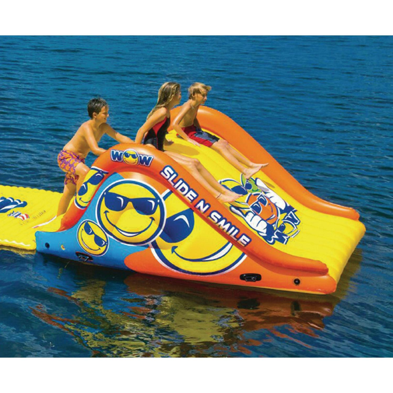 – Personal Water Playground: WOW Sports Giant Smiley floating water slide has a zippered connection system for connecting with WOW Sports 10.6 water walk away or 6 .6 water way so that you can build your own WOW water world playground.