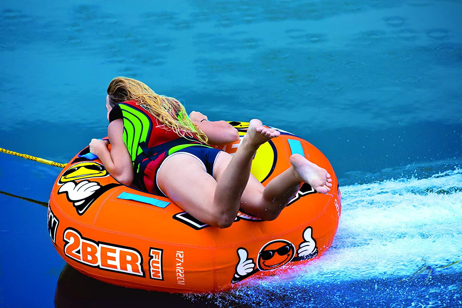 Can’t go wrong with a classic 1 rider tube! Millions have been sold over the years. The 54” round tube is a great beginner tube for those new to towables So WOW has decided to provide everything you need to get started, well… except for the boat. Blow it up with the fast 12V DC pump and tow it with a WOW 1K 60’ tow rope Makes for a great gift for those just getting started or someone growing their collection! Features – 1 Rider Towable 170 lbs or 77 kg maximum capacity – Heavy Duty partial nylon cover Heavy-Gauge PVC bladder – Double webbing foam handles with knuckle guards – Flat foam handles – Reinforced towing system – Speed valve for fast inflation and deflation Zippered valve cover – Heavy-Duty arrow shape construction for stability and more control for the rider – Includes 12V DC Pump – Includes 1K 60’ Tow Rope – Dimensions Inflated 50 x 48 IN
