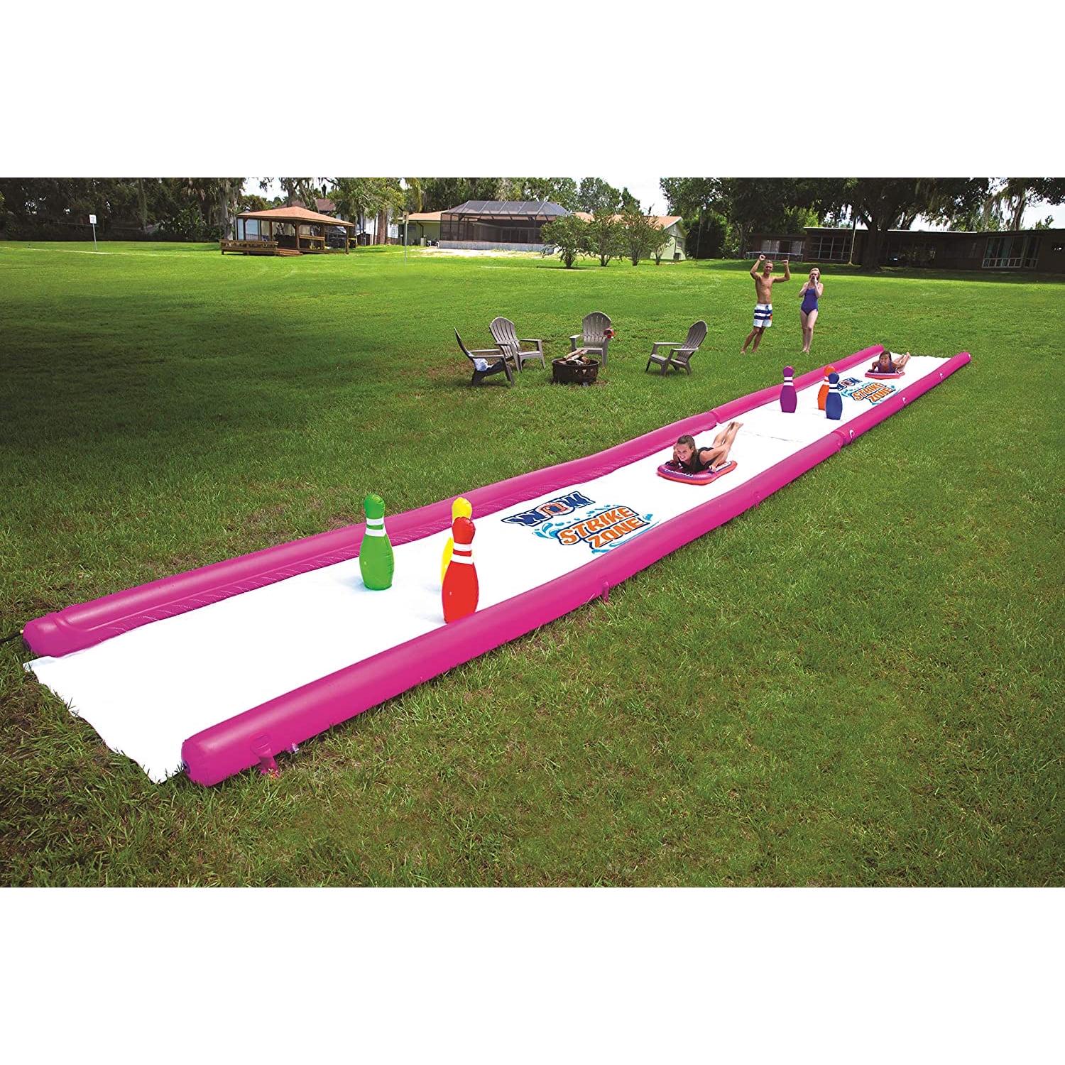 WOW Sports Giant 25 Foot Water Slide with Inflatable Pins and Sleds is the perfect addition to your kids backyard games! The WOW Strike Zone is a giant 25 x 6 water slide for the lawn that will keep the kids entertained all day long. The pool slide is made from extra thick, heavy-duty, super-slick embossed PVC. In fact, it is more than twice as thick as most of the slides you will find in the market and backed by a 1-year warranty. Our zig-zag patterned, 25 embedded sprinkler system connects to the standard backyard hose, runs the length of the slide and has 100% water coverage so no dry spots. We also installed sidewall pontoons to keep the water (and the riders! ) on the slide and out of the gutter! That s not even the best part this slide comes with inflatable pins! You read that right, your already cool water slide just turned into a giant bowling alley in your backyard! Each slide comes with 2 inflatable sleds to cushion the fall and make the slide even more slippery. Riders slide down and burst through the pins like a champion!