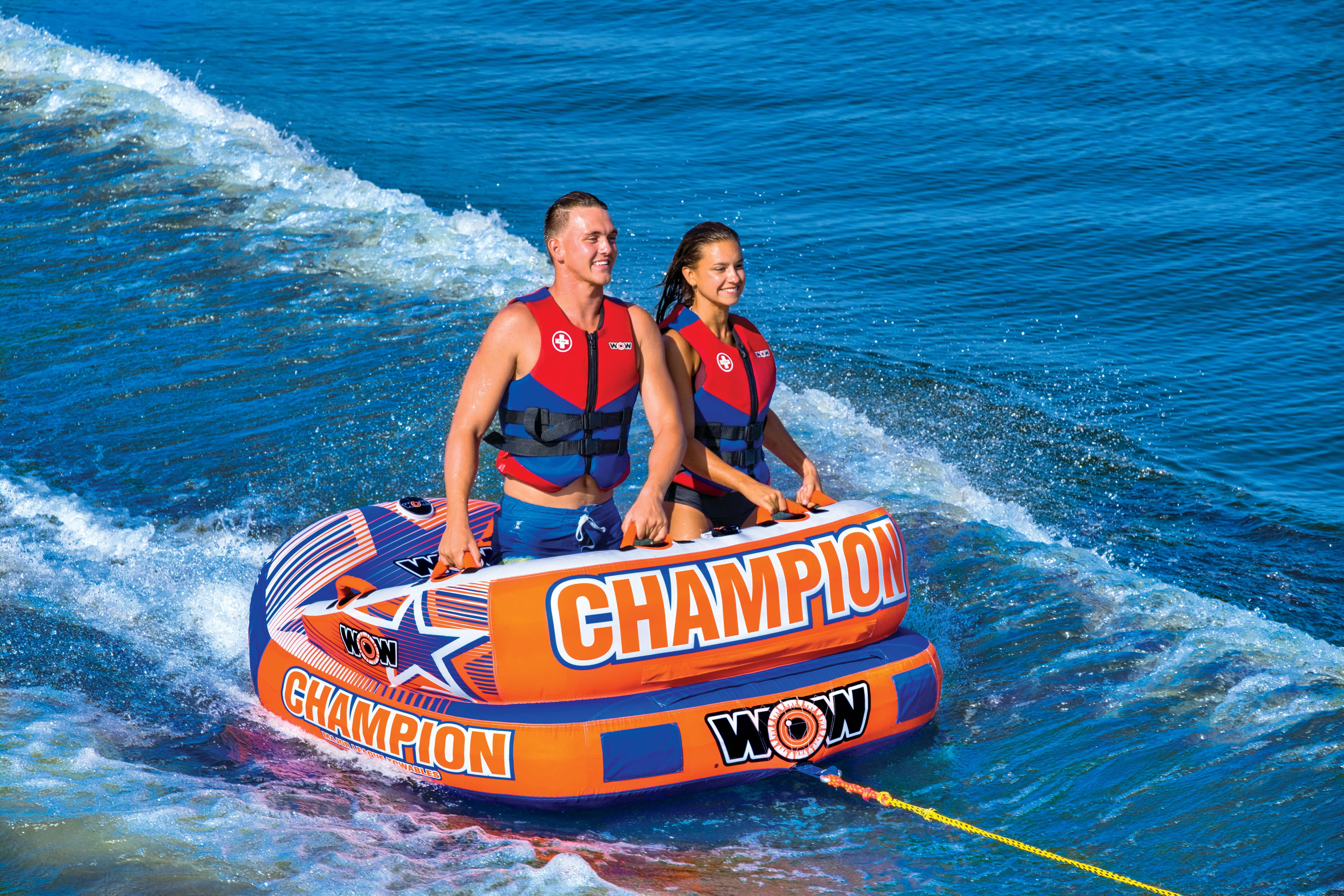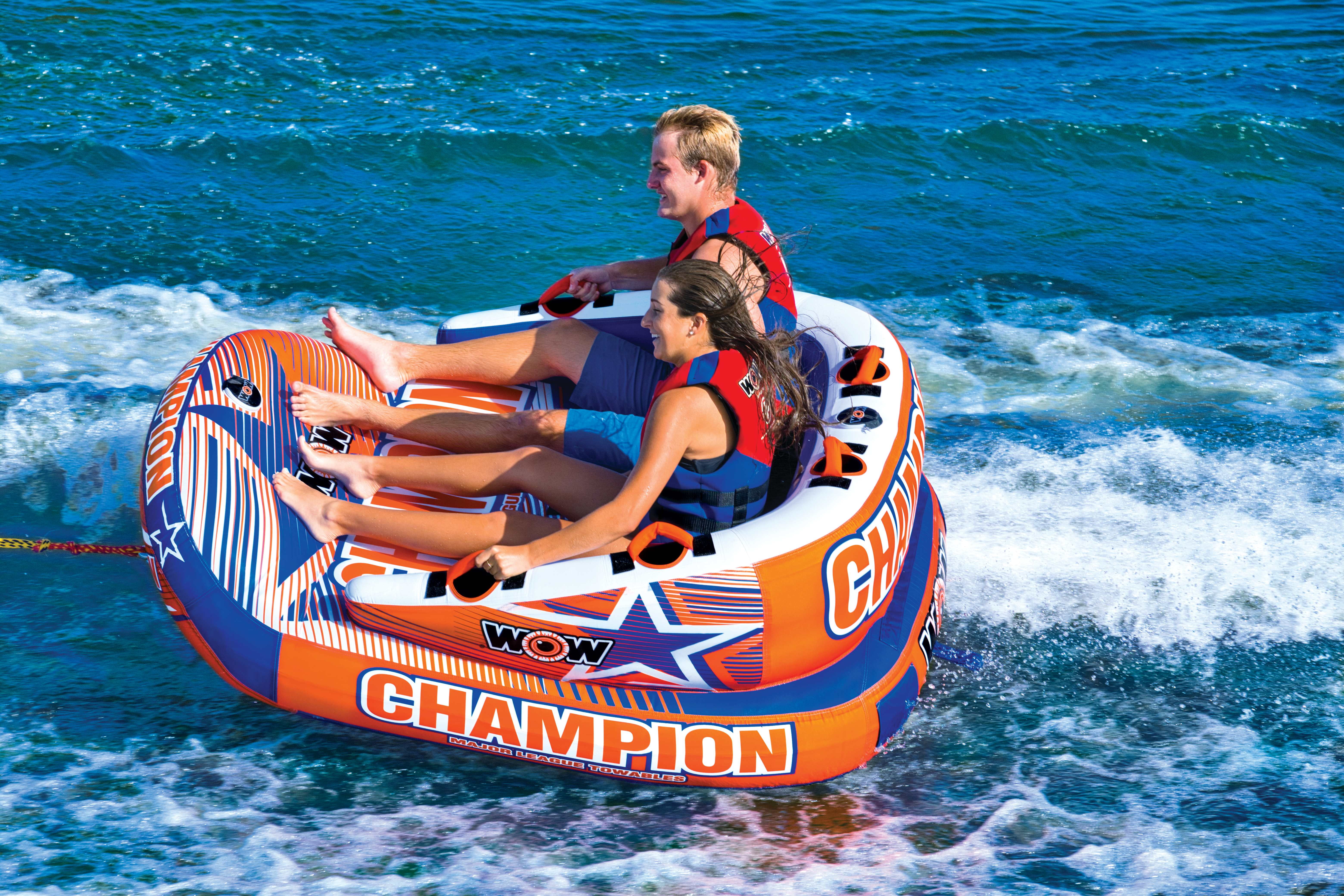 The Champion is a towable that has been designed to fit like a glove. The EZ-Up Nose on the Champion allows for minimal drag, making takeoffs a breeze, a footrest for lounging or a spray blocker for the riders while in action. Ride sitting, laying down, or kneeling chariot style; EVA foam seat and knee pads; 8 Double webbing foam handles; Great floating couch for relaxing after your ride; Heavy-duty PVC bladder and nylon cover; Speed valve for fast inflation and deflation; Zippered valve cover; 1-year warranty