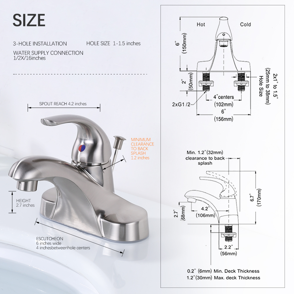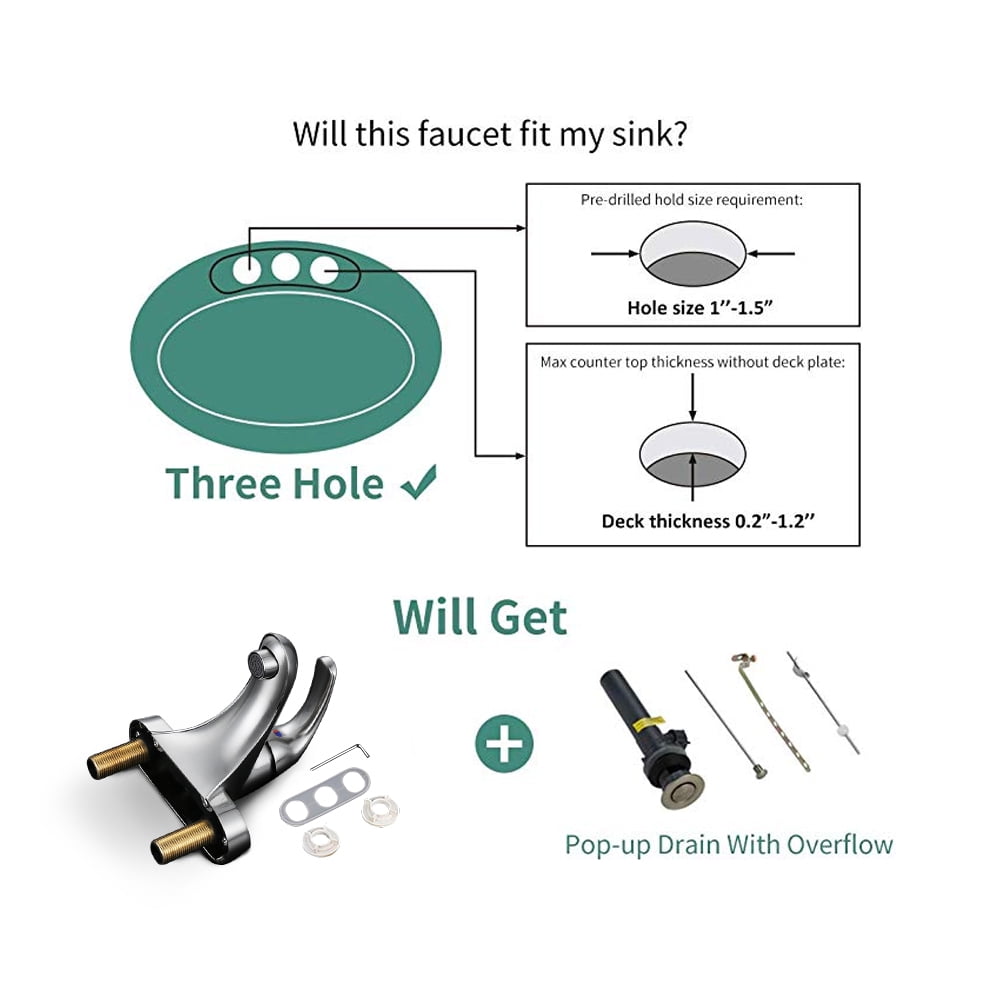 This bathroom sink faucet is produced from zinc alloy, hand polished, textured and finished using state of the art technology for timeless beauty and durability. Easy DIY Installation Design Assembly component design, easy DIY installation; Designed for 3 Holes 4 Inch Centerset Installation,the distance between the center of handle hole is 4 inch