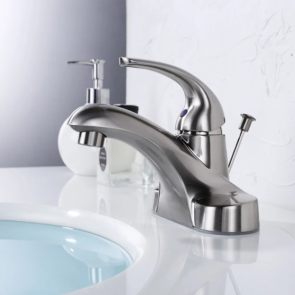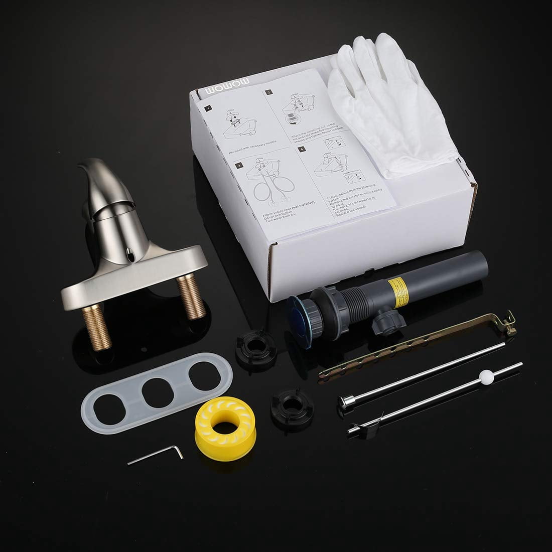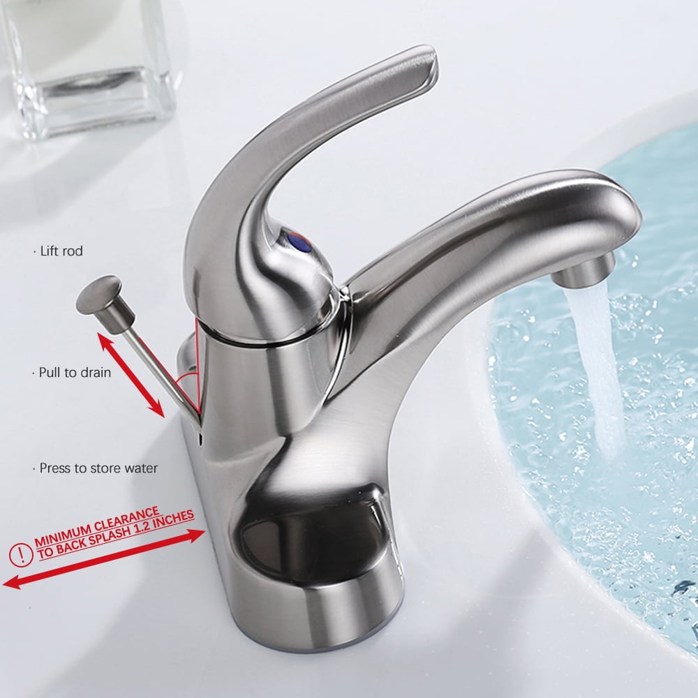 【4-inch Bathroom Faucet】Single handle bathroom faucets fit standard 4-Inch installation. Classic faucet comes with lift rod and pop-up stopper. 【Material of Bathroom Faucet】 Zinc alloy / Stainless steel; Surface: Brushed nickel and finger print free finish can resist corrosion. 【Easy Control of Water Temperature】The handle of the sink faucet is very easy to move back-and-forth up-and-down. Easy to control water volume and water temperature. Fast, tool-free installation lavatory faucet, 1.2-inch maximum mounting depth. 【Lift Rod Drain Assembly】The bathroom faucet brushed nickel comes with a metal drain assembly, water comes out of the faucet sink through pressing down the lift rod, avoiding mucking up your washed hands. Supply Lines Sold Separately. 【High Quality and Craft】ABS aerator save 50% water and anti-splatter, which can be taken down directly with your hands to clean (no need tools).