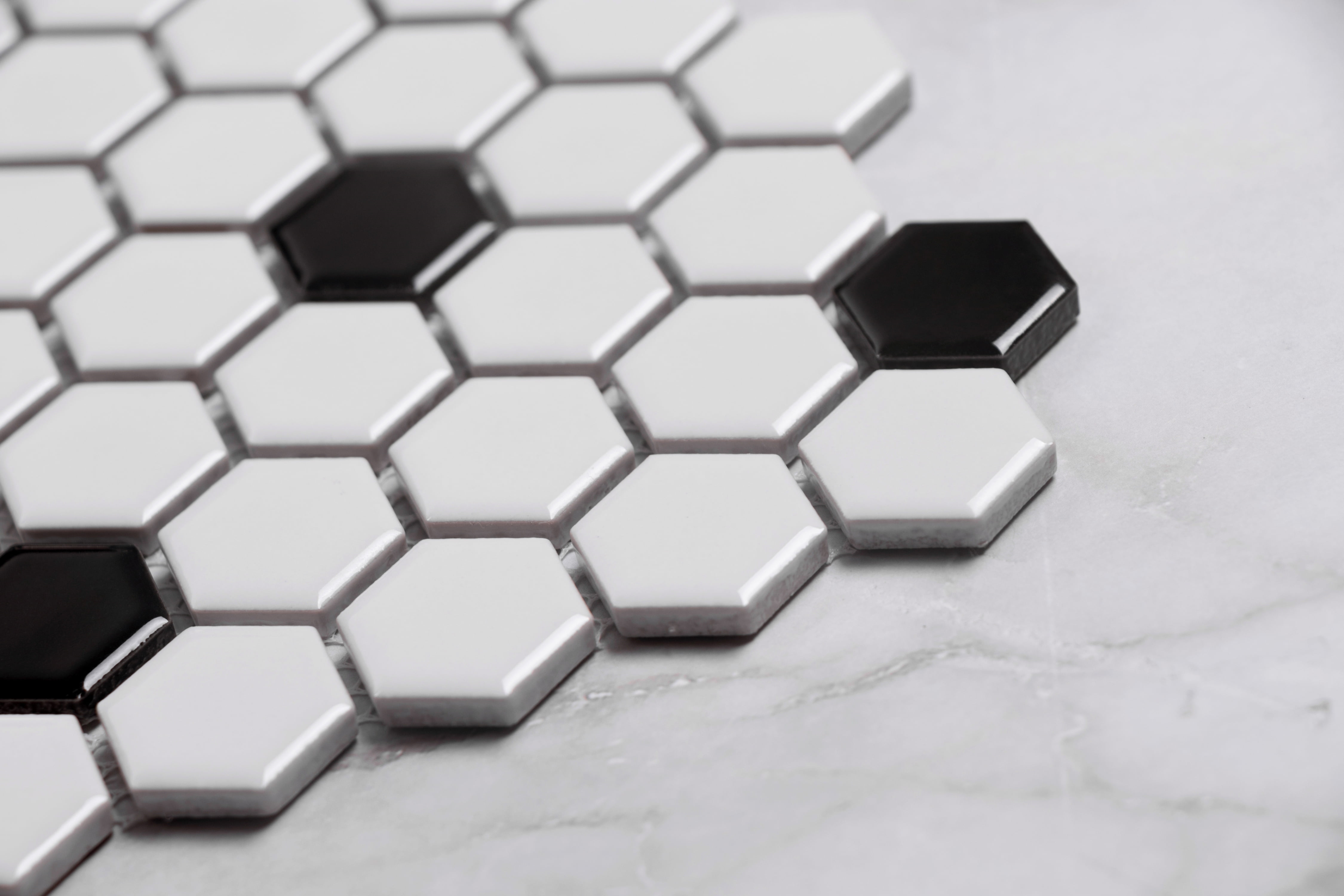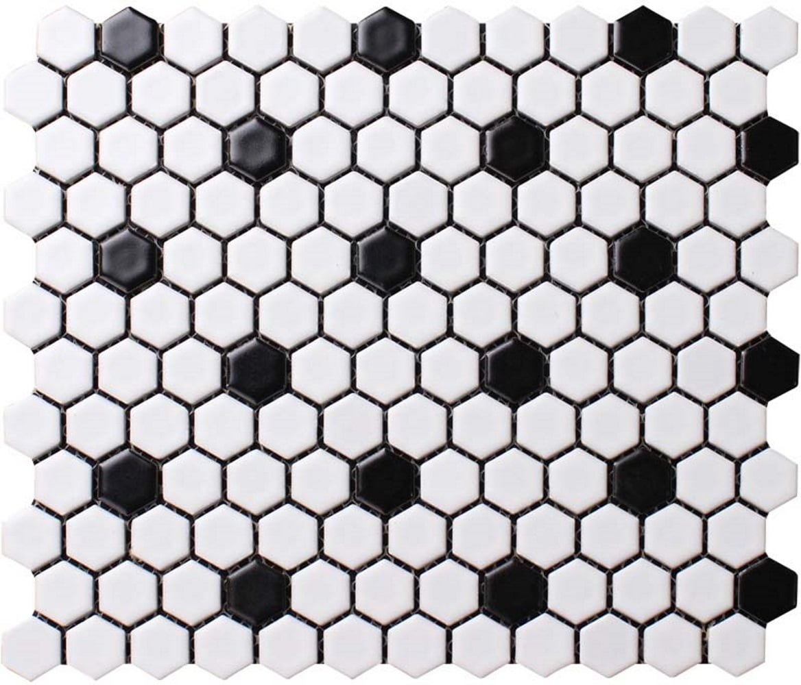 Our matte porcelain tiles are designed to be used on any floors and walls throughout the home. They are heat and water resistant, and can be installed outside as they are frost proof. They are perfect for residential and commercial use. Due to their matte finish, they are perfect for use on the floor. The tile is glazed and the color is burned into the surface of the tile so that they won’t fade, age or have significant color variations. The tiles come on a mesh-backed sheet making them easy to install. The glazed finish makes these tiles look beautiful in natural and artificial light, giving your room a stunning appearance no matter the time of day. Sheet Size: 11.8″ x 10.2″ x 5mm thick Tiles/Case: 11 sheets Covers 9 sq. ft / Case Color: White with Black Dot Finish: Glazed Porcelain with Matte Finish Individual Pieces: 1″ x 1″ x 5mm Hexagon pieces Layout: Honeycomb Mesh-Backed Mosaic Sheets for easy installation. Install using Thinset and Grout Weight: 19lb / Case
