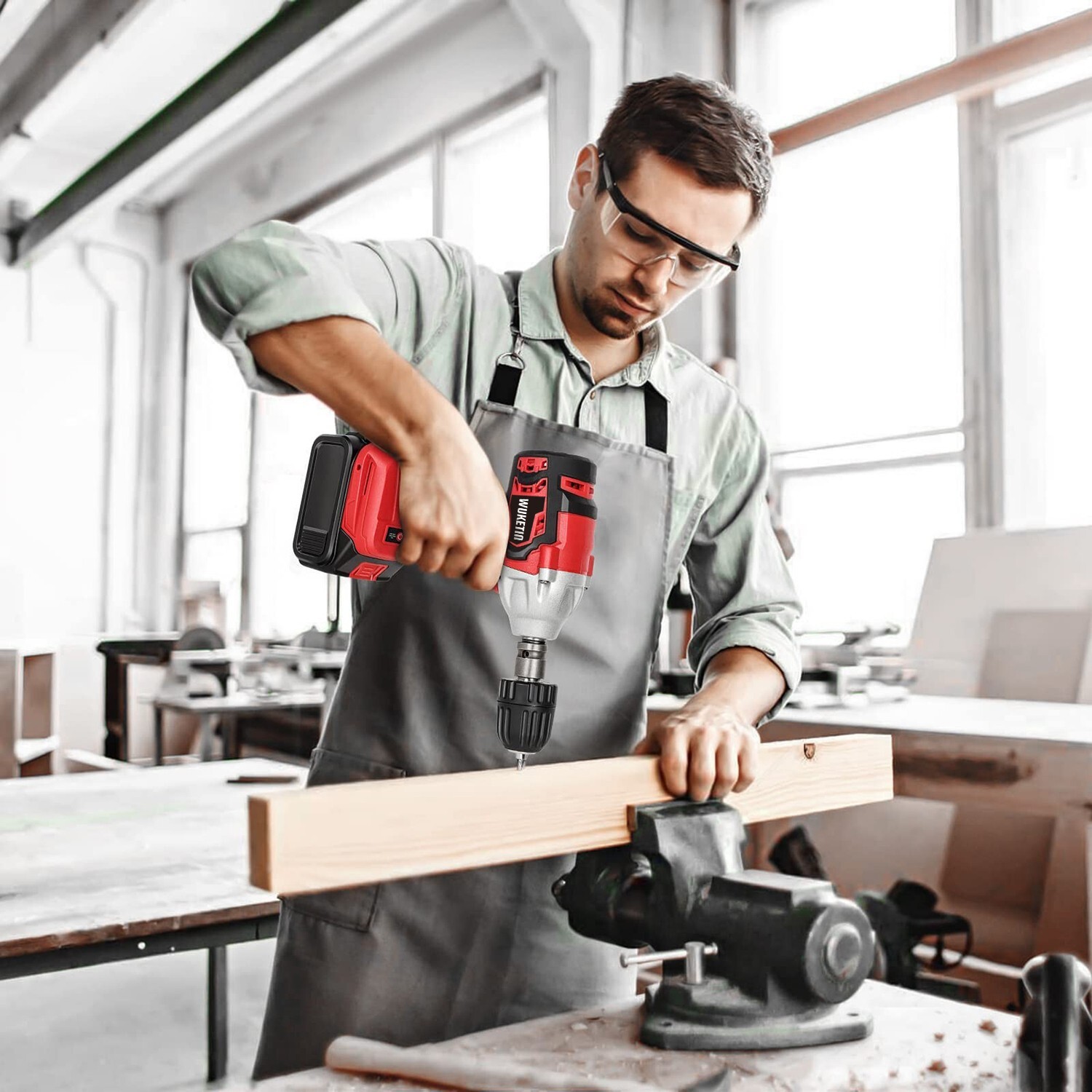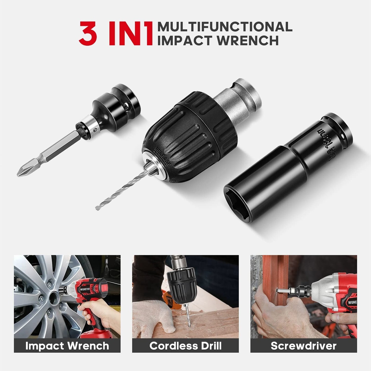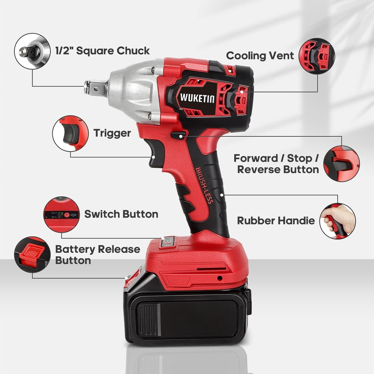 The WUKETIN Cordless Impact Wrench is a powerful tool that comes with a 2.6 Ah Lithium battery that can be fully charged in just 1-2 hours. The brushless motor and high torque of 280Nm make it easy to loosen nuts, bolts, and screws from various projects. It has a humanized design with a heat dissipation system and insulating rubber handle. The impact wrench comes with complete accessories and is versatile for handling most repairing work in your life. Product Details: Color: Black & Red Battery voltage: 21V Input voltage:110-220 V Maximum torque: 280 N.m Maximum speed: 2300 RPM Chuck diameter: 1/2″(12.7mm) Battery capacity: 2600 mAH Product size: 5.9 x 4 x7.7 inch (15 x 10 x19.5 cm) Tool box sizeï¼11.8 x 10.2 x3.5 inch (30 x 26 x 9 cm) Package List: 1 * Electric impact wrench 2 * Batteries 1 * Battery Charger 1 * User Manual 1 * Carry Case 1 * Drill chuck 1 * Apron 1 * Adapter 1 * Plug 1 * Cross Head 1 * Drill 6 * Sockets (14/17/18/19/21/22mm)