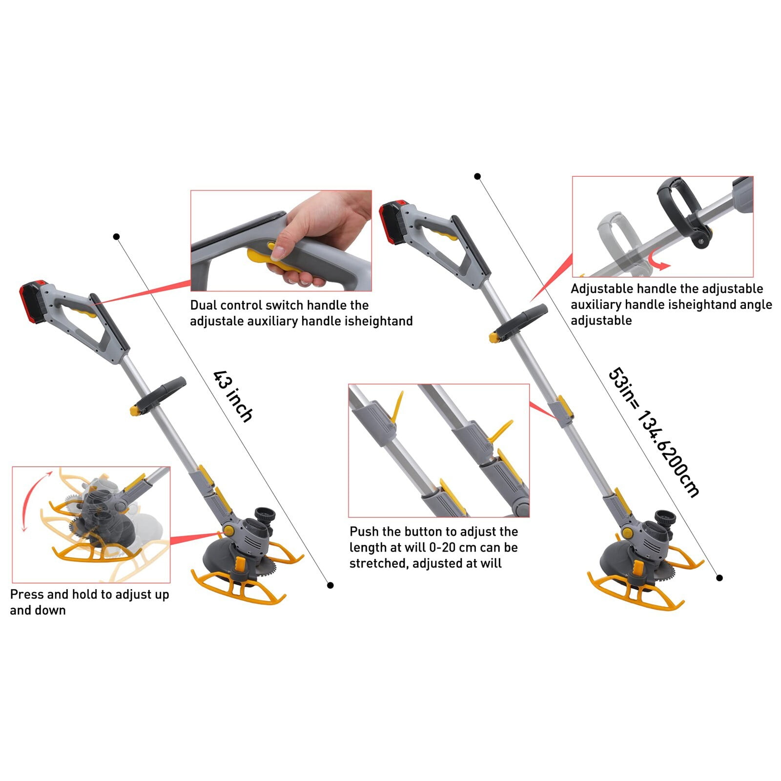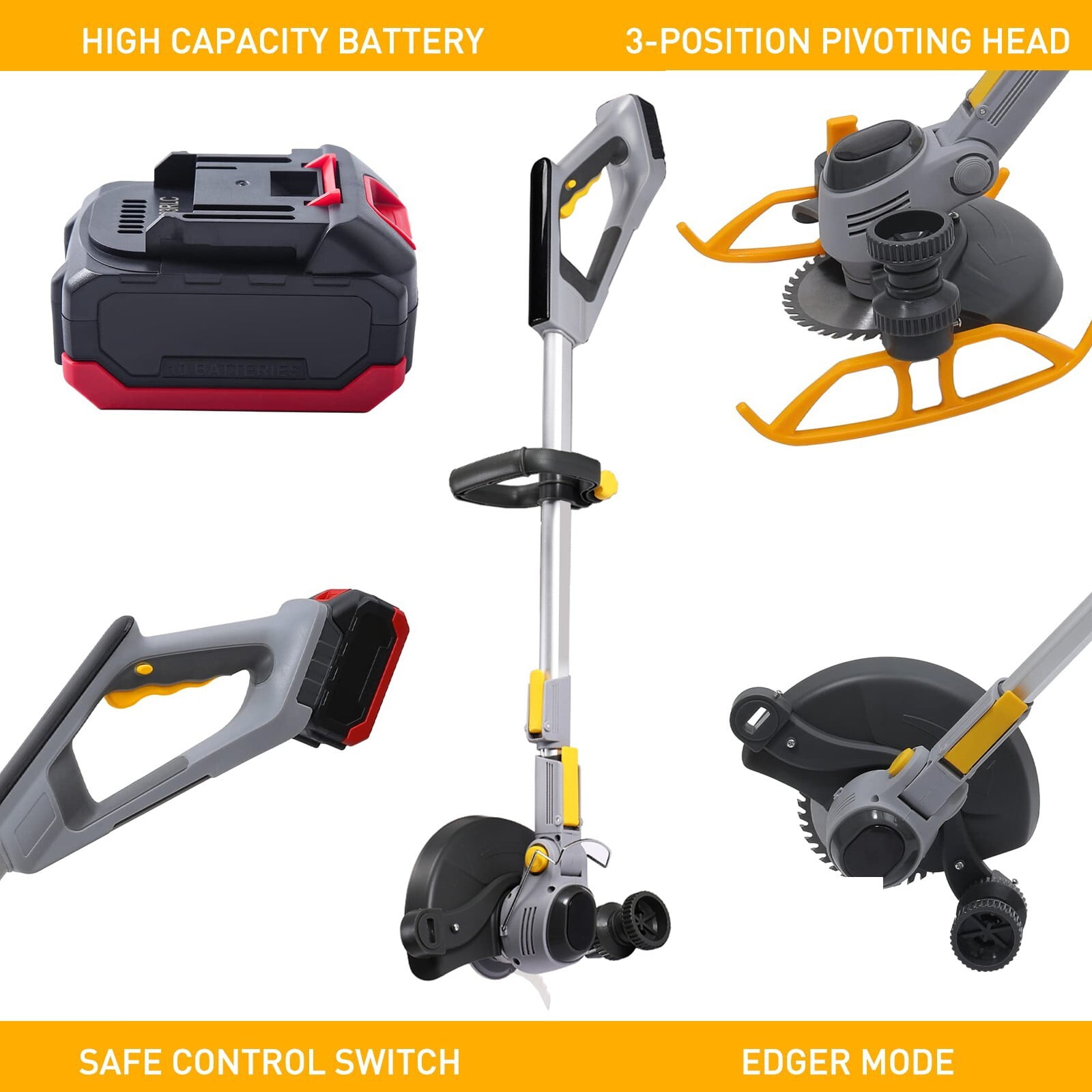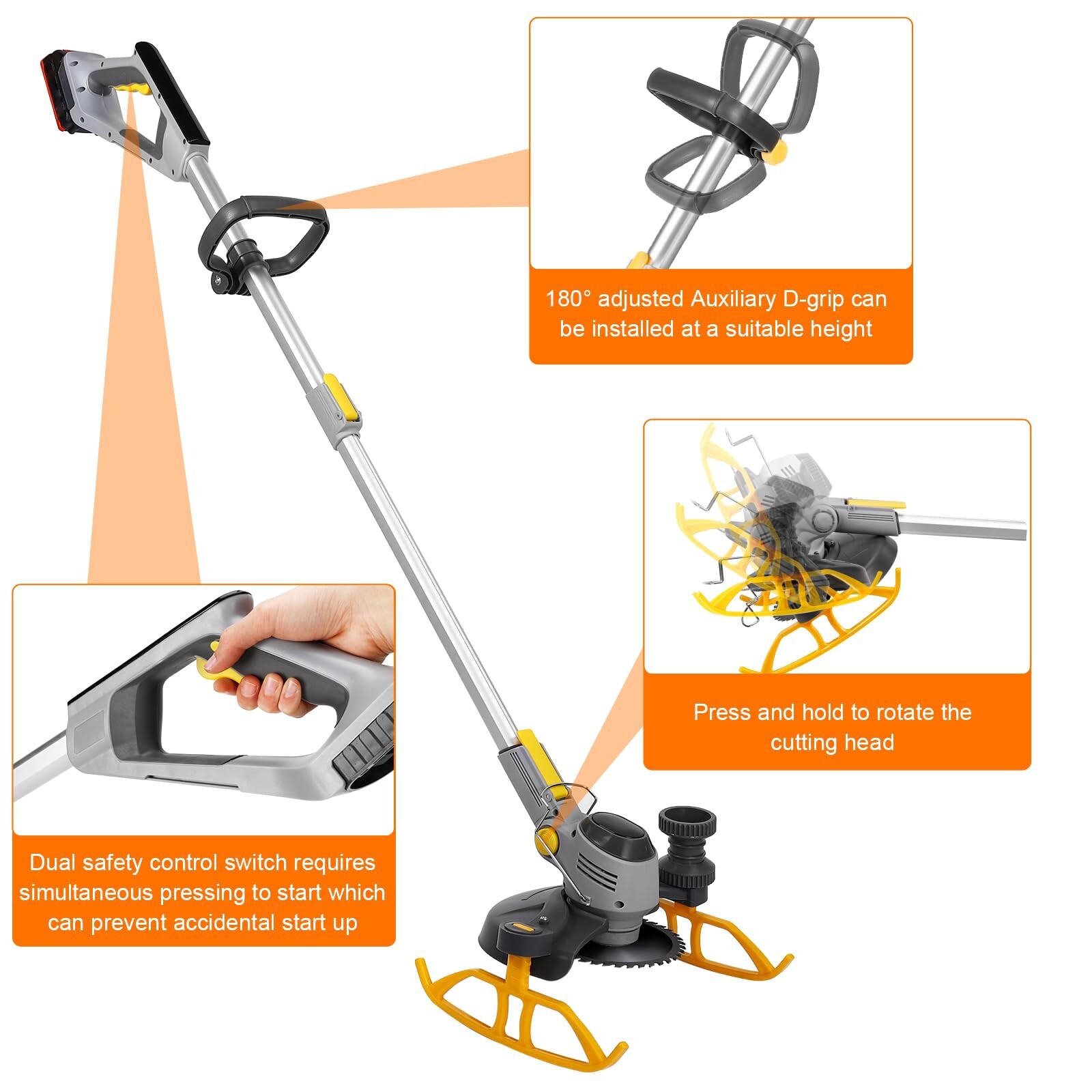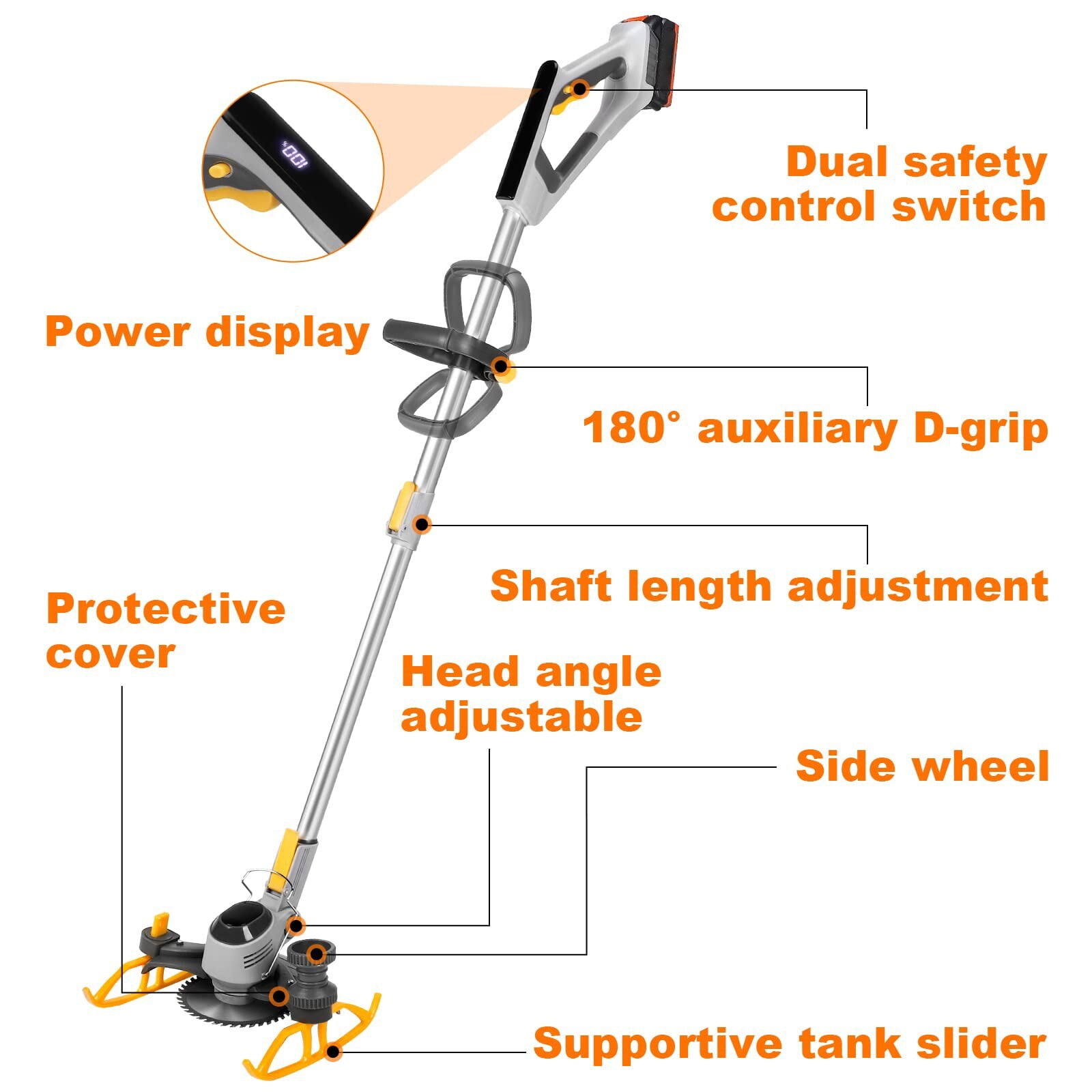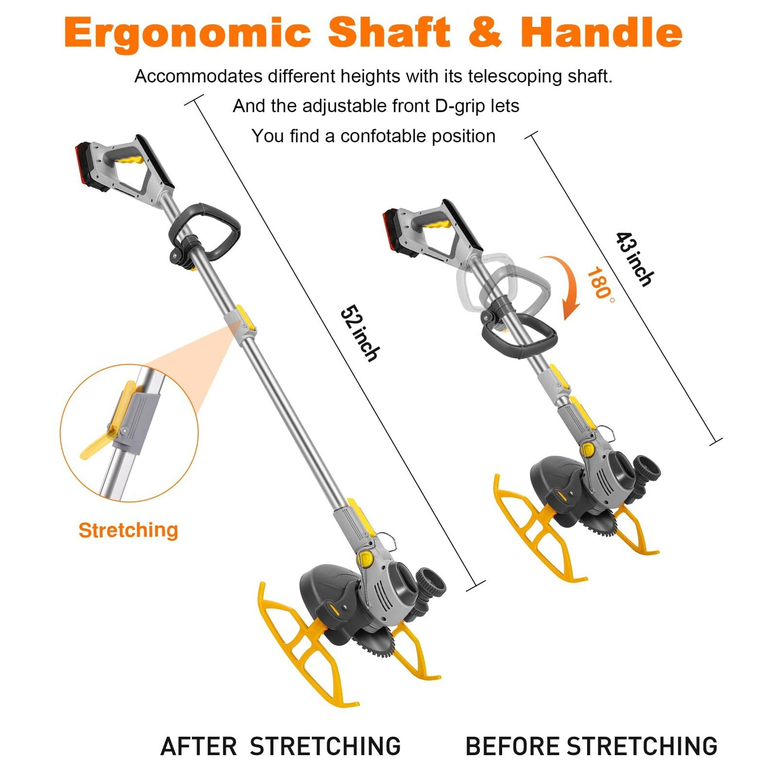 WUKETIN weed eater has a high-speed motor, reaching 18,000 RPM, and a single rechargeable 21V 6.0Ah battery for 150 minutes of continuous mowing. This lightweight, ergonomically designed grass trimmer ensures safety, comfort, and easy use for all body sizes. With adjustable handles, a telescopic pole, and swivel head, it offers versatile cutting options for different scenarios, from trimming grass to pruning thicker branches. The telescopic handle, supportive tank slider, and side wheel enhance user comfort and prevent hand and back pain during extended use. Metal front guard rings provide space protection, preventing damage to plants and features, while overcurrent protection ensures durability and safety when encountering hard objects during operation. Specifications: Material: ABS+Alloy No-load speed:18000 RPM Max cutting diameter: 260mm Battery type: 21V Lithium-ion Battery Capacity: 6.0Ah Loading time: Charging time 120 minutes Adjustable telescopic rod: Max 53 inches Package includes: 1 x Cordless Lawn Trimmer 1 x 6.0A Battery Packs 1 x Power Adapter 1 x 6 Inch Saw Blades 2 x Metal Blades 5 X Plastic Blade 1 X Instruction Manual