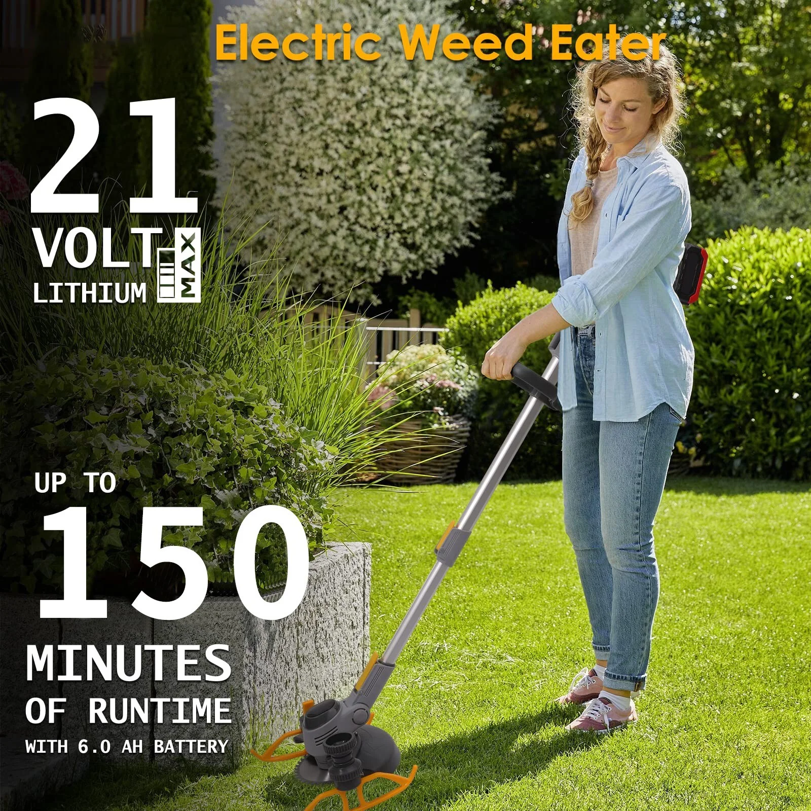 1. This weed eater is equipped with high-performance motors, with a maximum speed of 18,000 RPM, with one rechargeable 21V 6.0Ah battery that delivers around 150mins performance. Easily mow the entire garden lawn on a single charge, avoiding the situation when low-capacity batteries cannot mow the entire lawn at once. 2. As a true lightweight, the grass trimmer is ergonomically designed, particularly light, with a telescopic handle, it offers maximum safety and comfortable working regardless of body size, and equipped with power display. Prevent accidental start by double control, avoid weed debris from dirtying clothes by splash-proof grass cover. 3. Electric cordless weed wacker has adjustable handle, telescopic pole and swivel head, with three different blades for different cutting scenarios to trim grass, branches and lawn edges separately. Plastic blades for mowing fragile weeds, metal blades for cutting thick stems, saw blades for pruning thicker branches and shrubs. 4. This small weed cutter comes with a telescopic handle (36-53 inches), accommodating different body sizes. With a supportive tank slider and side wheel, which can mow various uneven lawns according to the user’s comfortable angle, this lightweight weed trimmer prevents hand pain and back pain caused by prolonged carrying. 5. Metal front guard rings provide space protection to keep the cordless edger away from hard objects, so you don’t damage plants, landscape features and lawn trim as you trim. When the electric weed eater encounters hard objects, it triggers over current protection to cut off the power, avoiding damage to the battery and motor.