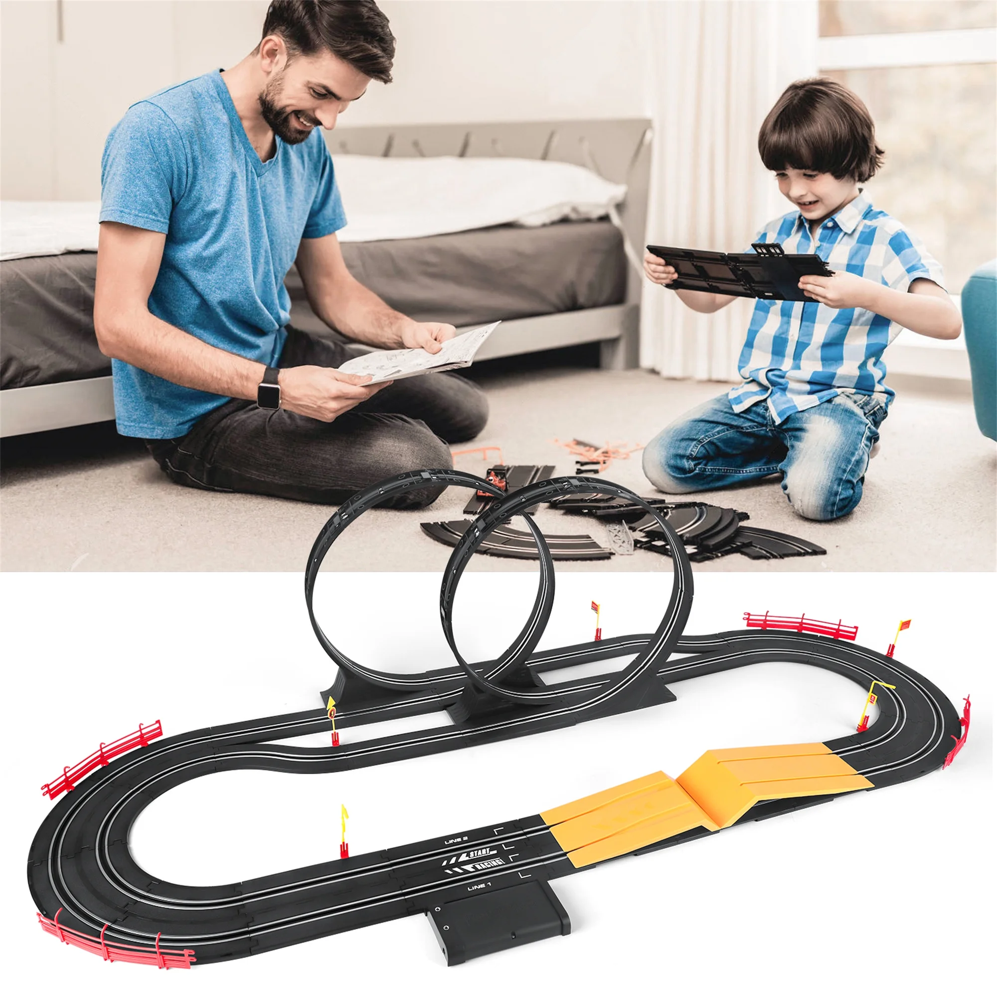 Description: Brand: Wupuaait Category: Electric Cars Race Track Set Color: Colorful Material: PVC Dimensions: 16.54 x 4.33 x 13.78 in Weight: 4.63 (lb) Total Quantity: 1 Applicable Group: Children Applicable Age Group: 3 Years Old and Above Applicable Gender: Boys and Girls, Unisex With or Without Dangerous Goods: None This electric cars race track set includes two racing cars which allows kid to play with his/her friend or parents, to assemble the race track helps children improve their hands-on abilities. What a perfect birthday gift for your kids! Includes: 4 x Plastic Fence 2 x Small Plastic Curve 20 x Plastic Straight Race Road 1 x Adapter(No Need Batteries) 2 x Controller 2 x Plastic Jumping Board 2 x Slot Car