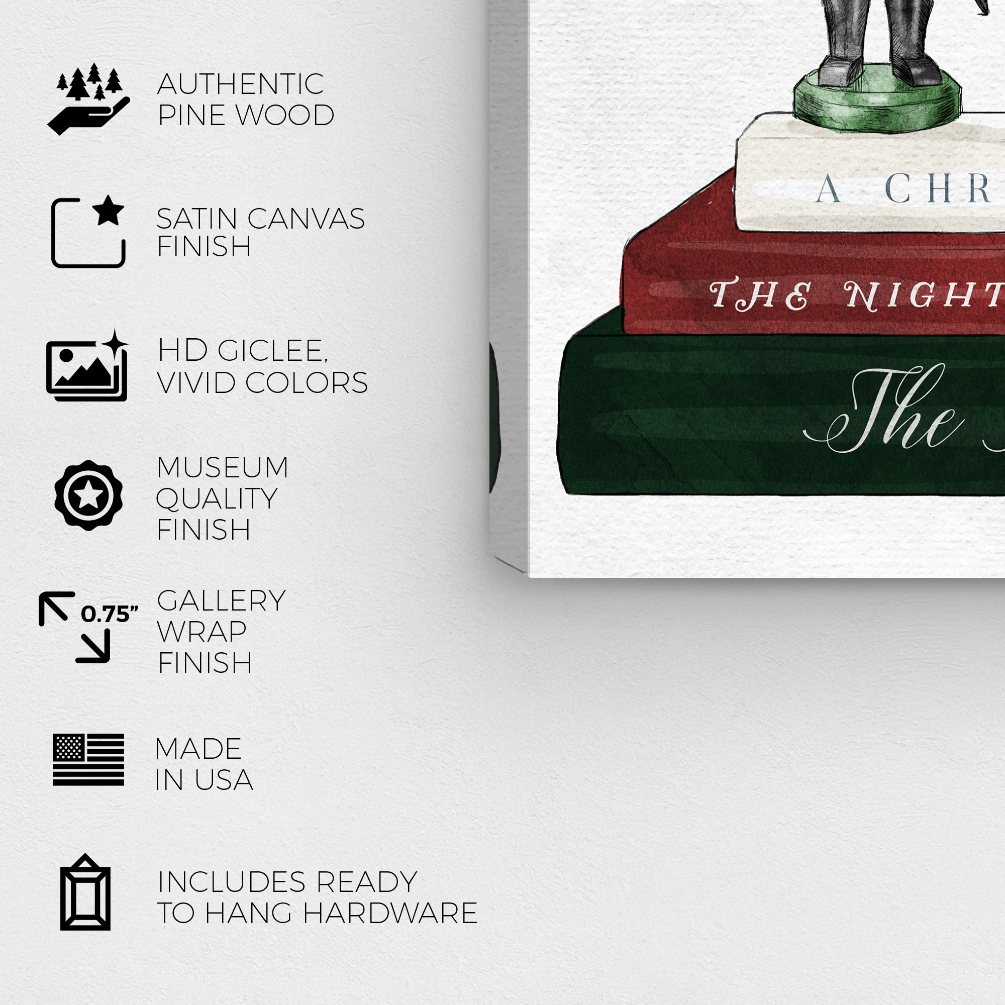 Wynwood Studio Holiday and Seasonal Wall Art Canvas Prints ‘Holiday Nutcracker Books’ Christmas Home Décor – Green, Red, 30″ x 30″: This art piece has a square orientation holiday design to bring you the perfect wall art Sustainable and forest friendly Professionally hand stretched in a 1.5 inch-thick sustainable wood frame Arrives ready to hang with pre-installed hooks for easy hanging. Nail and hanger also included Printed using ultra-premium and fade resistant inks to guarantee high definition and vivid colors Available in several size options