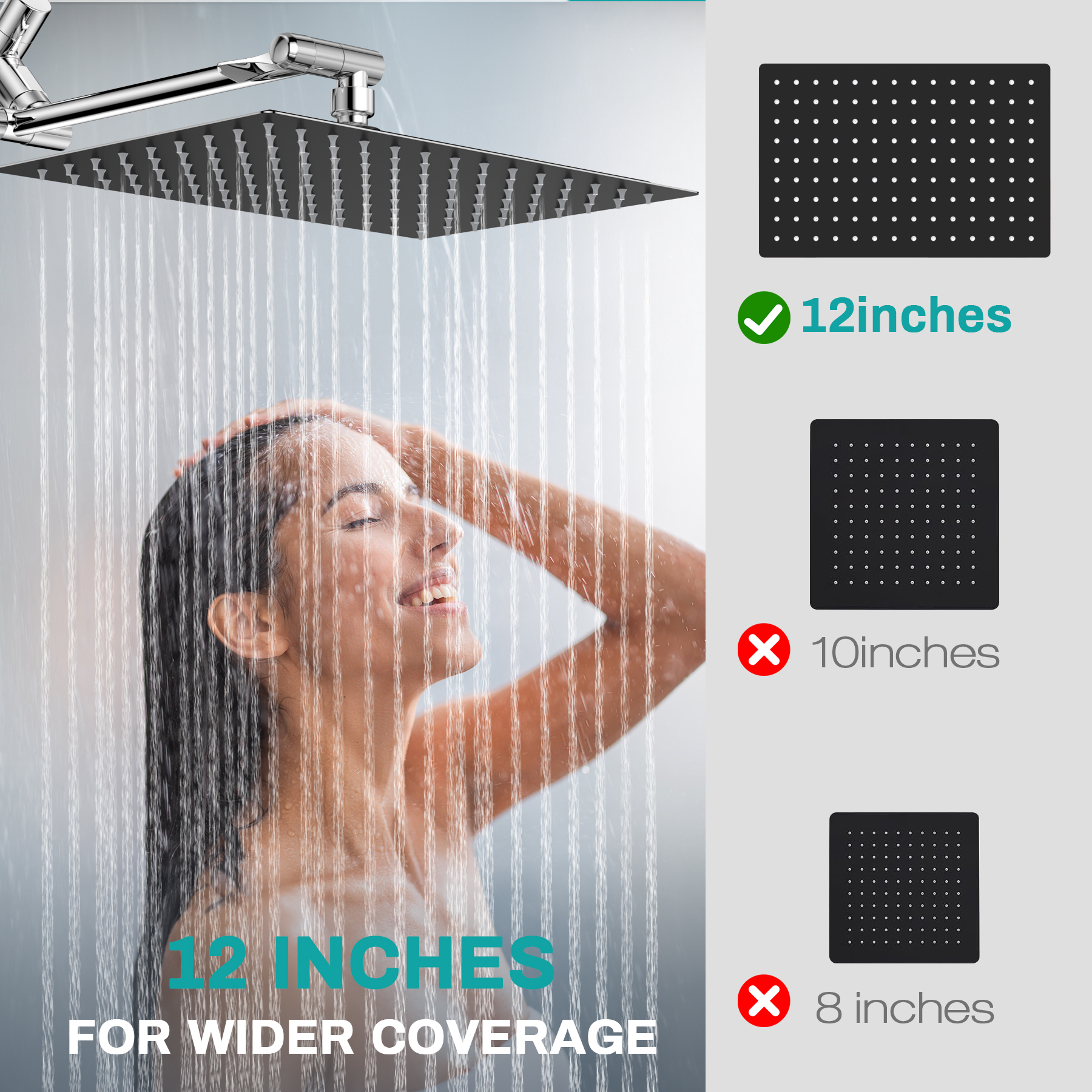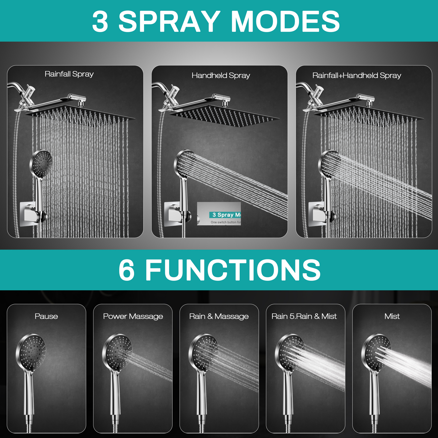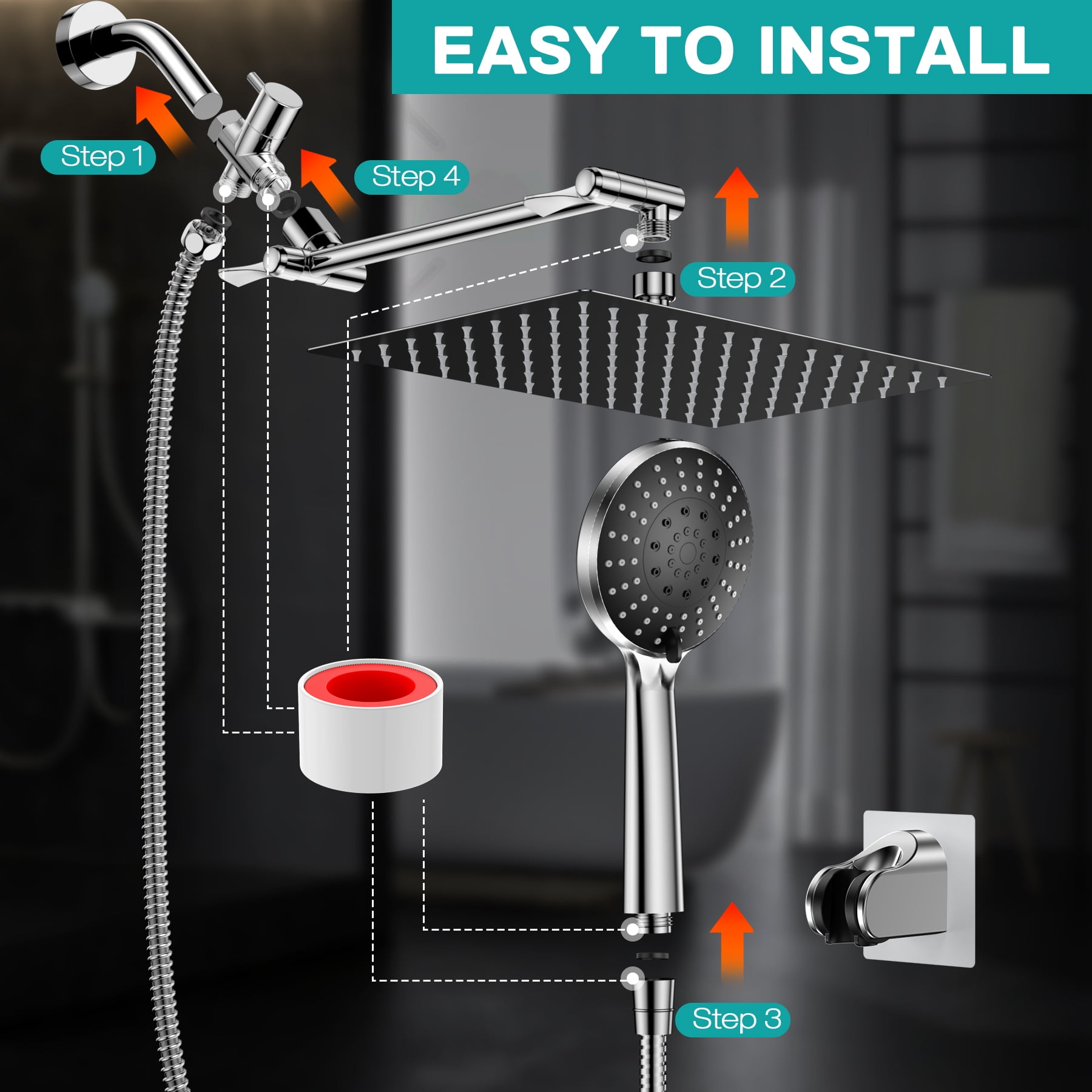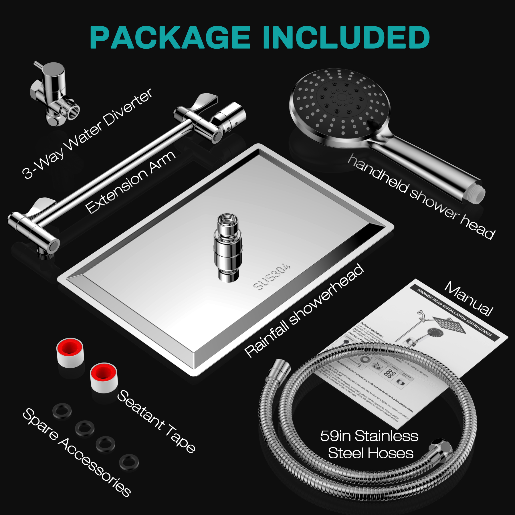 【9 Spray Settings Handheld Shower Head】: The bathroom handheld shower head generates pressurized water flow and delivers water at a higher speed. The 9 spray modes provide a pressurized effect even under low pressure, offering an ultimate shower experience. Choose your preferred mode to save daily water usage. The handheld spray mode is perfect for bathroom cleaning, pet bathing, bathtub cleaning applications, and more. 【12-Inch Rain Shower Head】: The large rain shower head combo features an ultra-thin design and air intake technology, with 126 spray nozzles to prevent clogging. Its impressive waterfall shower head covers the entire body, providing an exceptional rain shower experience. Enjoy a relaxing, hotel-style bathing experience. 【Adjustable Shower Extension Arm】: The height and angle adjustable curved shower head extension arm is suitable for any rain shower head or high pressure shower head. The height can be adjusted up and down, ensuring the shower head is always vertical at your desired height, avoiding collisions with the shower arm and preventing the water flow from tilting like it does with standard straight shower arms. The curved design enhances its load-bearing capacity, elevates your shower head, and ensures vertical water flow. 【Lightweight Design and Stainless Steel Material】: The WYRAVIO high-pressure shower head combo is made of premium stainless steel, which is rust-resistant, durable, and long-lasting. No more worrying about a heavy shower head falling and hitting your head during your shower. The lightweight design makes it easier to install and adjust the angle. 【Upgraded Triple Outlet Diverter and Easy Installation】: This shower head combo can be easily installed without tools or a plumber. The triple outlet diverter can be used separately with a shower head/rain shower head or simultaneously with two shower heads. Our diverter and shower arm are designed to connect seamlessly, preventing leaks and wobbling. 【Installation and Accessories】: Easy to install, no plumber required. Compatible with standard 1/2” pipe threads. Comes with a 59-inch long shower hose. The drill-free shower bracket doesn’t damage walls. Please read our instructions carefully before installation. Feel free to contact us if you have any questions
