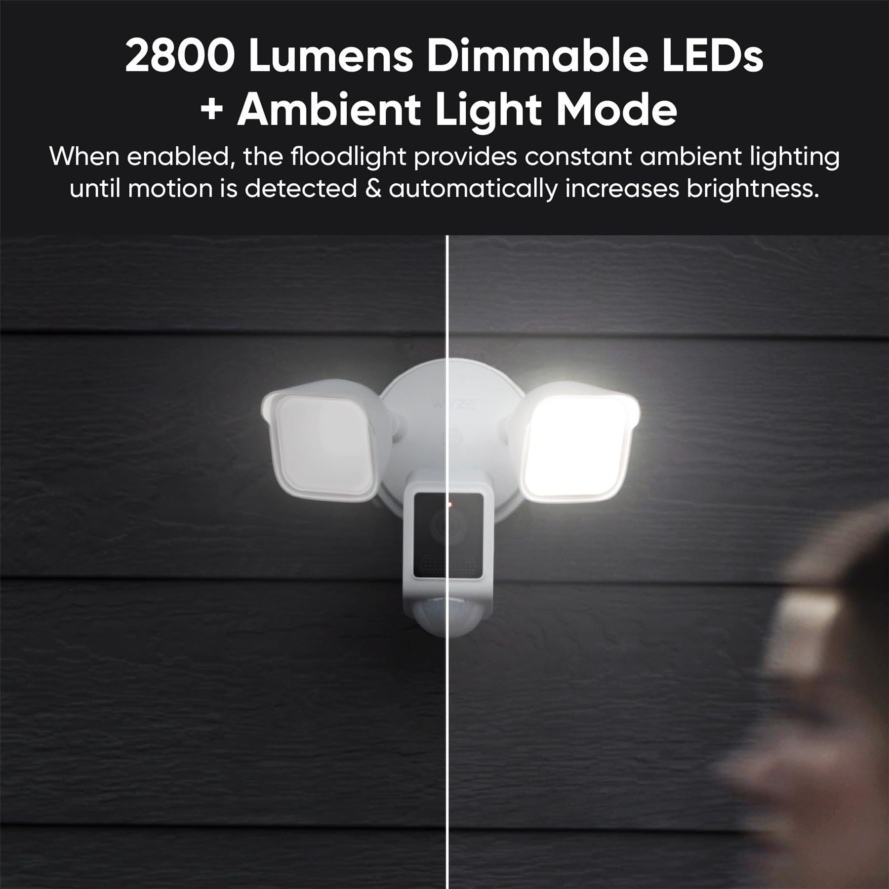 Dominate the dark with 2800 Lumens LE. Ds, 2K video with Color Night Vision, and a 160 degree wide-angle view. Enjoy 24/7 local recording, Ambient Light Mode, two-way talk, and AI-Powered Light Control. All that, plus dusk-to-dawn automation, IP65 weather resistance, and seamless integrations with your favorite smart assistant means Wyze Cam Floodlight v2 is lighting the way to smarter home security.