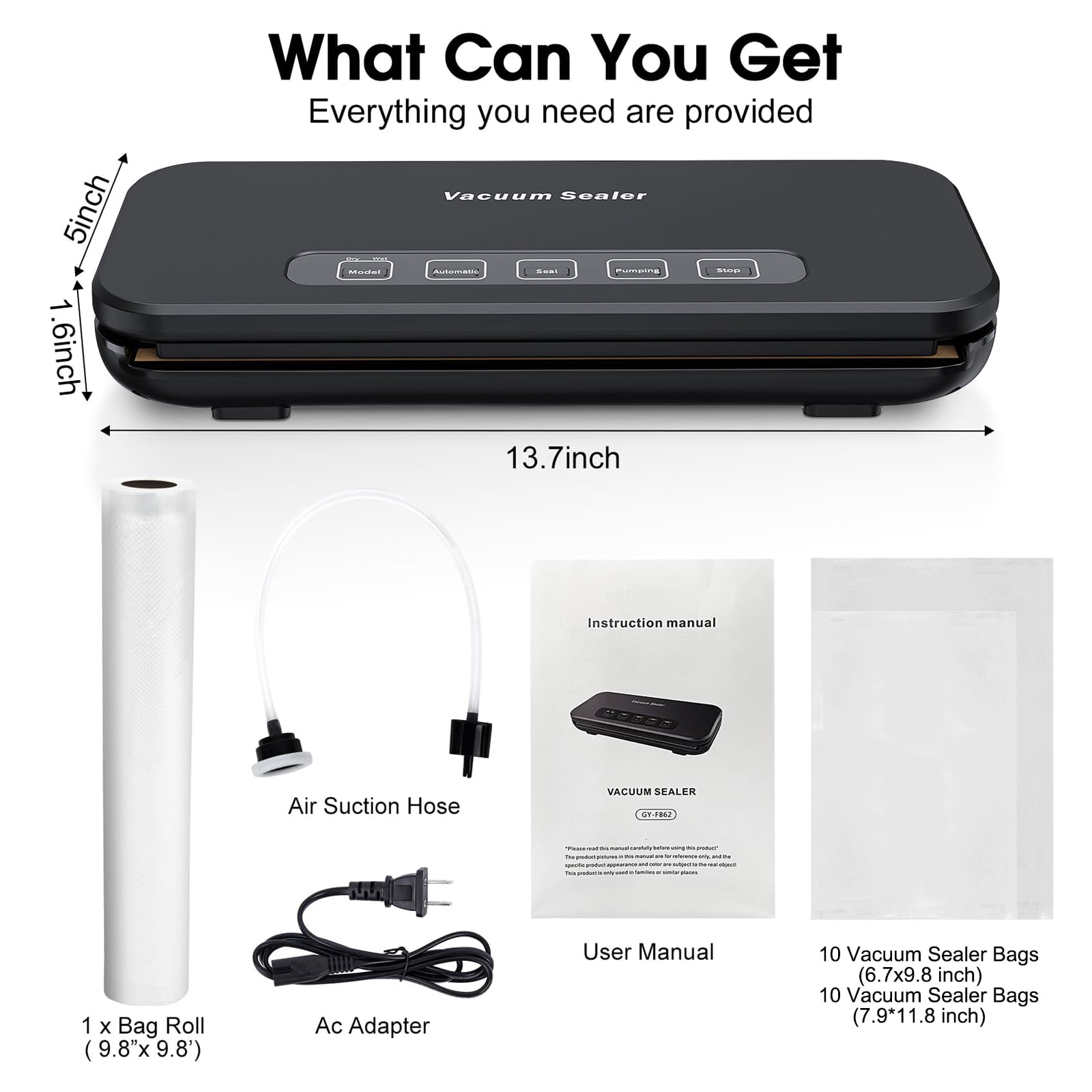 One-Touch Quick seal: This 85kpa suction power efficient vacuum sealer is equipped with an 11-inch extension sealing strip and a 0.11-inch heater strip, allowing for sealing of multiple bags in different sizes at once for time-saving convenience. 5 Modes vacuum sealing machine: With 5 adjustable mode, it satisfies various food storage needs to extend freshness and reduce waste. The fully automatic operation with push-button design seals food quickly in just 15-20 seconds. Additionally, the external vacuum system includes an air suction hose for extracting air from crispers and jars to slow down food oxidation. Versatile: This food vacuum sealer can be used for everyday food storage, extending the shelf life of leftovers, and conveniently storing in bulk in both the fridge and freezer. Friendly vacuum sealer Kits: You will get a food vacuum sealer machine * 1, manual * 1, foam seal*1, vacuum bags * 20, Air suction hose * 1