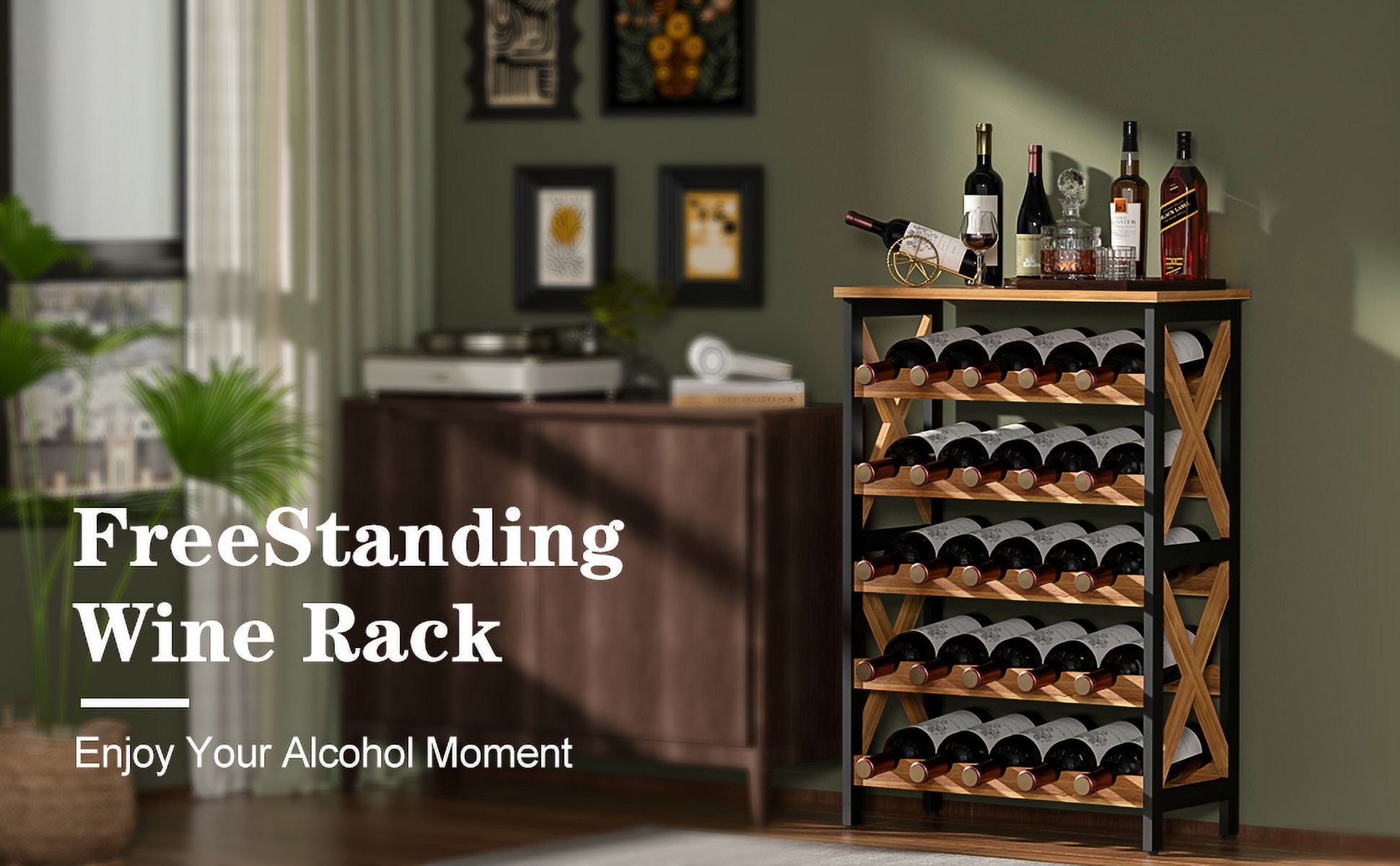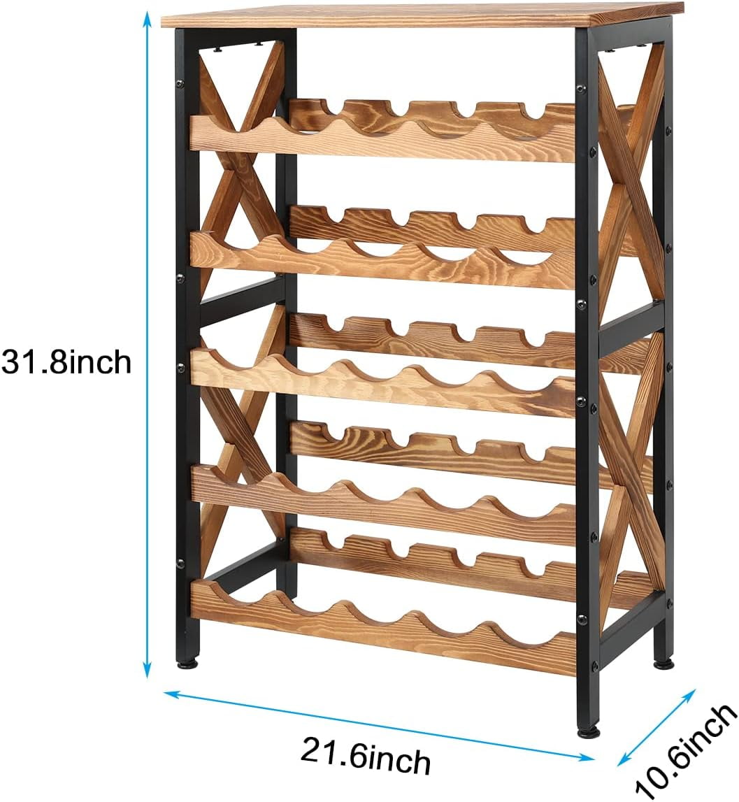 X-cosrack 25 Bottle Wine Rack with Tabletop for Living Room,Kitchen or Wine Cellar Our wine rack is a must-have product for wine lovers. It’s a stylish wine shelf with great functionality and allows you to enjoy browsing your collection of bottles. Big Capacity: with 25-slot wine rack helps you highlight your precious wines or other alcoholic beverages. Also, the anti-tip strap provided offers added stability. Paired with X frame, flowing curves and retro country style, this pretty wine rack is perfect for your home decor. Features: 25 WINE BOTTLE RACK SPACE SAVING TIMELESS, RUSTIC LOOK DESIGN DURABLE AND WATERRESISTANT EASY TO INSTALL