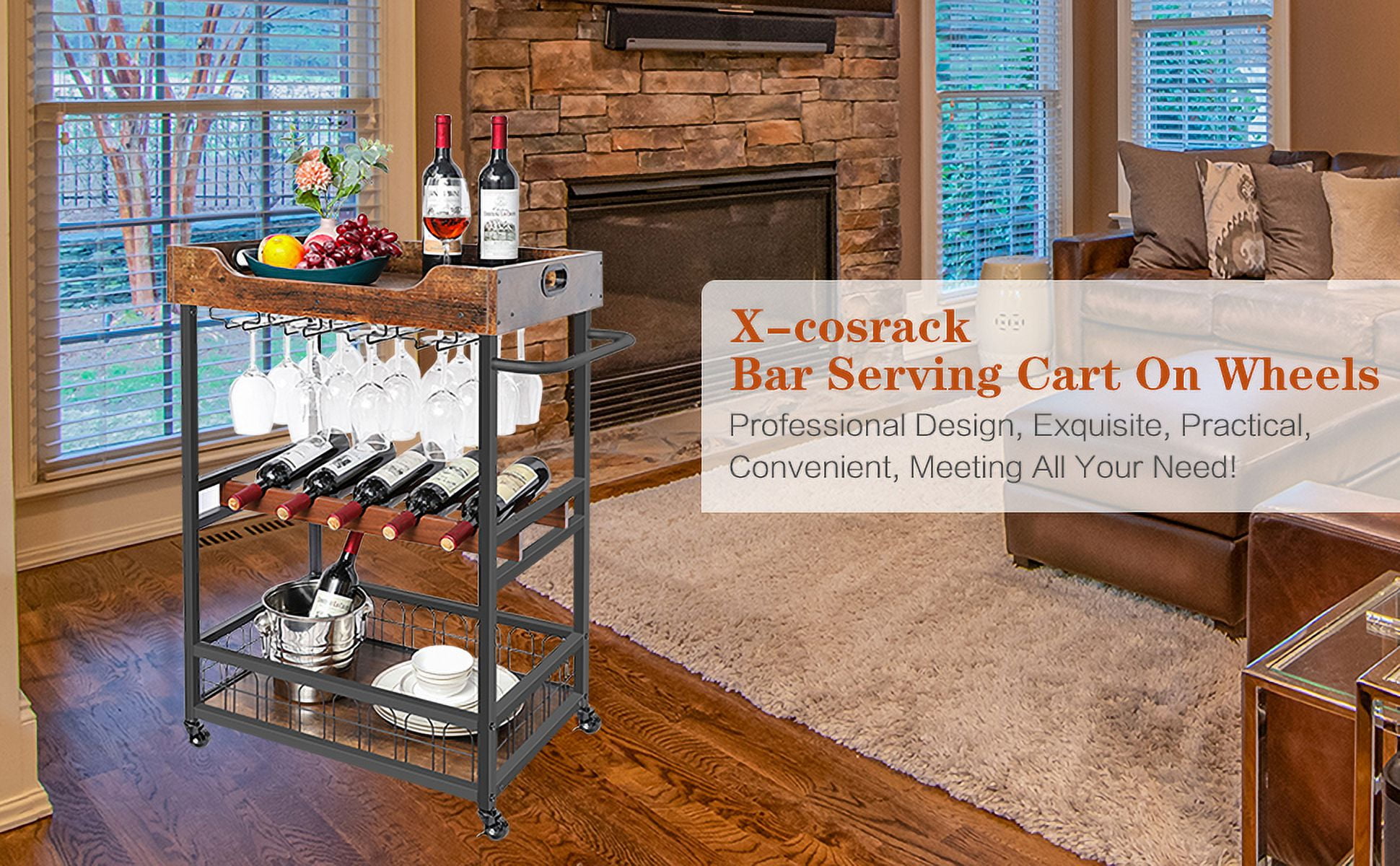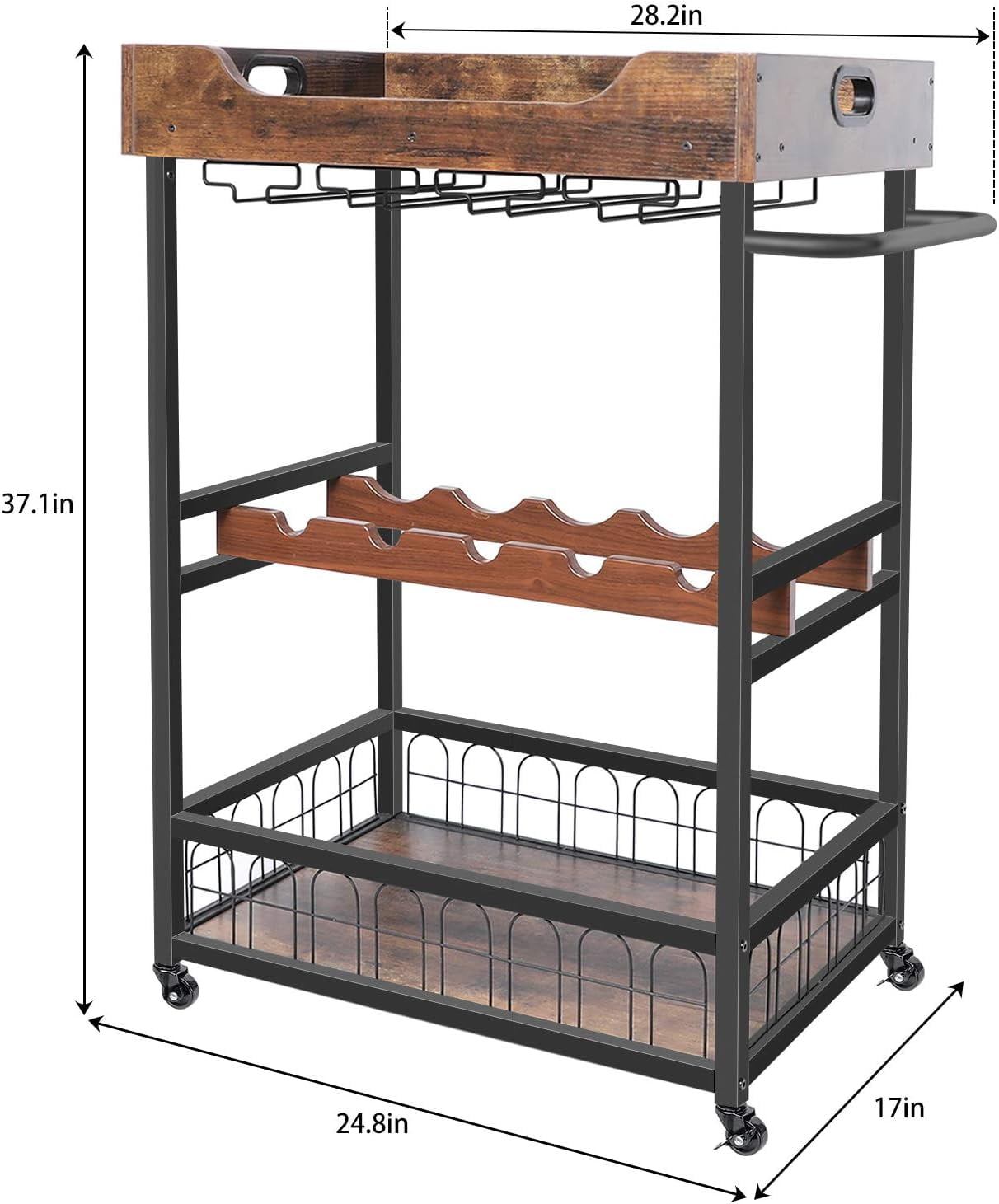 x-Cosrack 3 Tiers Rolling Home Serving Cart with Wine Rack and Wheels,Modern Metal Wine Cart,Industrial Mobile Storage Kitchen Trolley for Kitchen, Bar, Living Room Our bar cart with wine racks is designed for person who do simple entertaining at home. Combining storage space and mobility, this bar cart can be used in the office, kitchen, dining room or living room to store food, dishes and other items. With four 360°rotating casters allow you to easily move around. Our bar serving cart can hold 16 standard red wine glasses and 5 bottles of red wine. With elegant and gorgeous appearance by high-quality eco-friendly MDF and strong metal frame, let it easy perfect fit your home. Highlights: 1.Removable wooden tray can be used to place bartender kit, fruits, appetizers, desserts, etc. 2.The best supplement for entertaining friends and family. 3.High-quality MDF and strong metal frame. 4.Durable and easy to clean. 5.Anti-falling fence. 6.Widely Applications. 7.Large Storage for Daily. 8.Perfect Gift Option. Specifications: Product Dimensions: 17″D x 28.2″W x 37.1″H Weight: 32.3 lbs Shelf Type: Tiered Shelf Color: Rustic Brown Frame Material: Mdf,Metal Frame,Wooden Brand: X-cosrack Style: Industrial Product Care Instructions: Wipe with Dry Cloth Shelf Type: Tiered Shelf Load Capacity: 66 lb (30 kg) Package: 1x Rolling Bar Cart