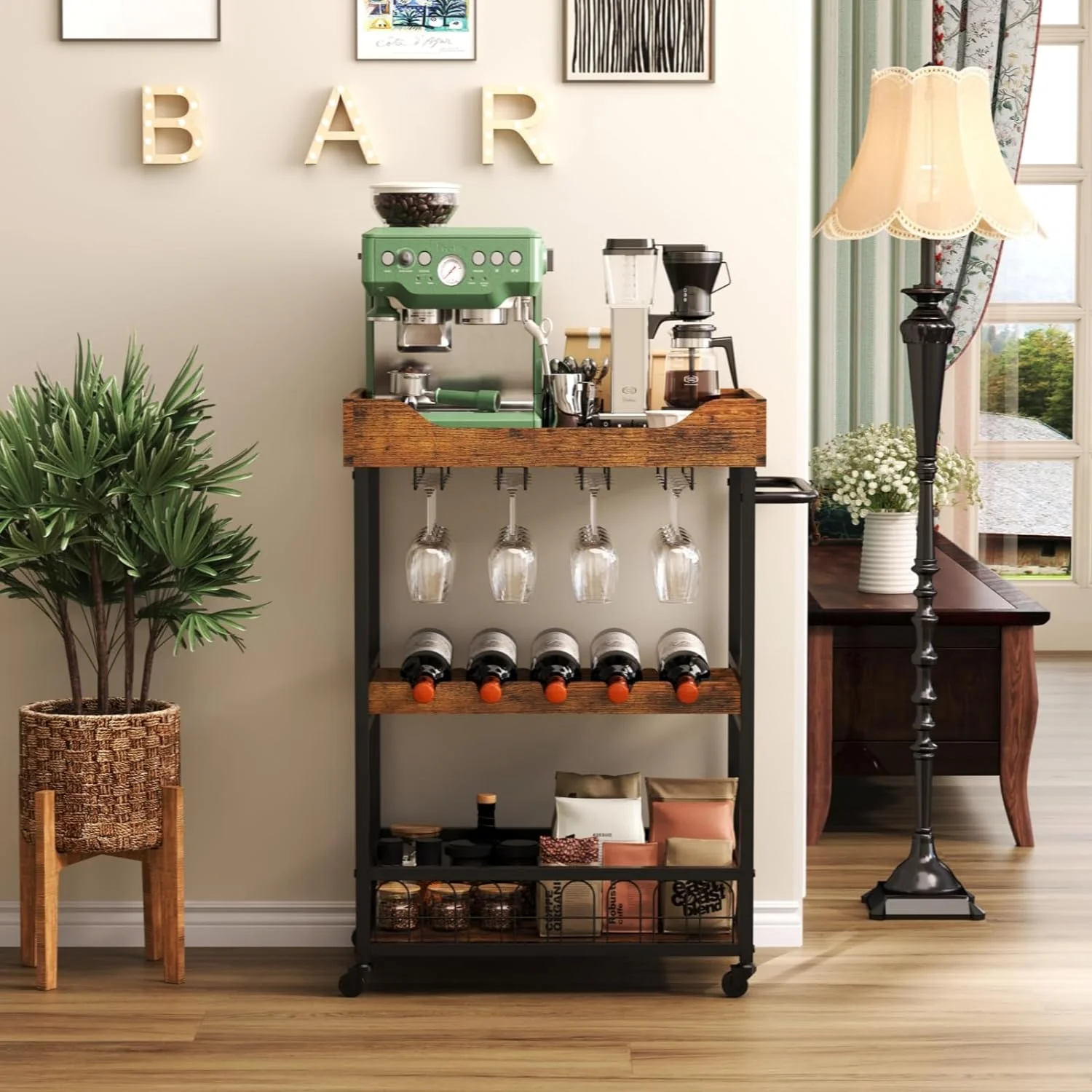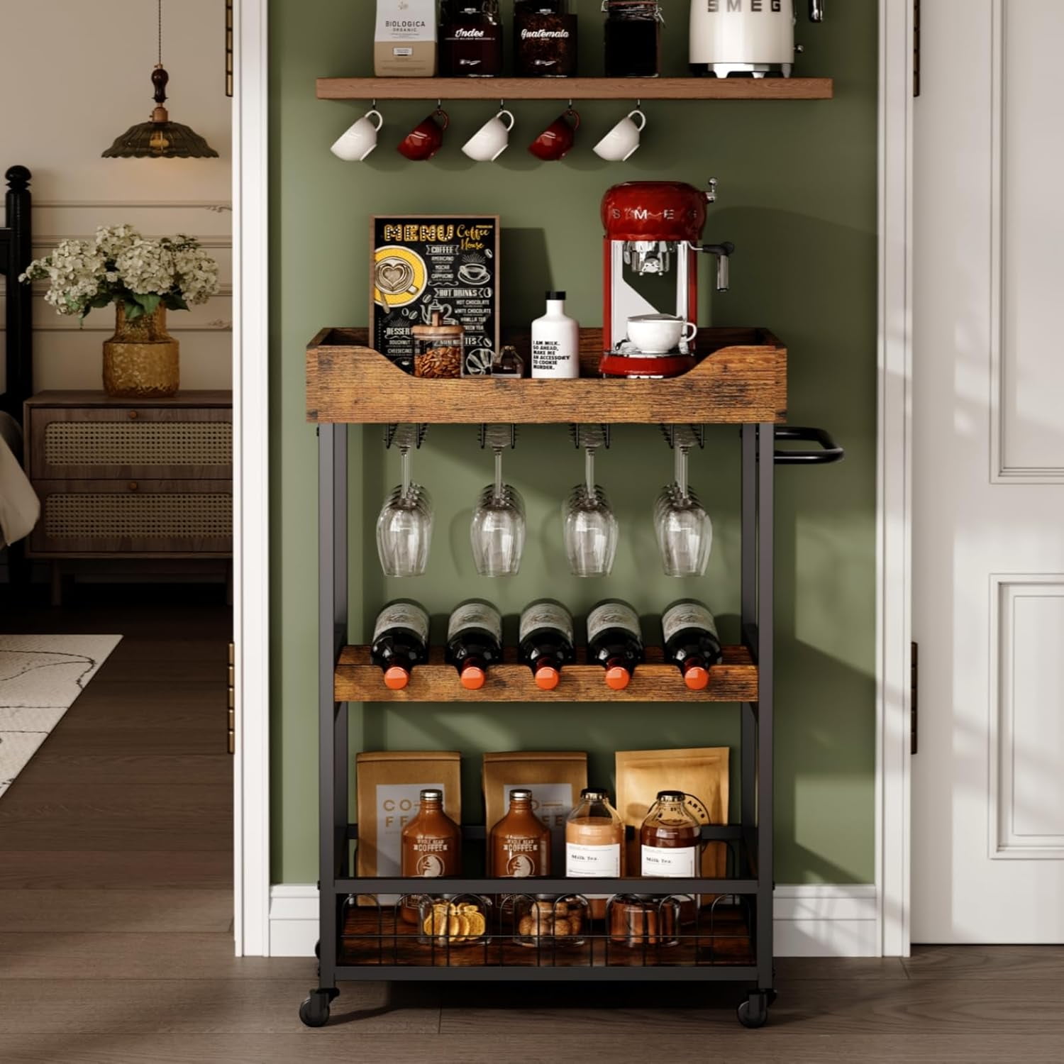 x-Cosrack 3 Tier Home Bar Cart with Wine Rack and Glasses Holder, Mobile Kitchen Storage on Wheels, Brown
