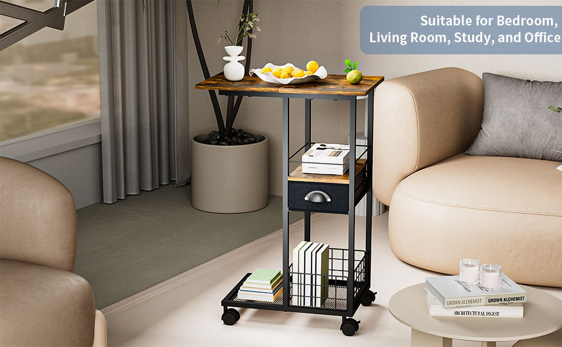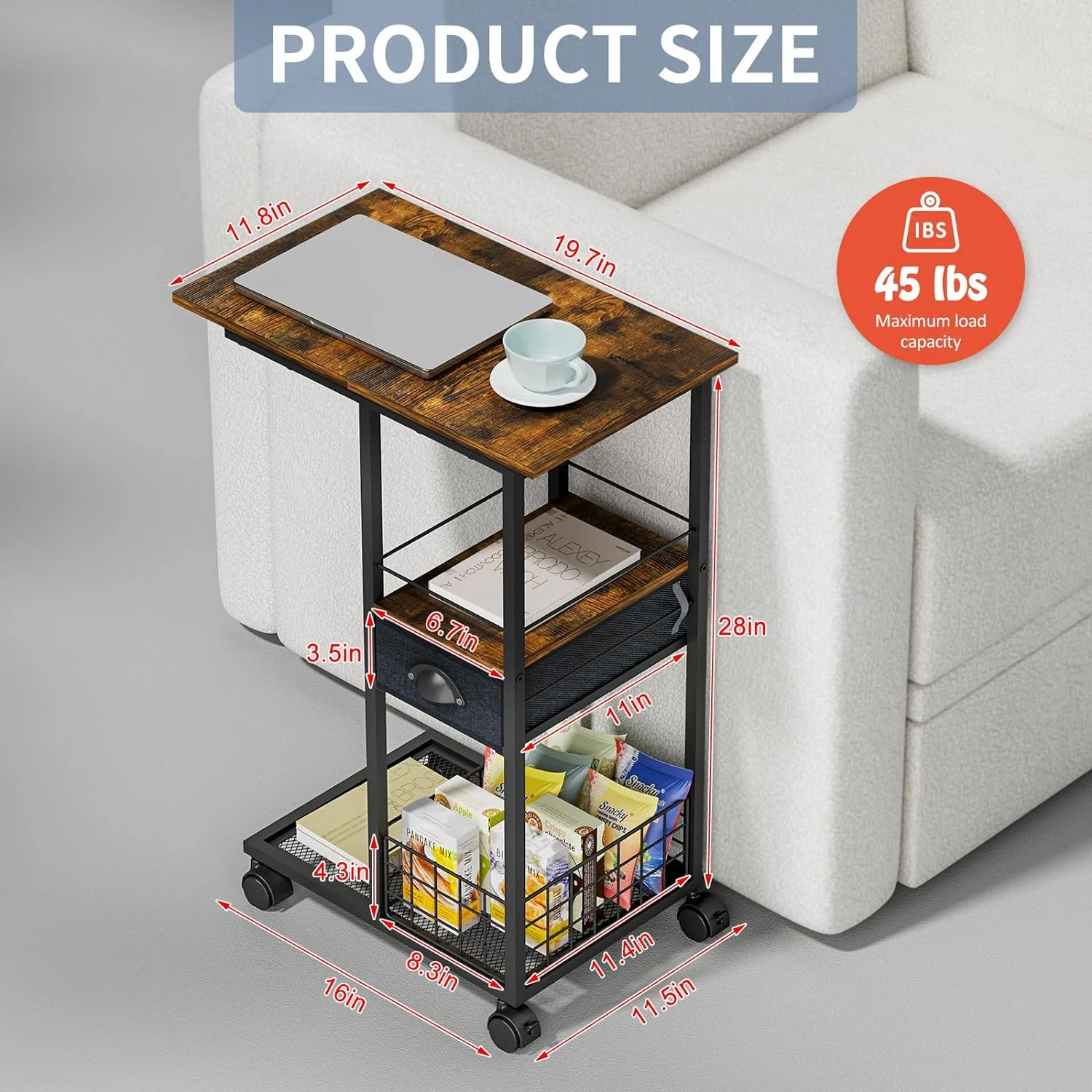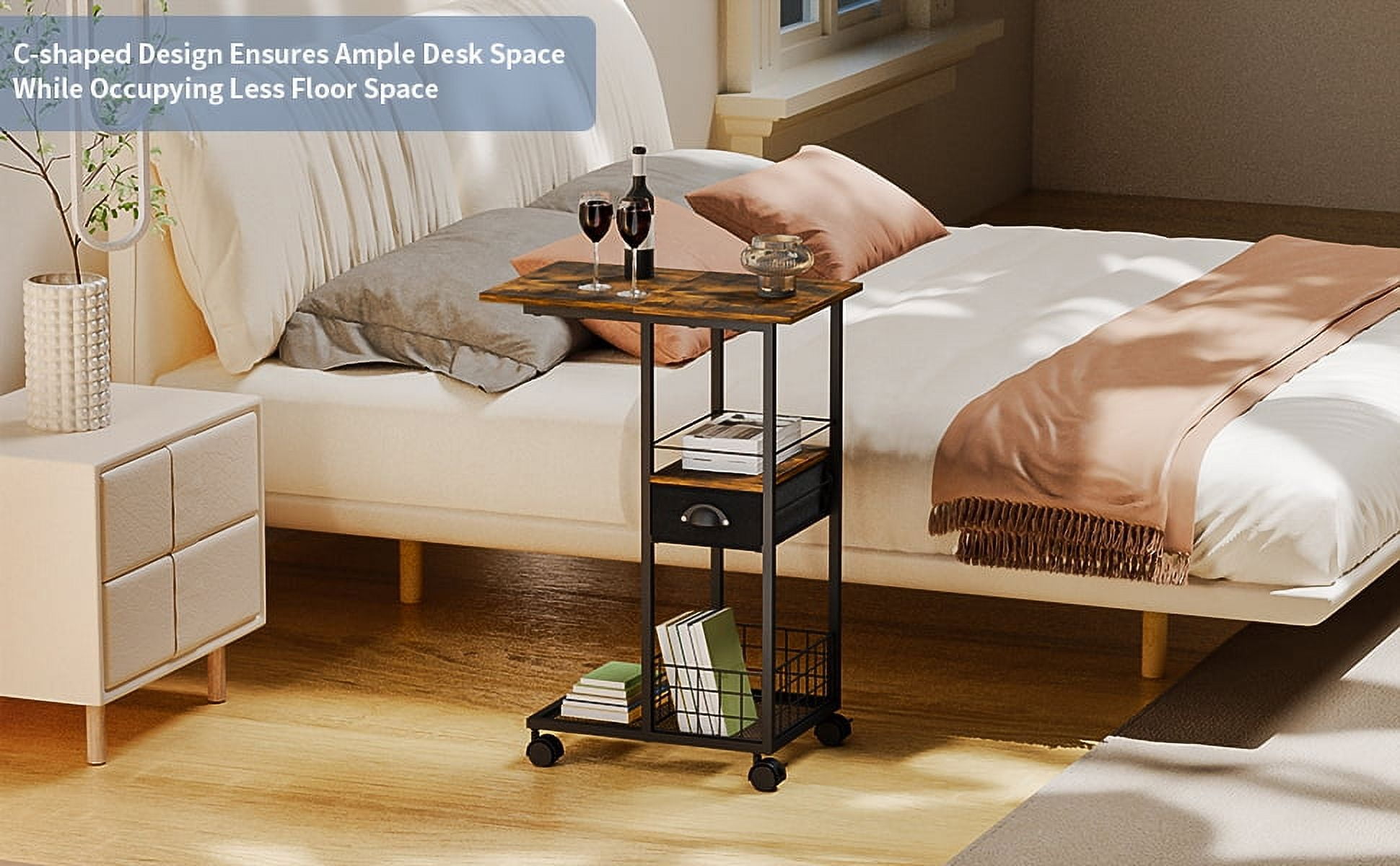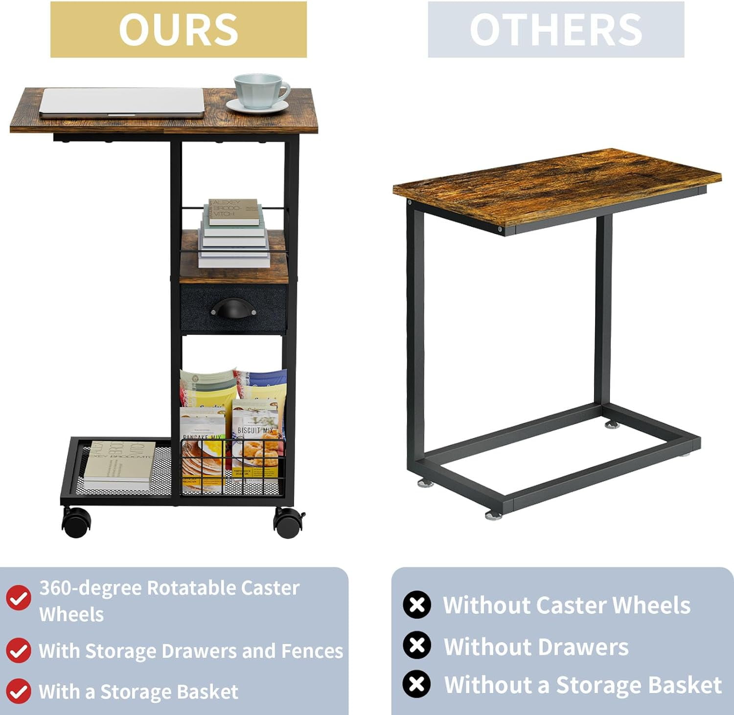 【With Storage Drawers】: This C-shaped end table with drawers provides storage space to store and conceal personal items. You can organize and store documents, stationery, magazines, etc., in the drawers, making the tabletop more tidy and organized. Above the drawers, there is an iron wire fence that adds additional storage space, where you can store books, photo frames, glasses, and other items. The rotation wheels are equipped with brakes to ensure stability during work, preventing unnecessary movement. The sofa side table is designed with a storage basket at the bottom, effectively utilizing the space underneath the table. Features a vintage-textured wooden board, adding a touch of retro charm to the interior environment. Portable & Easy to Move,Easy Setup and Clean Made of metal, providing sturdy stability and a rust-resistant coating. Can be used as a snack side table, bedside table, nightstand, or couch table for living room, or bedroom, to meet a variety of scenory. Fits well in small area Size:19.7″D x 11.8″W x 28″H
