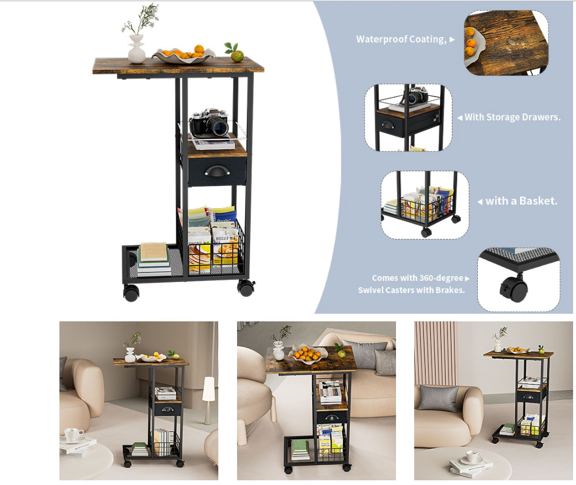 C Shaped End for Couch and Bed, Small Spaces, Side Tables for Living Room, Rustic Snack Table – 19.7”L x 11.8”W x 28”H Create space for work notes, snacks or a comforting meal or simply to keep your coffee cup close at hand. The c table from is designed with space saving in mind for multifunctional use in any room of your home. Whether you need to work or relax, you can rely on this stylish and functional C-shaped side table. With 360°rotating wheels easy to move around. Designed to have 3 layer storage space to put your item.The bottom layer have the metal mesh fence to prevent your item for falling. It very useful and easy to assemble, so it a must have in your home. Features: Powder coated metal frame Space saving design for use in any room Your Couch Companion Can use as a couch table, a nightstand, a snack side table, a coffee stand or a computer desk Easy to Assemble Strong steel tube & Quality manufactured wood 360-Degree Rotating Wheels Specifications: Product Dimensions: 19.7″D x 11.8″W x 28″H Weight: 11.74lb Brand: X-cosrack Table design: End Table Style: Retro Base Type: Legs Package Included: 1x C shaped end table with Basket 1x Manual 1x Accessories