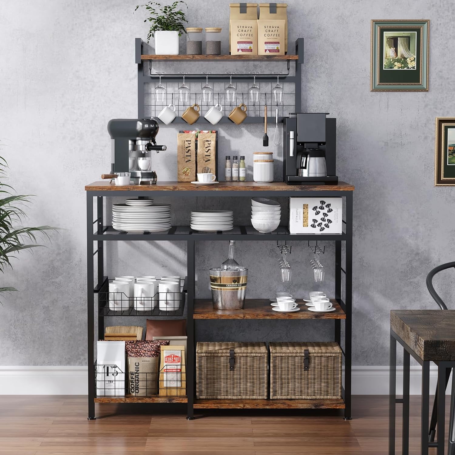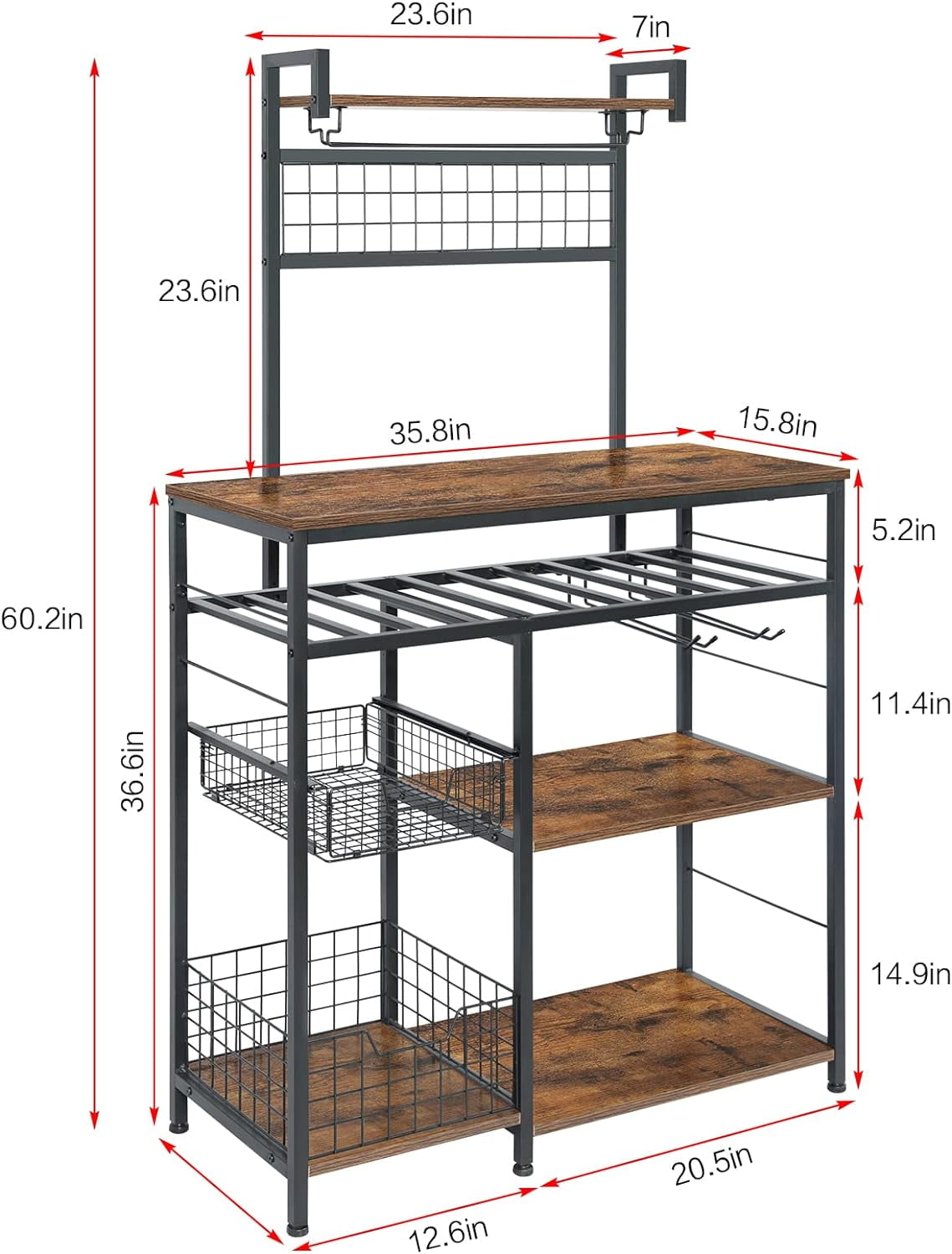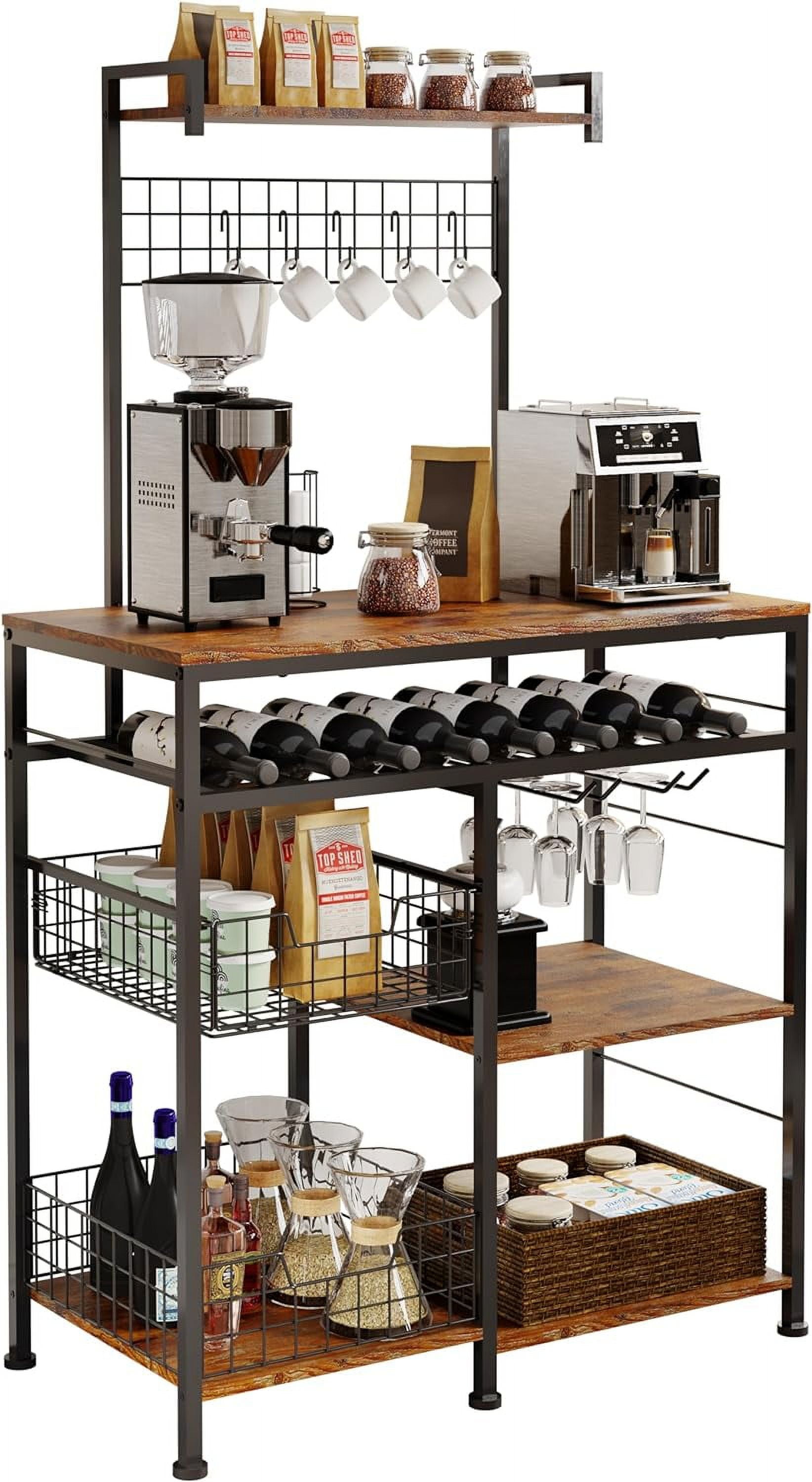 【High-capacity Standalone Farmhouse Coffee Bar Cabinet】 X-Cosrack coffee bar cabinet is equipped with a storage compartment , 10 additional hooks and a removable sliding storage basket that can accommodate wine bottles and two iron racks for hanging wine glasses and storage other miscellaneous items. 【Create the Perfect Coffee Bar】 With a spacious tabletop, sliding storage basket, and open storage compartment, this coffee bar provides ample space to store coffee machines, coffee grinders, tea brewers, water dispensers, and coffee accessories, creating an ideal coffee bar area. The overall dimensions are 60.2 inches high x 35.8 inches long x 15.8 inches wide. It can support a total load capacity of over 100 pounds. 【Premium and Sturdy Bakers Rack】 Constructed with MDF board and metal elements, this coffee bar is easy to clean. It is equipped with adjustable feet to ensure stability on the floor. 【Versatile Coffee Table】 A height of 60 inches is suitable for most household needs and can be used flexibly as a wine rack, microwave stand, or kitchen food storage cabinet. Its rustic brown appearance will add warmth and charm to your kitchen, dining room, or living room. Keep your storage space organized and tidy The top shelf is great for spices, oils, coffee, sugar, tea. [Pretty Easy to Assemble Bar Cabinets for Liquor and Glass] Manual with detailed operation instructions, the hardware and tools included and each accessory is labeled for easy installation. 【Wide Using Shelf】Perfect for kitchen, office, bathroom, study, or garage as bakers rack, microwave stand, coffee bar or plants shelf or even storage cabinet. 【Very Flexible Storage Space】With removable sliding storage basket