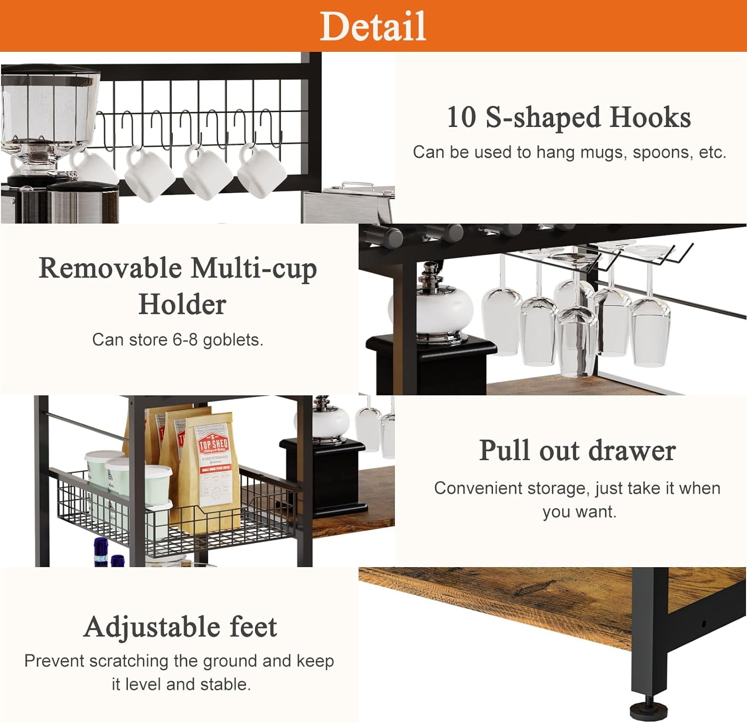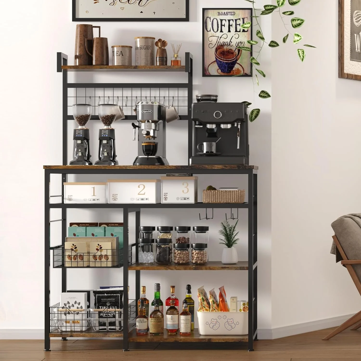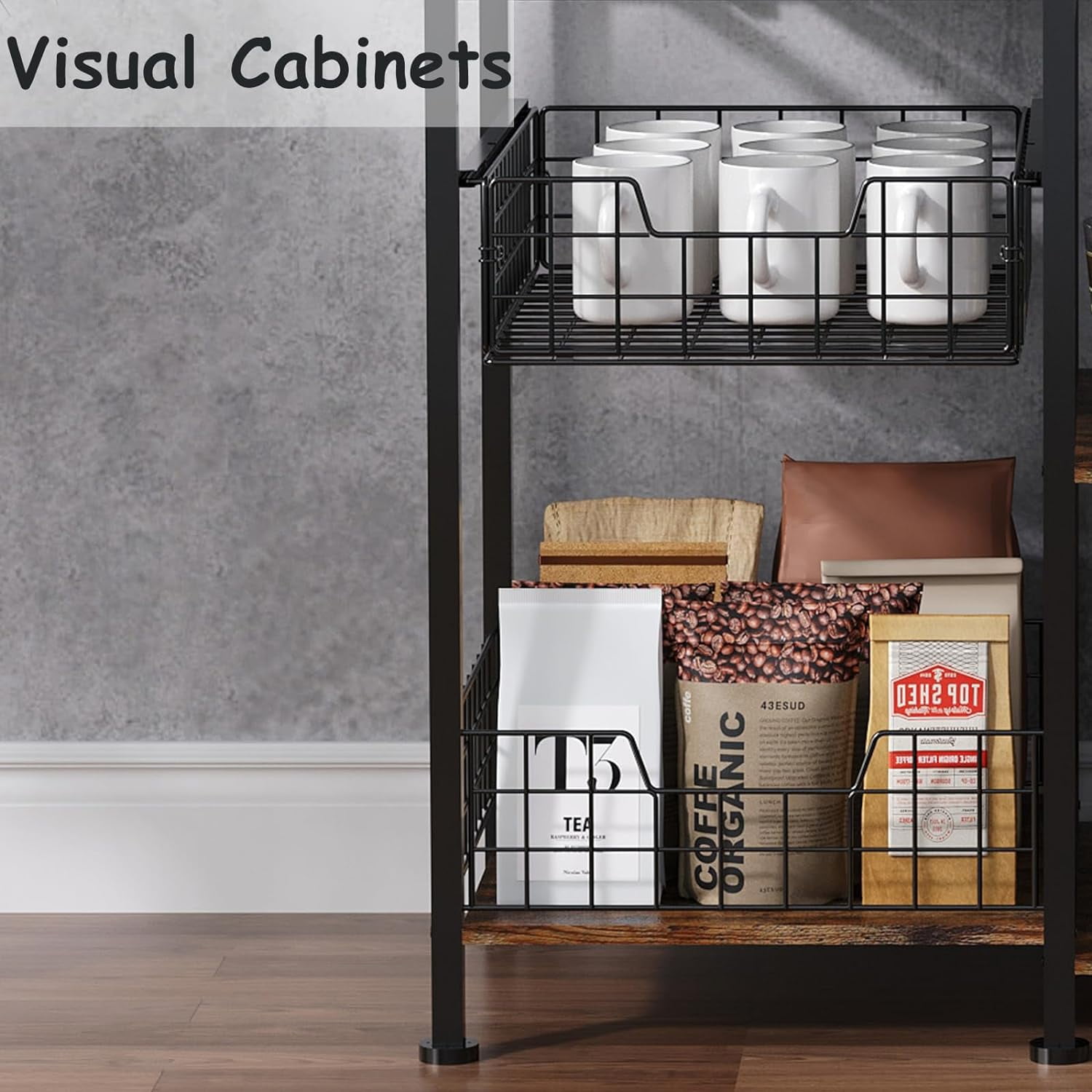 【High-capacity Standalone Farmhouse Coffee Bar Cabinet】 X-Cosrack coffee bar cabinet is equipped with a storage compartment , 10 additional hooks and a removable sliding storage basket that can accommodate wine bottles and two iron racks for hanging wine glasses and storage other miscellaneous items. 【Create the Perfect Coffee Bar】 With a spacious tabletop, sliding storage basket, and open storage compartment, this coffee bar provides ample space to store coffee machines, coffee grinders, tea brewers, water dispensers, and coffee accessories, creating an ideal coffee bar area. The overall dimensions are 60.2 inches high x 35.8 inches long x 15.8 inches wide. It can support a total load capacity of over 100 pounds. 【Premium and Sturdy Bakers Rack】 Constructed with MDF board and metal elements, this coffee bar is easy to clean. It is equipped with adjustable feet to ensure stability on the floor. 【Versatile Coffee Table】 A height of 60 inches is suitable for most household needs and can be used flexibly as a wine rack, microwave stand, or kitchen food storage cabinet. Its rustic brown appearance will add warmth and charm to your kitchen, dining room, or living room. Keep your storage space organized and tidy The top shelf is great for spices, oils, coffee, sugar, tea. [Pretty Easy to Assemble Bar Cabinets for Liquor and Glass] Manual with detailed operation instructions, the hardware and tools included and each accessory is labeled for easy installation. 【Wide Using Shelf】Perfect for kitchen, office, bathroom, study, or garage as bakers rack, microwave stand, coffee bar or plants shelf or even storage cabinet. 【Very Flexible Storage Space】With removable sliding storage basket