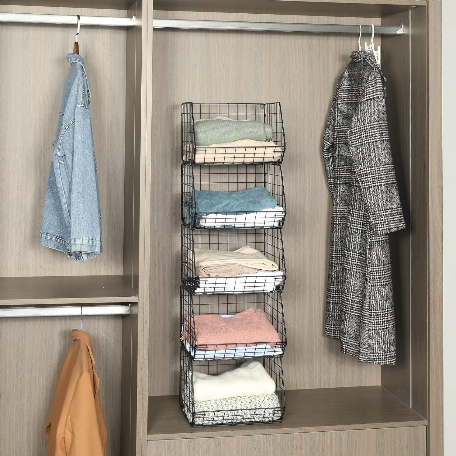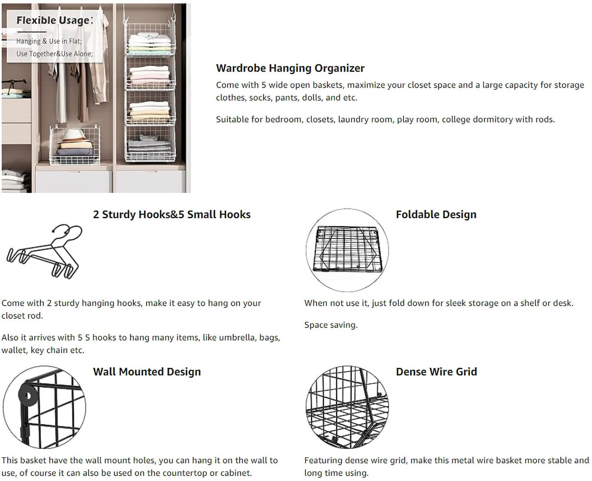 Suitable for bedroom, closets, laundry room, play room, college dormitory with rods. Wardrobe Hanging Organizer: Come with 5 wide open baskets, maximize your closet space and a large capacity for storage clothes, socks, pants, dolls, and etc. Come with 2 sturdy hanging hooks, make it easy to hang on your closet rod. Featuring dense wire grid, make this metal wire basket more stable and long time using. Wall Mounted Design 5 in 1 or Use Alone: X-cosrack closet hanging organizer is the layered design, used alone or stacked according to your own need and idea. And you can screw all the five baskets together and hang them as a unit on the closet rod to store clothes, hats, sweaters, jeans, shirts, shoes, purses and other accessories. Also, you can hang 3 baskets on the wall, and place 2 on the shelf. You can DIY the using methods. Foldable Hanging Shelves with 5 S Hooks: Foldable design, when not use it, just fold down for sleek storage on a shelf or desk. Come with 5 S hooks, you can use hooks to hang key chains, wallets etc. according to your needs. Dimension&Care: Each set contains 5 metal wire baskets, 4 large hanging sturdy hooks, 5 small S hooks and installation hardware. To clean, wipe with a damp cloth and towel dry. Patent Number: US D948,899S Wall-mounted&Cabinet&Hanging Storage: Come with 4 sturdy large hanging hooks, you can use them to hang the basket on the closet rod or garment rod. Optional wall mounted design, easily mount to the wall with included hardware. Moreover, you can use it in flat on a surface, to store items anywhere like dorms, bathrooms, bedrooms, closets, under the bed, in the garage or in the pantry. Space Save: The hanging closet organizer allows for easy hanging with cubby spaces as well as side pockets for smaller items that are often hard to find. It makes organizing so easy but does not take up much space at the same time.