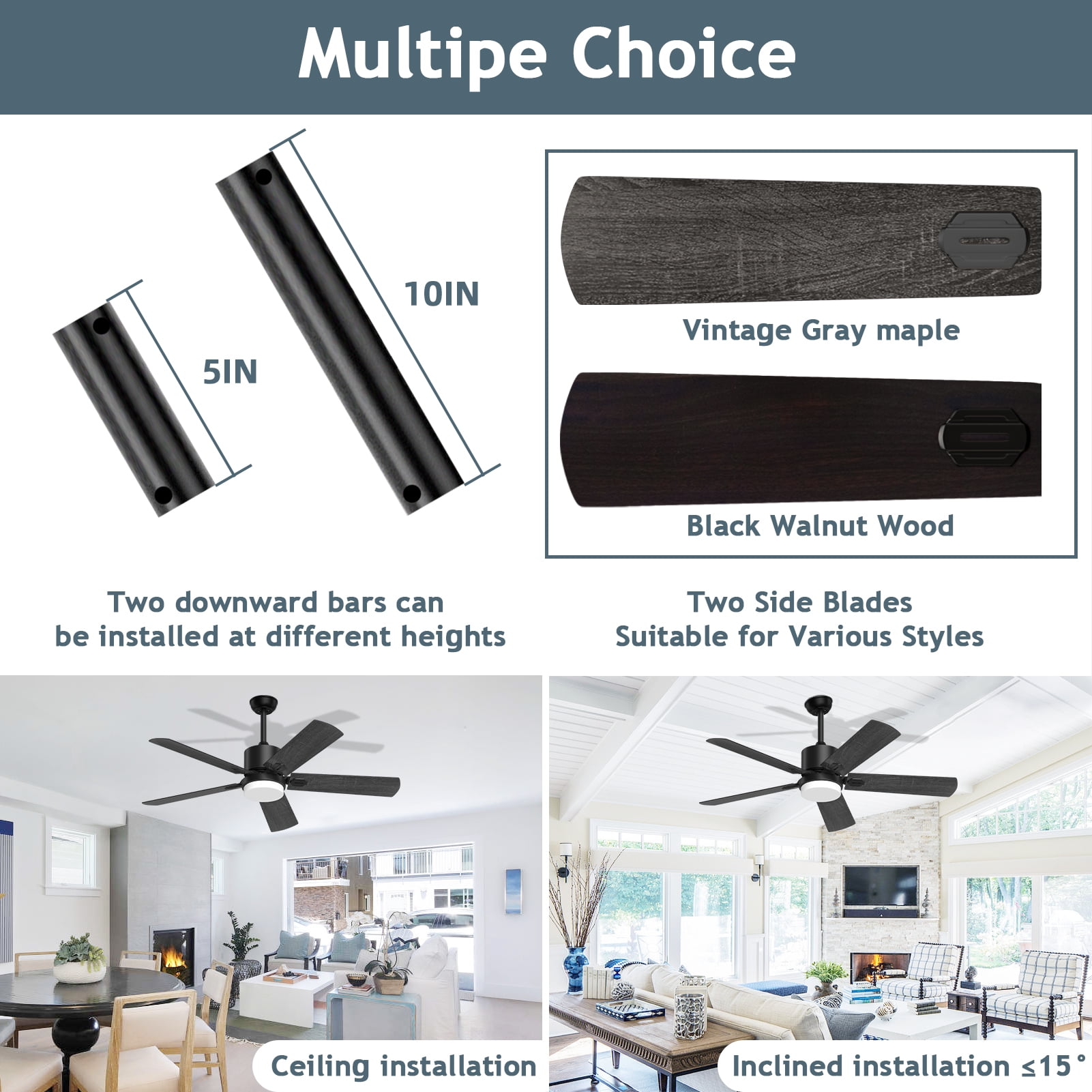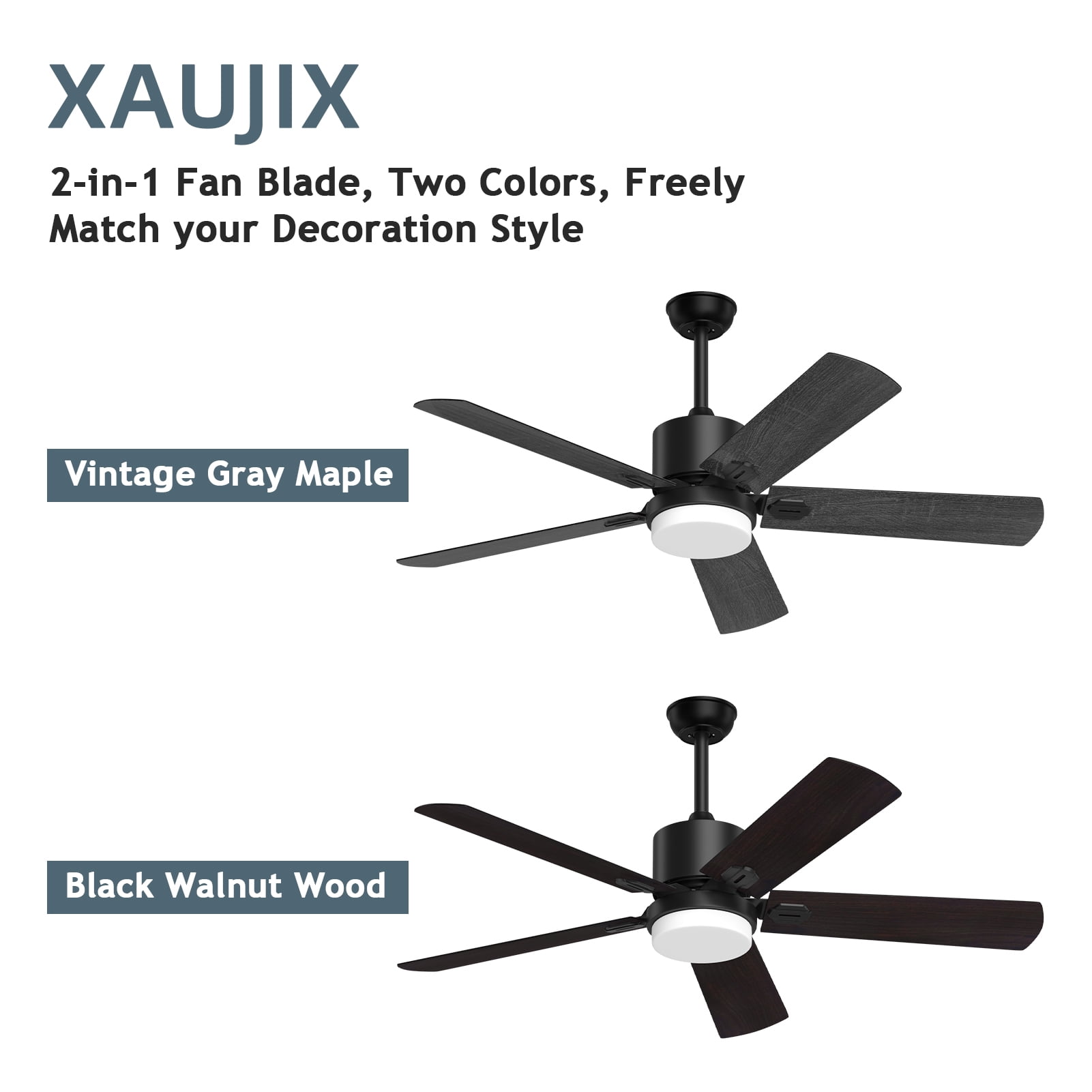 Modern ceiling fan: A 52 inch ceiling fan with light with 5 fan blades and dual finishes, designed with a black DC motor, suitable for use in bedrooms, living rooms, farmhouses, and garages. Ceiling fan with light: The motor adopts DC, which is more energy-efficient than AC DC, and saves energy. The noise level is 35 decibels, with a long service life. The modern ceiling fan with light has reversible reverse function in summer and winter, which can used all year round. Multi function selection? Ceiling fan with remote control with 6-wind speeds, 1/2/4 hour timing setting, 15W LED with three color adjustable lumen brightness including 3000k (warm light), 4500k (white light), and 6000k (cold white light), and the light has memory function and can time for memory. Easy to install: The farmhouse ceiling fan with light with two lower rods (5 ” and 10 ”)can form an angle of 0-15 degrees. They have a moisture-proof rating and should not install in direct sunlight or rainwater. Please read the installation video and instructions during the installation process. Warranty service: The XAUJIX brand provides 2 brackets with worry free warranty, supports 24-hour technical service, and provides a 90 day warranty. If you encounter any problems during installation and use, you can contact us at any time. Product Specification -Fan Blades: 5 double-sided solid wood blades – choice of Vintage Gray maple or Black Walnut Wood?With moisture-proof grade? -Wind Speed: 1-6 speed -Motor: DC geversible motor -Color Temperature: 3000K-4000K-6500K -Light Bulb: led light bulb(15W) -Timing Function:1/2/4h