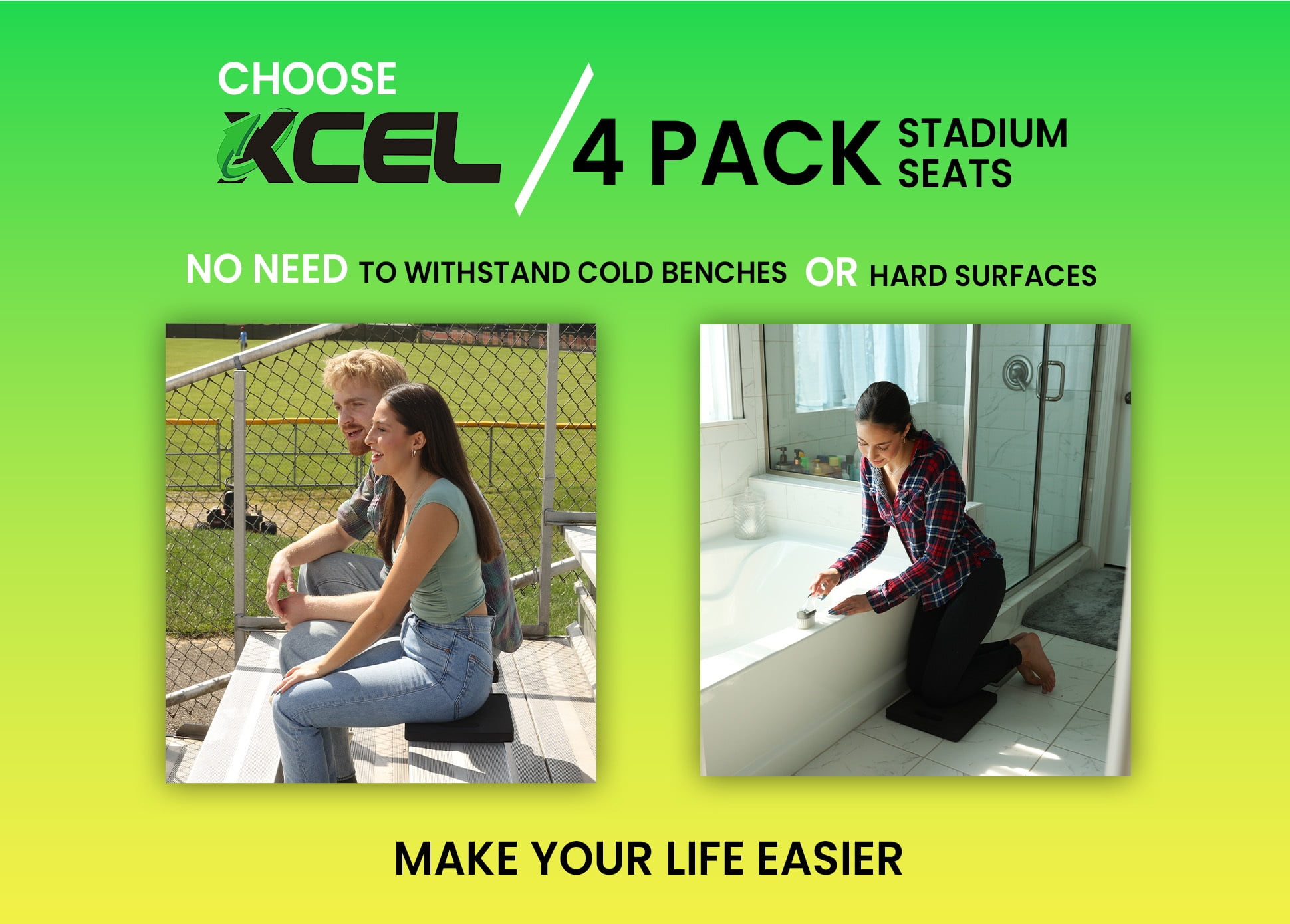 XCEL Portable Stadium Seat Pad Cushions 4 Pack – Foam Rubber Bleacher Cushion Seat Pads for Spectating Sports, Festivals, Outdoor Seating, Yoga – Water Resistant – 14 x 12 x 1 inch Thick – USA Made