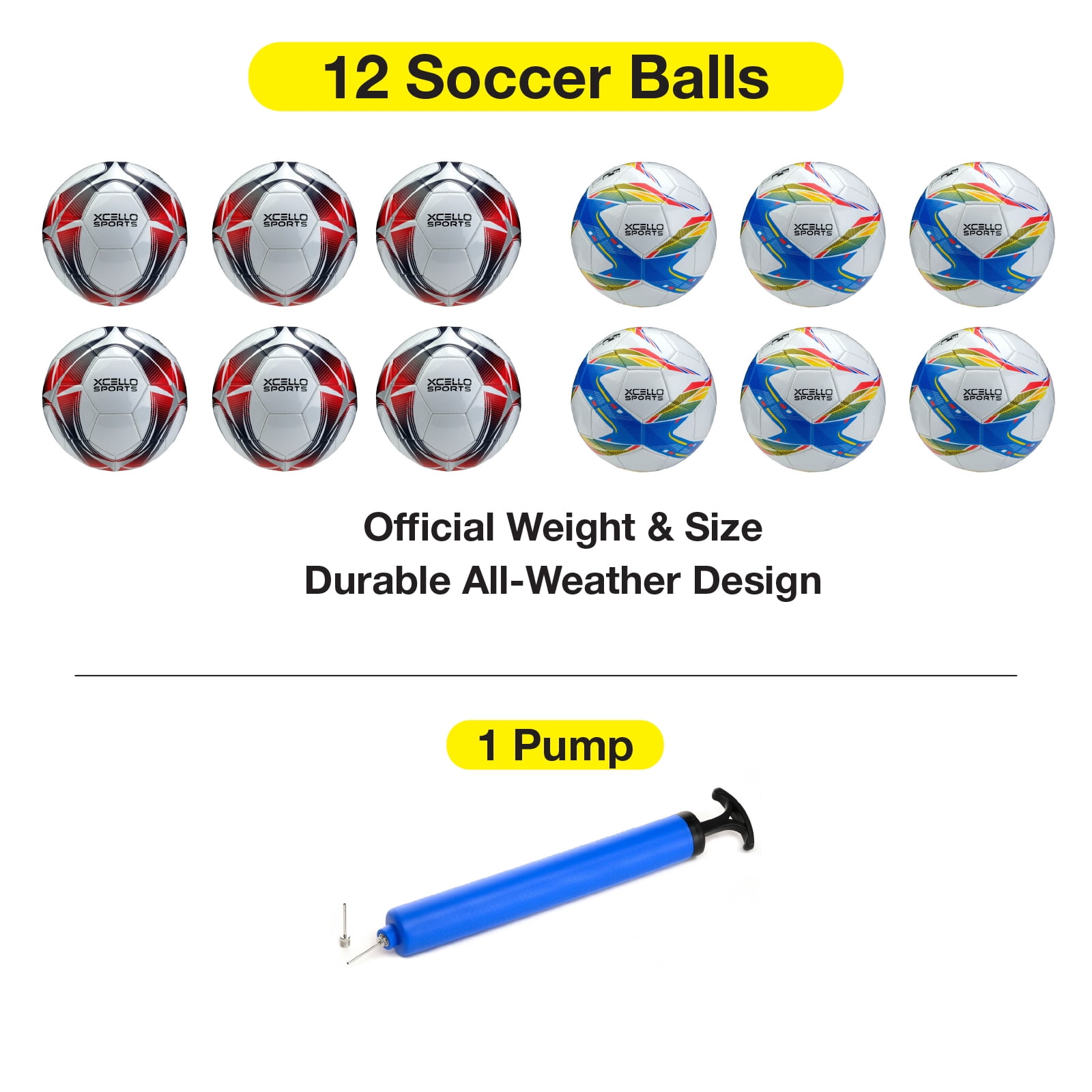 Introducing the Xcello Sport Soccer Balls Size 3, a top choice for Kids athletes and soccer enthusiasts. This pack includes 12 quality soccer balls designed with vibrant and fun graphics that appeal to players of all ages. Our size 3 balls are suitable for Kids soccer ball players, providing the ideal balance and weight for skill development and competitive play. These sports balls are crafted from durable materials, ensuring they withstand rigorous practice sessions and intense games. The bright and colorful designs make them easy to spot on the field, adding fun to training and matches. Xcello soccer balls deliver reliable performance for backyard play, organized practice, or competitive games. Included in this pack is a handy soccer ball pump, ensuring your balls remain properly inflated for optimal play. The pump is easy to use and helps maintain the perfect pressure, so you’re always ready for action. These Small soccer balls also make excellent soccer gifts for Kids players, coaches, and enthusiasts. Ideal for birthdays, holidays, or any special occasion, they bring joy and excitement to the sport. With the Xcello sport soccer balls, you get quality, durability, and fun in every kick.