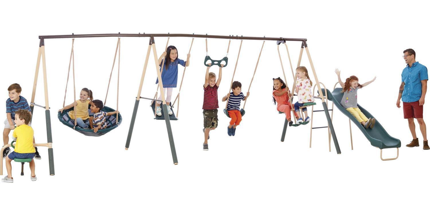 When it comes to entertaining kids, they need variety. Keep your kiddos playing for hours in the comfort of your backyard with the XDP Recreation Deerfield Outdoor Playground. This metal swing set has a non-slip swing and a Fun-Glider for 2. The playset also features a 6-foot plastic slide and a metal trapeze swing. There is a Stand N Swing, a see-saw, and a disc swing for more fun. This playset can fit up to 10 kids simultaneously, so your little ones can invite their friends. The swing set holds up to 1000 pounds. Whether your child likes swinging or sliding, this playset has got you covered. Complete your backyard with this Children’s Deerfield Swing Set from XDP Recreation.