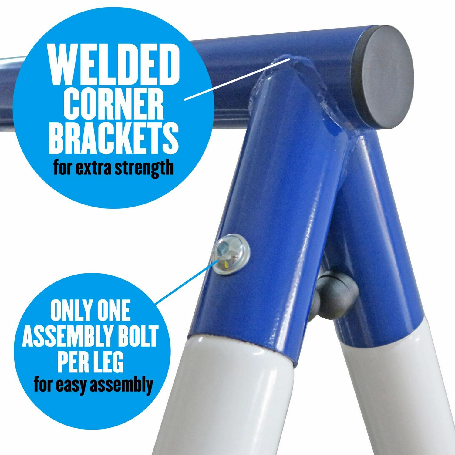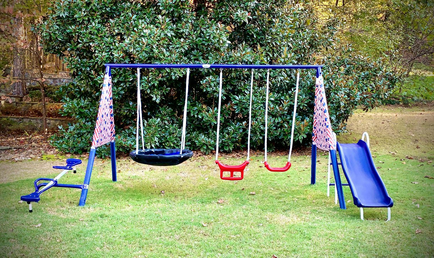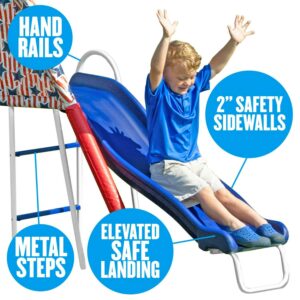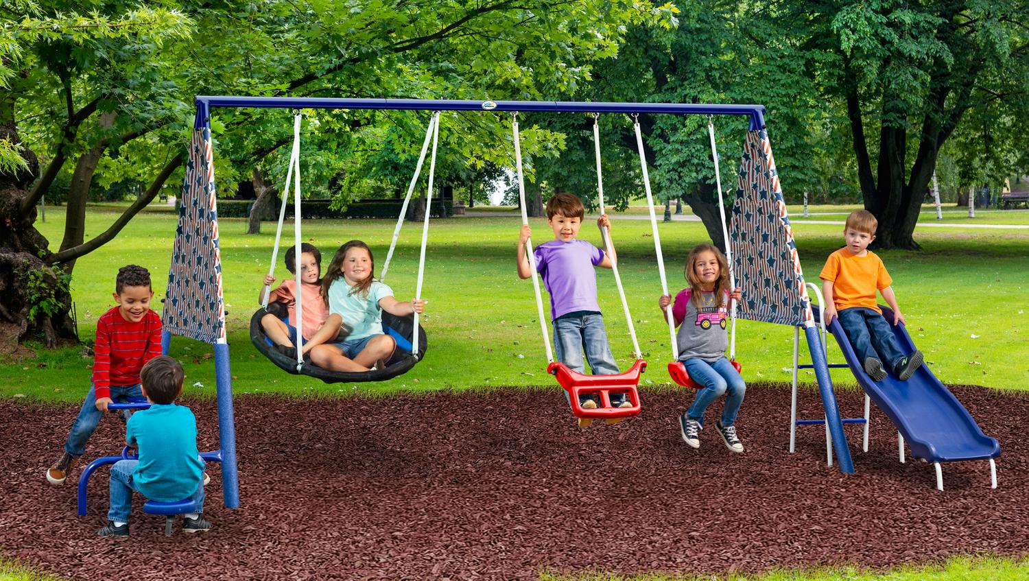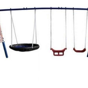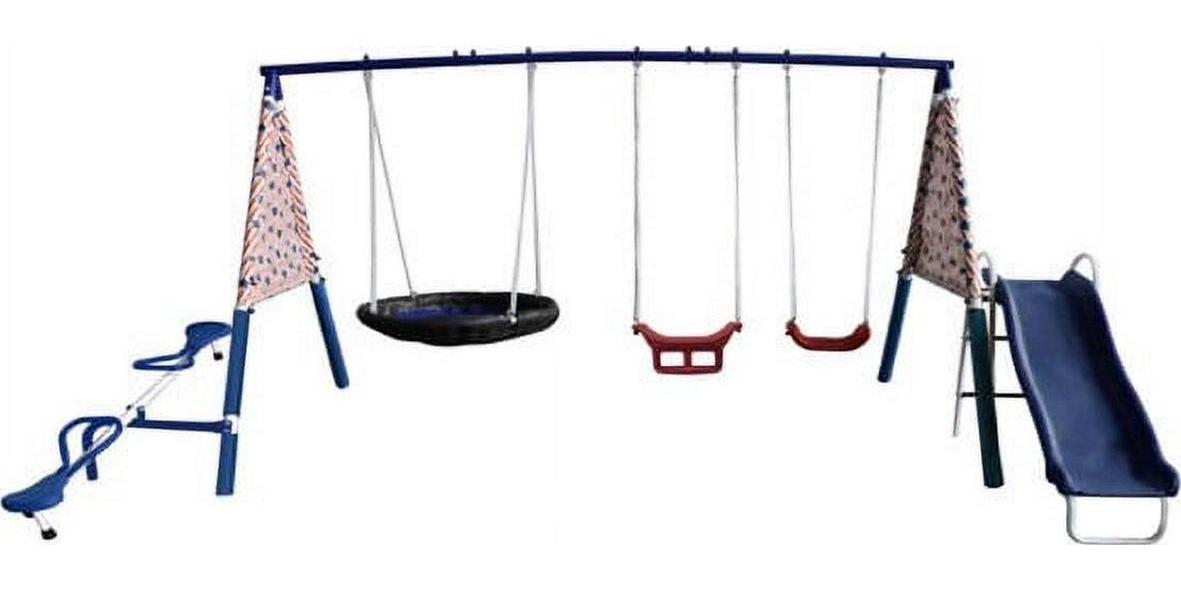 XDP Recreations “Freedom FUN” Metal A Frame Swing Set allows for FUN with a Patriotic Flavor. Red, White, and Blue Frame Colors. Activities include a See-Saw for 2, Super Disc Saucer Swing, 1 Adjustable Height Swing with vinyl-covered chains to protect hands, 1 Stand-N-Swing with vinyl-covered chains to protect hands, and Wave Slide. PATRIOTIC Wind Vents and Blue Foam Leg Covers for Safety. Up to 7 kids can enjoy playing in Patriotic Spirit. Maximum weight 700 lbs.