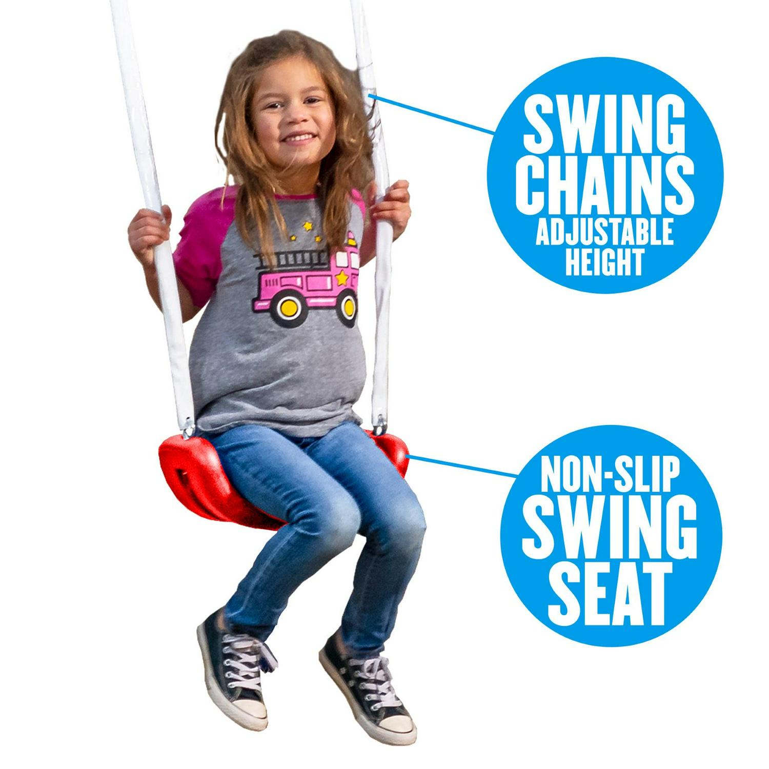– Blow Molded Adjustable Height Swing with vinyl-covered chains to protect hands.