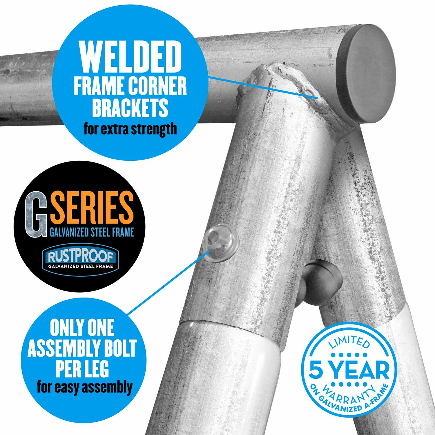 – Six Leg A-Frame made with 2″ Diameter Galvanized Welded Steel Tubing, Powder Coat Painted Blue and White.