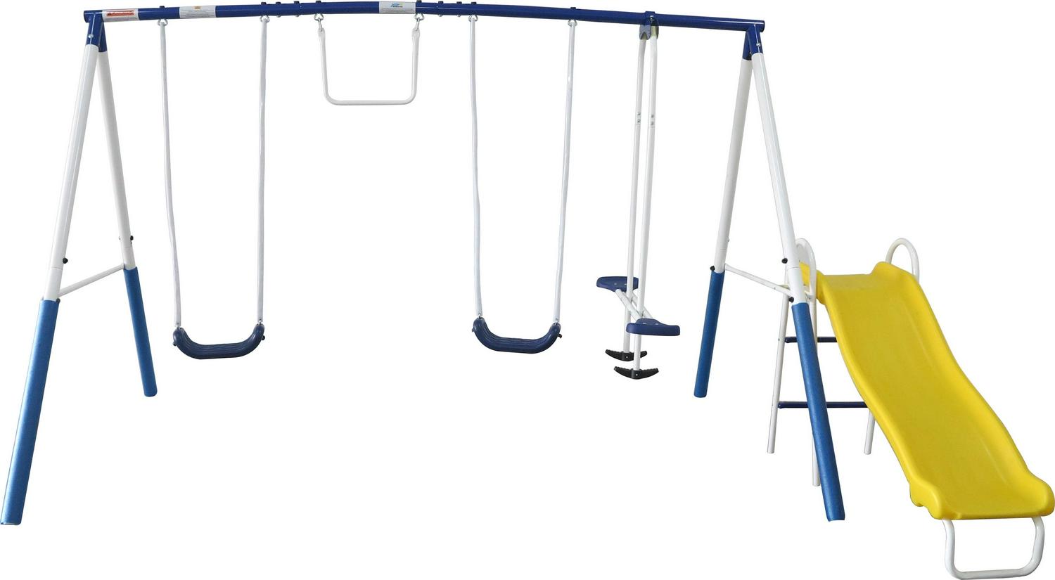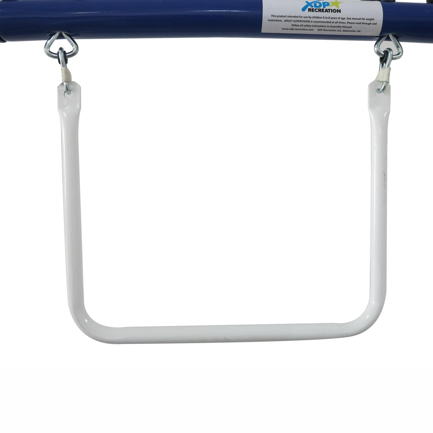 XDP Recreation’s Play All Day Swing Set. The kids can swing, slide, and glide all day. 2-inch welded steel tubing powder-coated blue and white makes up this swing frame. 2 blow molded bench swing seats with adjustable safe-touch chains, a Trapeze swing for your acrobats, a Fun Glider for 2, and a Wave Slide round out the fun. The kids will never want to come in from the yard. Up to 6 kids can play safely and up to 600 lbs. maximum. Safety is always first with XDP Recreation; all our products meet or exceed ASTM testing.