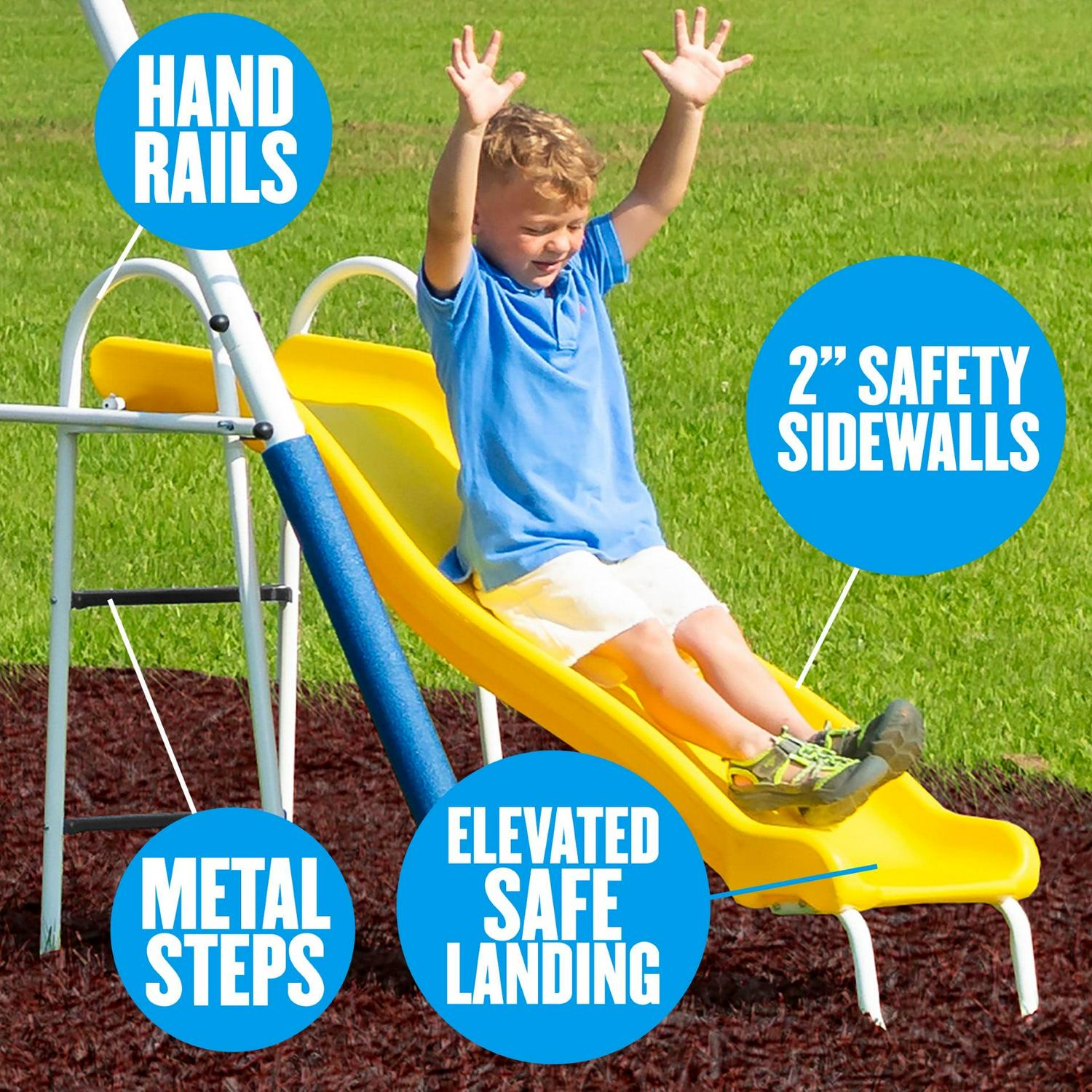 – 5 Blow Molded durable plastic Wave Slide with metal steps, handrails, 2 edges for safe gliding/sliding, and Safe Landing Zone