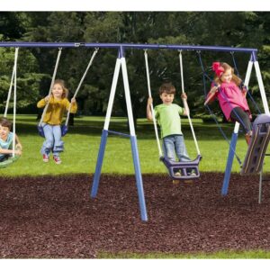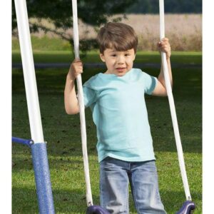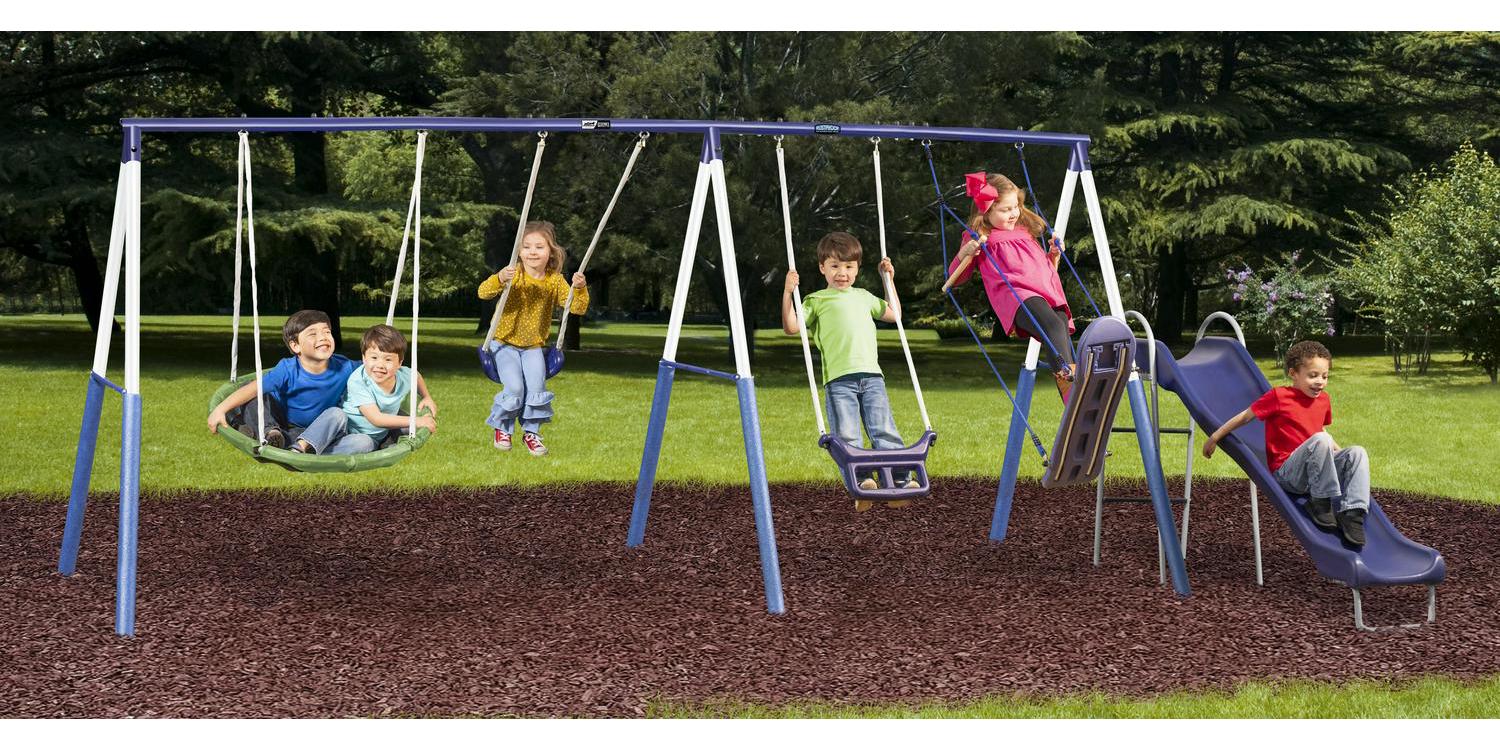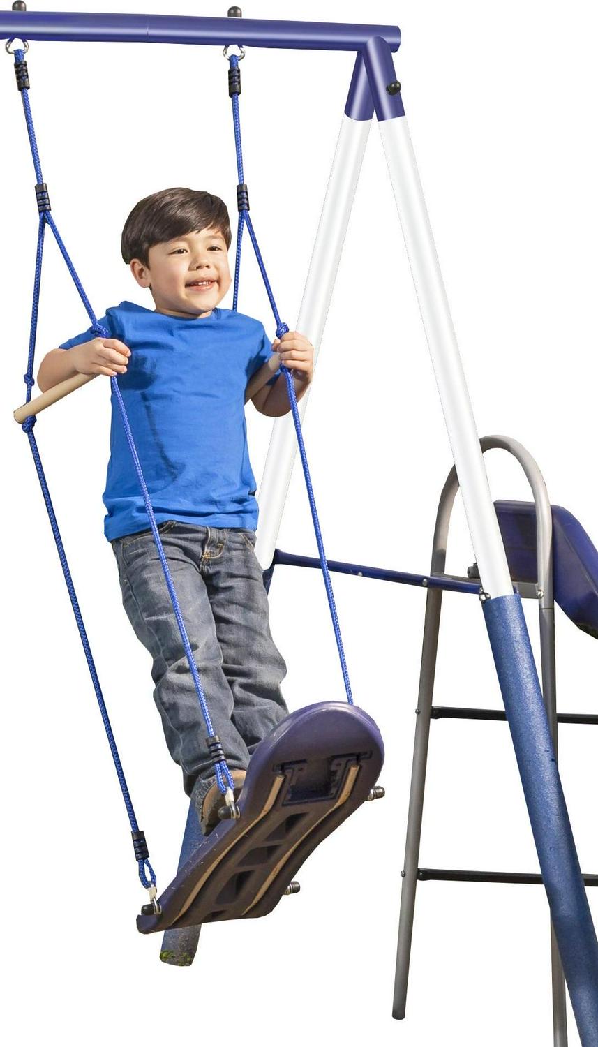 For endless summer fun, the XDP Recreation Surf N Swing Play Set lets your child slide, swing, and surf to their heart’s content. The steel frame features 6 durable legs padded with blue foam to keep kids safe while running, jumping, and climbing on this swing set. Thanks to 5 play stations, your little one will never run out of activities to explore. Watch as your youngster scoots down the 6-foot slide or pushes their sibling on the swing. The Stand-R-Swing with built-in foot holes allows your toddler to rock while sitting or standing. Place 2 children side-by-side on the Super Disc Saucer Swing for endless giggles and adorable photos. The more adventurous surfer can catch imaginary waves and feel the wind whipping through their hair on the Surf N Swing Board. With a 6-person, 600-pound capacity (100-pound max per child), your child can invite neighbors and friends to enjoy endless backyard adventures. For effortless assembly, follow along with the included directions and use your provided hardware.