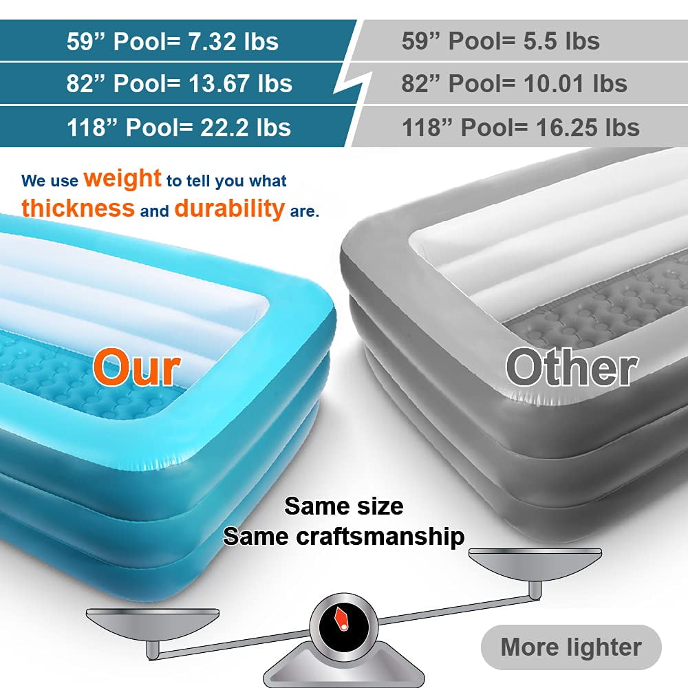 Summer Entertainment For Kids And Adults: The kiddie pool is inflated to about 82 inches long, 57 inches wide, and 25 inches high. It can accommodate 2 adults or 4-6 kids. It is a great choice for children to play with the inflatable pool in summer. The inflatable kiddie pool can be used not only as a swimming pool, but also as a paddling pool, game pool, paintable pool, fish pool, kids pool, family swimming pool, or ball pit pool. Safe & Soft Inflatable Floor: Kids swimming pool is made of high-quality and standard-compliant vinyl materials, and the thickness is 125% of the same size pool to ensure safety. The double-layer and inflatable bottom are not easy to leak. It provides the child with a super soft and comfortable feeling and increases the protection of the child when playing. Fast Valve Inflation and Deflation: With a fast valve, you can fill the kiddie pool with air in a matter of minutes. The inflatable kids pool is quickly deflated with a double lock valve. Easy to Drain and Fast: Built-in drainage pipe, and can be connected with conventional hoses to drain water to farther places. After enjoying the blow-up pool, simply open the drain plug to easily drain the water from this swimming pool for quick and easy access. Easy to store and carry, it is a must-have for summer backyard fun. The swimming pool for kids is composed of 3 independent air chambers to help the kiddie pool prevent air leakage and bear extra weight. You can also choose 1-3 layers of independent inflation to adjust the height of the swimming pool. We use weight to tell you what thickness and durability are. About Size Error: Since the inflatable saturation of the inflatable pool is different each time, there may be errors in each measurement.