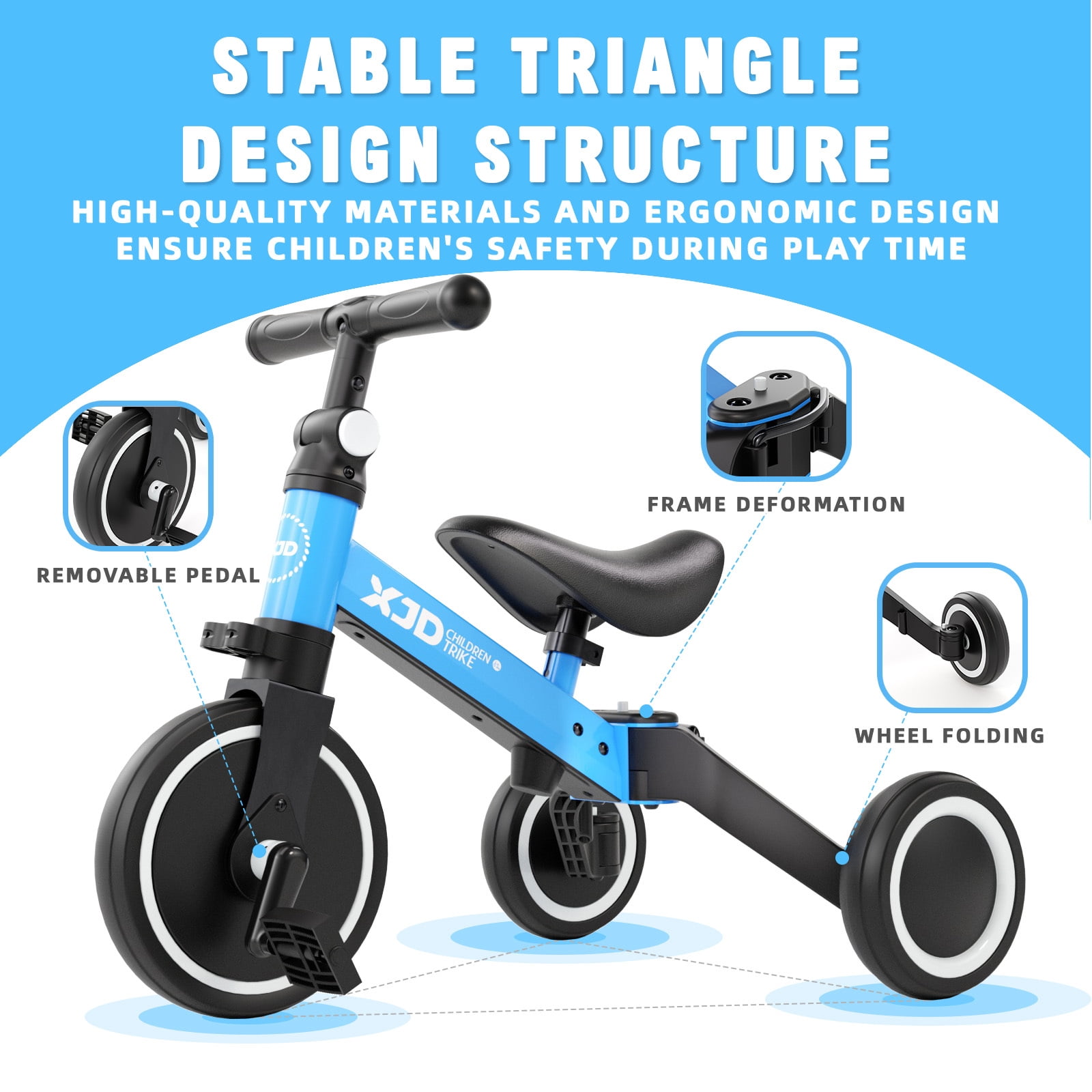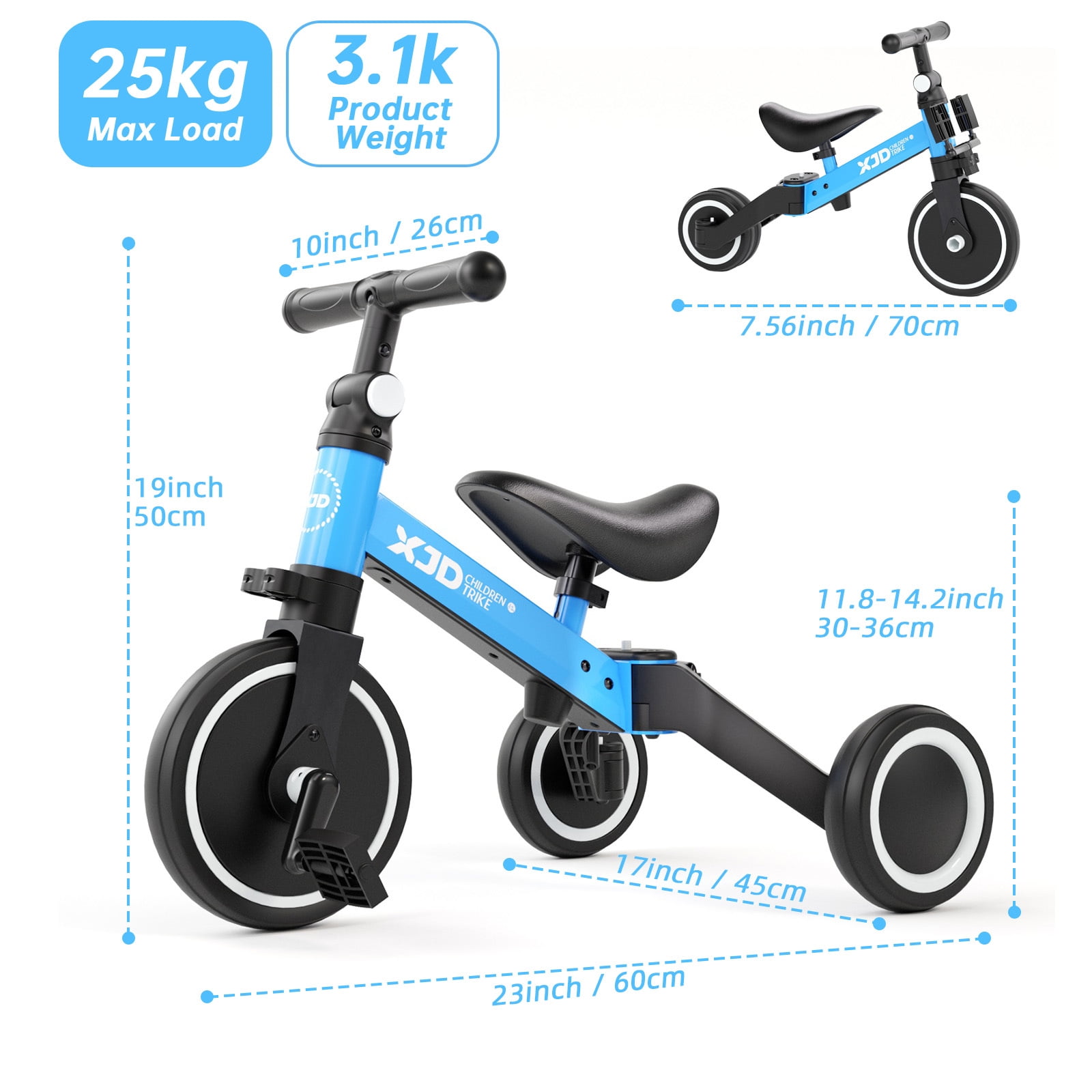 Why XJD 5 In 1 Tricycle? 10 Month – 3 years old. We recommend 10 Month to 4 Years Old baby to use three-wheel mode,Compare to normal baby tricycle, XJD baby tricycle is specially designed to minimize the danger of riding. Your baby will be very active and love cycling at very early age. Leg strength, balance, self-confidence and most important thing: Happiness! These are what XJD baby tricycle offers, It offers 3 ways to ride. Two-wheel Balance Bike Mode Recommend a younger baby to use the three-wheel mode,with baby grow 1-4 years old, the rear wheel folded and the tricycle is converted into a two-wheeled balance bike. Pedal Tricycle Mode Install the pedals, and baby drives the tricycle forward with his feet. Train baby’s learn to steer ability Three-wheel Sliding Mode 10 Month to 3 Years Old toddler does’t have a good balance ability, We recommend using the three-wheel sliding mode Feature Material: Carbon Steel frame, Plastic Wheels, PU seat Features: 5 In 1 Baby Ride On & Toddlers Glide & Foldable Tricycle Net Weight: 6.94 lbs Gross Weight: 8.26 lbs Max Load: 55.11lbs Recommend Age: 10 Months – 4 years old Suitable for height from 29” to 37.4” babies Package List: 1x kids trike, 1 x User Manual in English Version