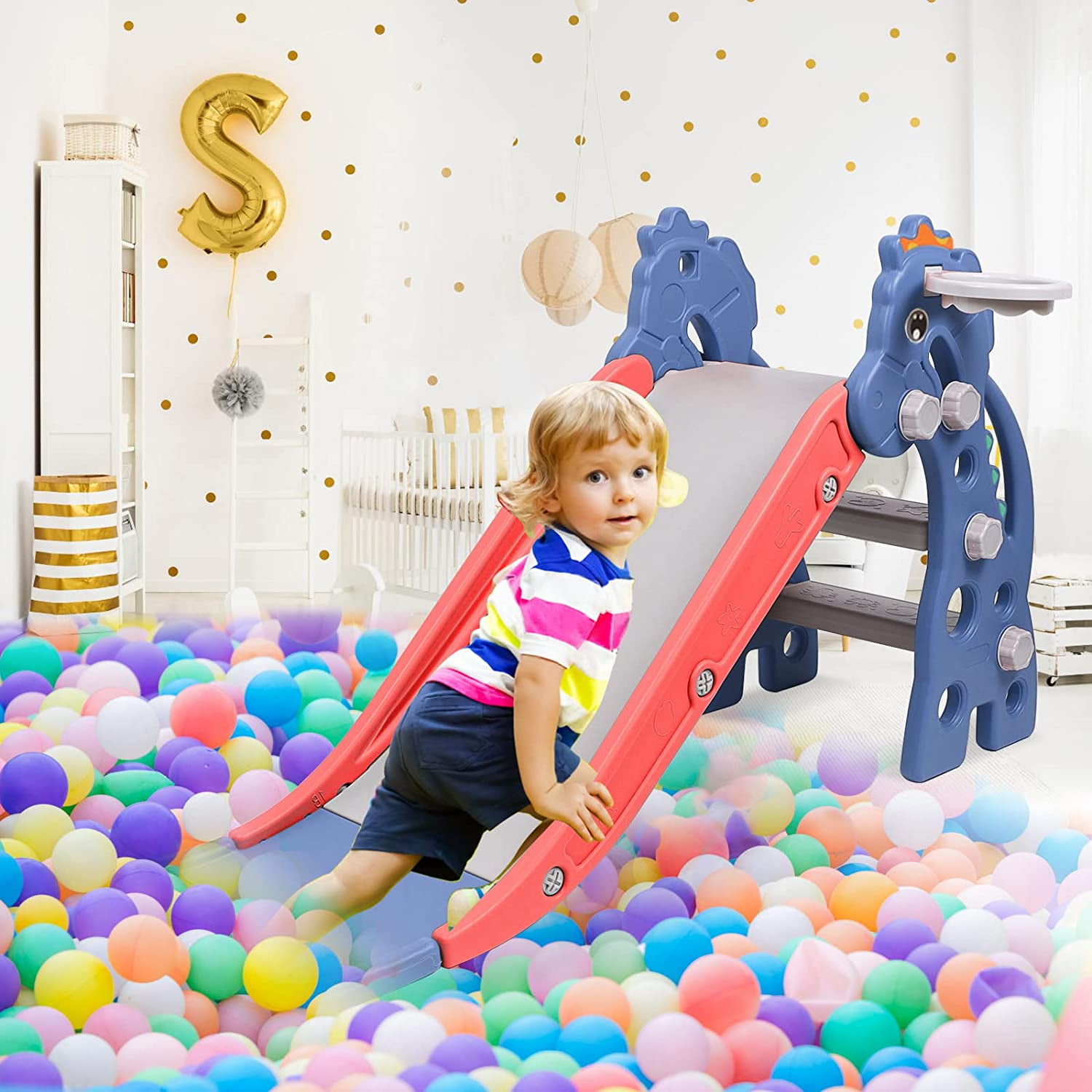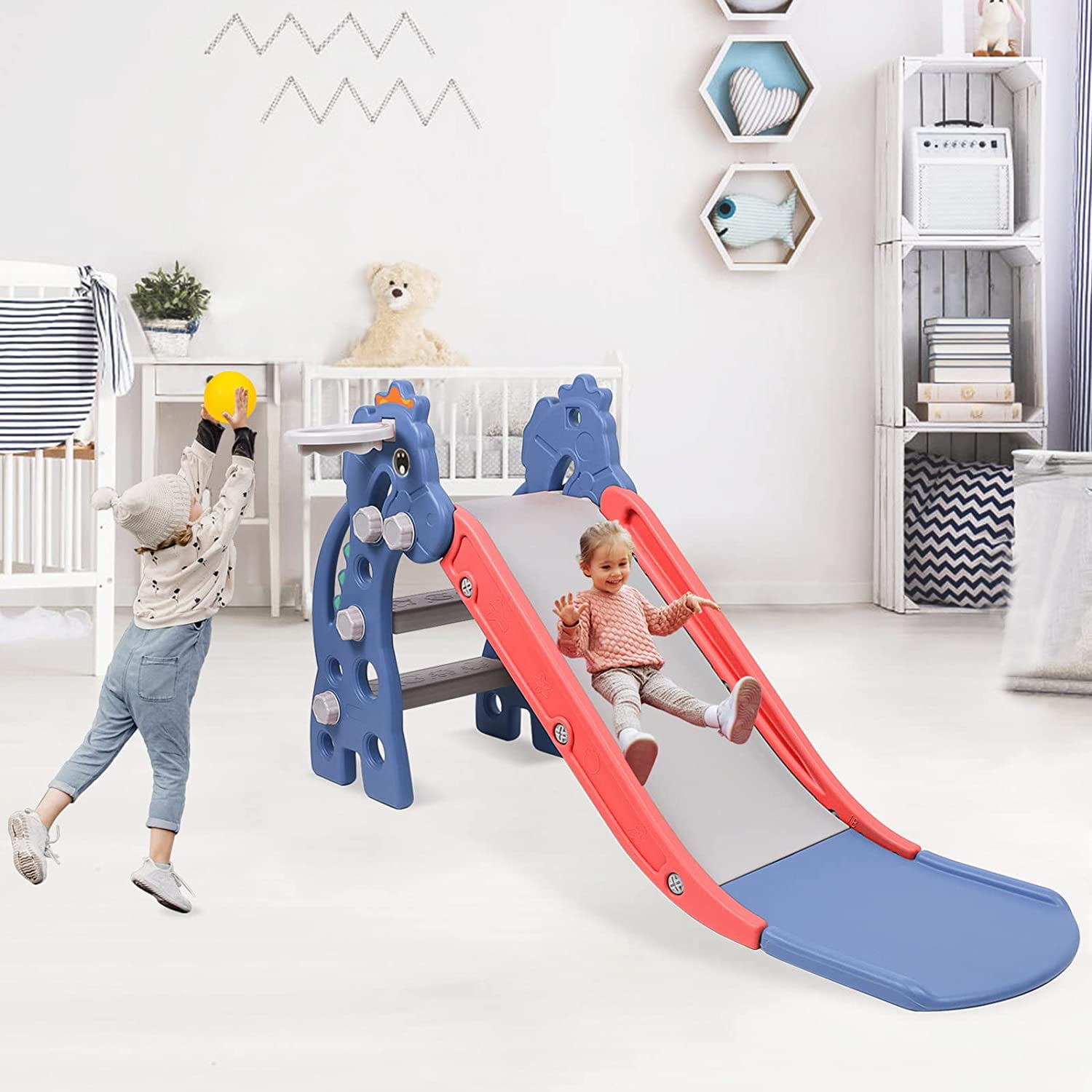 TODDLER SLIDE: XJD 3 in 1 indoor toddler slide is specially designed for children, a triangular structure is formed between the slideway and the slide at the bottom and the ground to ensure the stability and safety of infants on the slide. MULTIFUNCTIONAL SLIDE: Our toddler climbing toys indoor is equipped with a basketball hoop and a small basketball, which can let your baby get full exercise while enjoying the fun of climbing, sliding and shooting, improving their agility and coordination. FOLDABLE DESIGN: XJD foldable slides are light and compact in design, easy to carry or store, easy to move indoors and outdoors, and saving storage space. EASY TO ASSEMBLE: Our slides for kids contains illustrated instructions, which is very easy to assemble and disassemble. You can install it in a few minutes without more tools. Slide length: 49.5”L. Production Overall dimensions: (L x W x H) 51.2″ x 13.8″ x 26.4″ THREE-SEGMENT SLIDE DESIGN: XJD kids slide is divided into acceleration zone, deceleration zone and buffer zone . There is an ultra-long slope at the end, which is skillfully combined with the buffer zone. It is smooth and safe. Children stop in the buffer zone instead of on the floor.