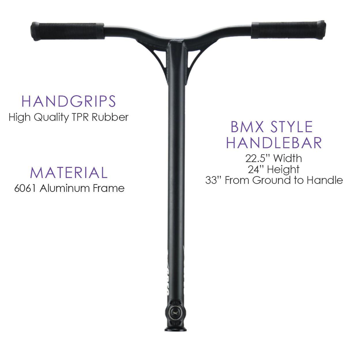 The most advanced model features a tough but light Aluminum deck, smooth & fast aluminum wheels with ABEC-7 bearing, wide BMX style handlebars with 88A high rebounded PU grips and rugged construction that can handle any trick you throw at it. The large wheels with ABEC-7 bearings for a smooth soft ride on even the harshest landings. Thick, oversize handlebars, deck, and head clamp allow for tricks and jumps without breaking a sweat. The scooter measures about 33″ from the ground to the handlebars making it ideal for teens and young adults but suitable for people of all ages. BMX Style handlebar with reinforced design for weight reduction Pro doubles strong anodized aluminum head clamp made from 6061 aluminum. Professional HIC (Hidden Internal Compression) headset system Reinforced anodized aluminum threaded fork. 20.5″ x 4.3″ 6061 Extrusion Aluminum Deck for the ultimate in strength and lightweight. Fender brake for strength and durability.