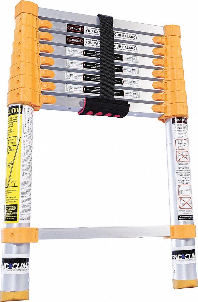 Telescoping Ladder, Extended Ladder Height 8 ft 6 in, ANSI Type 1, Material Aluminum, Adjustable Increments 12 in, Load Capacity 250 lb, Closed Depth 4 3/4 in, Closed Height 30 in, Standards ANSI A14.2-2017, OSHA 29 CFR 1920.23, Bottom Width 18 in, Net Weight 19 lb, Rung/Step Spacing 12 in