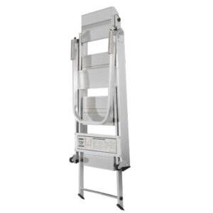Reach the high spaces on the job or in your home with the Xtend+Climb WT4 Special Duty Folding 4-Step Stool. It’s crafted of industrial-grade aluminum that is lightweight yet sturdy. Enhanced stability featuring 8 inch deep steps with non-slip treads. The folding handrail locks the step stool in the open position for easy maneuvering while pulling the step stool on its back wheels. The handrail also gives three points of contact for added safety while climbing. The WT4 stable step stool has a 54 inch closed height, and a weight of 26 pounds, making it easy to store and transport. Available in a 2-step, 3-step, 4-step, and 5-step optionsn-SAFE – ANSI/OSHA certified and meticulously designed to achieve a higher level of safetyn-STORABILITY – Folds compact and can be stored almost anywhere in your home, office, or work siten-PORTABILITY – Ultra lightweight, this sturdy step stool is crafted of lightweight aluminumn-EASY TO USE – Simply lightweight and foldable n-ECO FRIENDLY – Sensible alternative to a heavy and bulky step stool, designed with minimal plastic accents